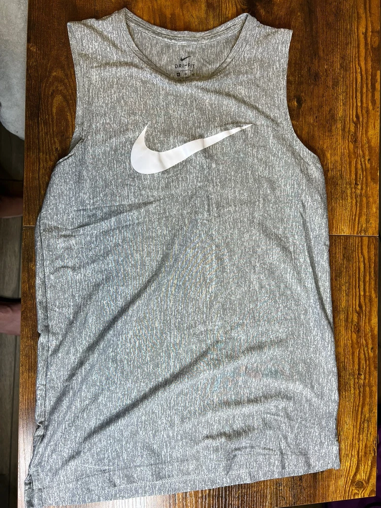 This Nike Dri-Fit Sleeveless Training Muscle Tank Top in size XL is designed for boys. It features a round neck, pullover style, and lightweight, breathable material. The tank top is ideal for summer and spring seasons, suitable for activities like travel, casual wear, and sports such as basketball, football, and running. The Nike logo accents the gray tank, which is machine washable and part of the Nike Dri-FIT product line known for performance and comfort during athletic activities. Perfect for active young athletes looking for a comfortable and stylish top for their training sessions.