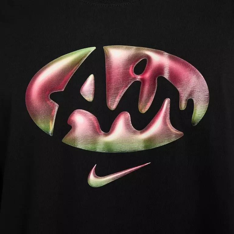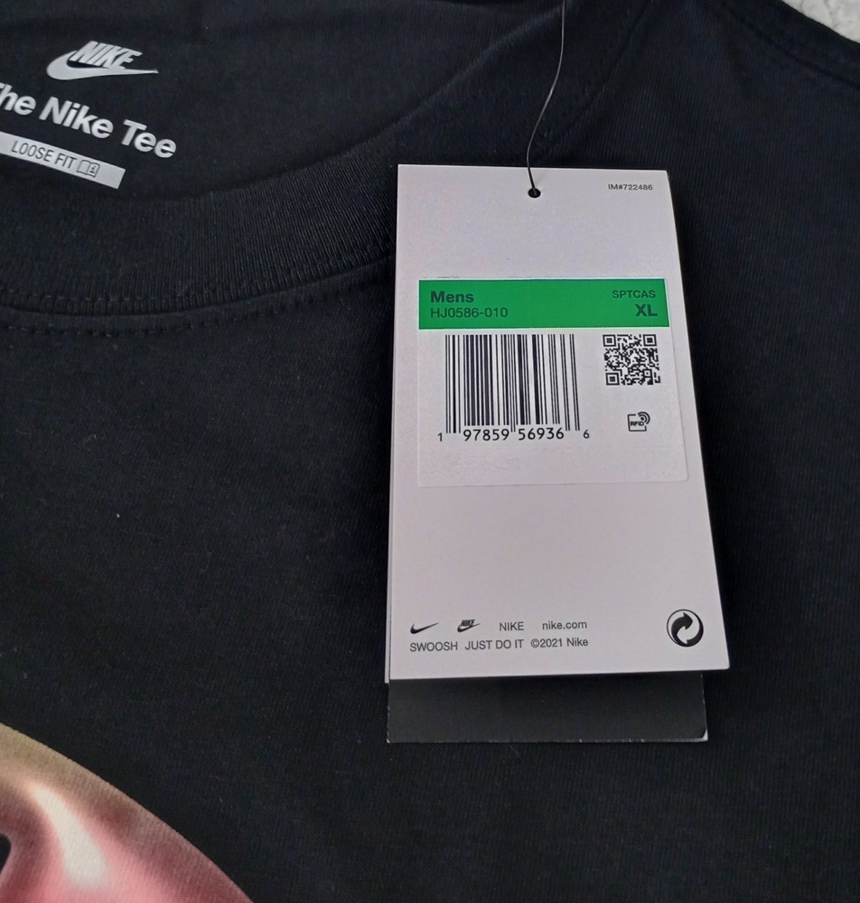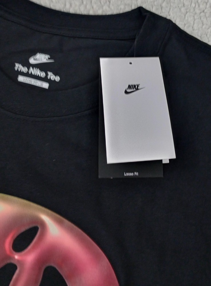 Nike Men's Sportswear M90 Air Max Logo Graphic T-Shirt Black Size XL. Elevate your casual wardrobe with the Nike Men's Sportswear M90 Air Max Graphic T-Shirt. This tee boasts a loose fit with dropped shoulders and longer sleeves for a relaxed, roomy look. The Air Max graphics shift colors from different angles, adding a dynamic touch to its soft midweight cotton fabric and ribbed collar design. Fit & Design: Loose fit Features Air Max graphics that shift colors from different angles Dropped shoulders and longer sleeves provide a roomy and casual look Soft midweight cotton Ribbed collar Additional Details: Brand : Nike Country of Origin : Imported Style : HJ0586 Fabric : 100% cotton