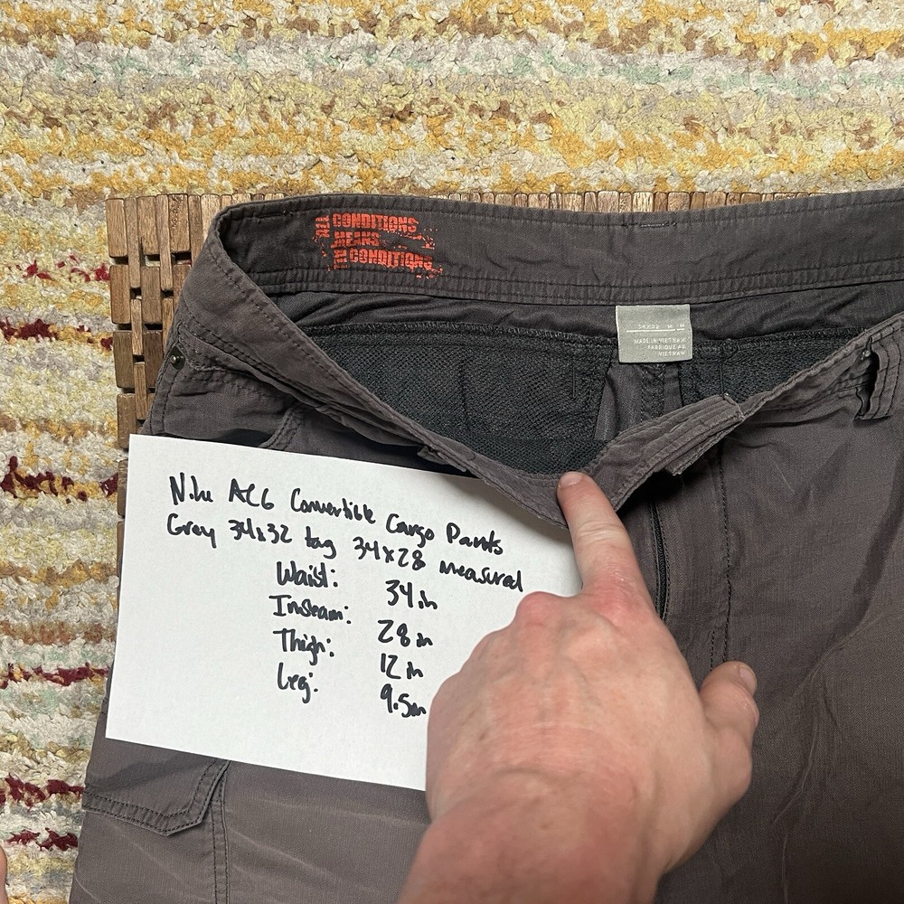 Elevate your style and comfort with these Nike Nikelab ACG Transformer Concertible Cargo Pants. These pants are perfect for any occasion, whether you're going on a hike or just running errands. The gray color and cargo style give them a sleek and modern look, while the zip closure and regular size ensure a comfortable fit. The pants are made for men and have a 28-inch inseam, making them the perfect length for any wearer. They are crafted from high-quality materials, ensuring durability and long-lasting wear. Whether you're a fan of Nike or just looking for a stylish and comfortable pair of pants, these Nike Nikelab ACG Transformer Concertible Cargo Pants are the perfect choice.