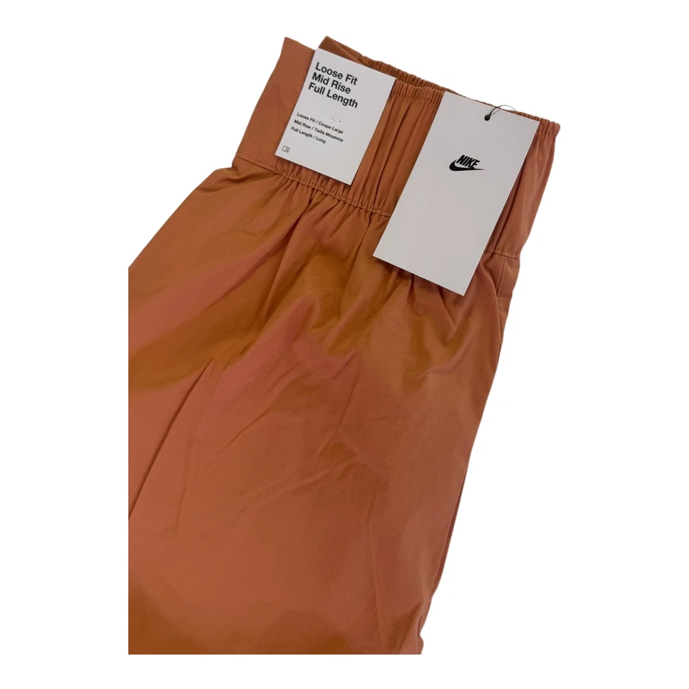 Elevate your activewear collection with these Nike Sportswear Snap Leg Pants in a beautiful peach color. The pants feature a zip front closure, wide-leg style, and a loose fit for maximum comfort during any outdoor or sports activity. The elastic waistband allows for a customized fit, while the pockets provide ample storage for your essentials. These pants are made with a blend of nylon, spandex, and cotton, making them machine washable and easy to maintain. The orange color adds a pop of modern and classic style, while the Nike logo on the front provides a touch of sporty sophistication. Perfect for travel, casual wear, or walking, these pants are a must-have for any women's wardrobe.