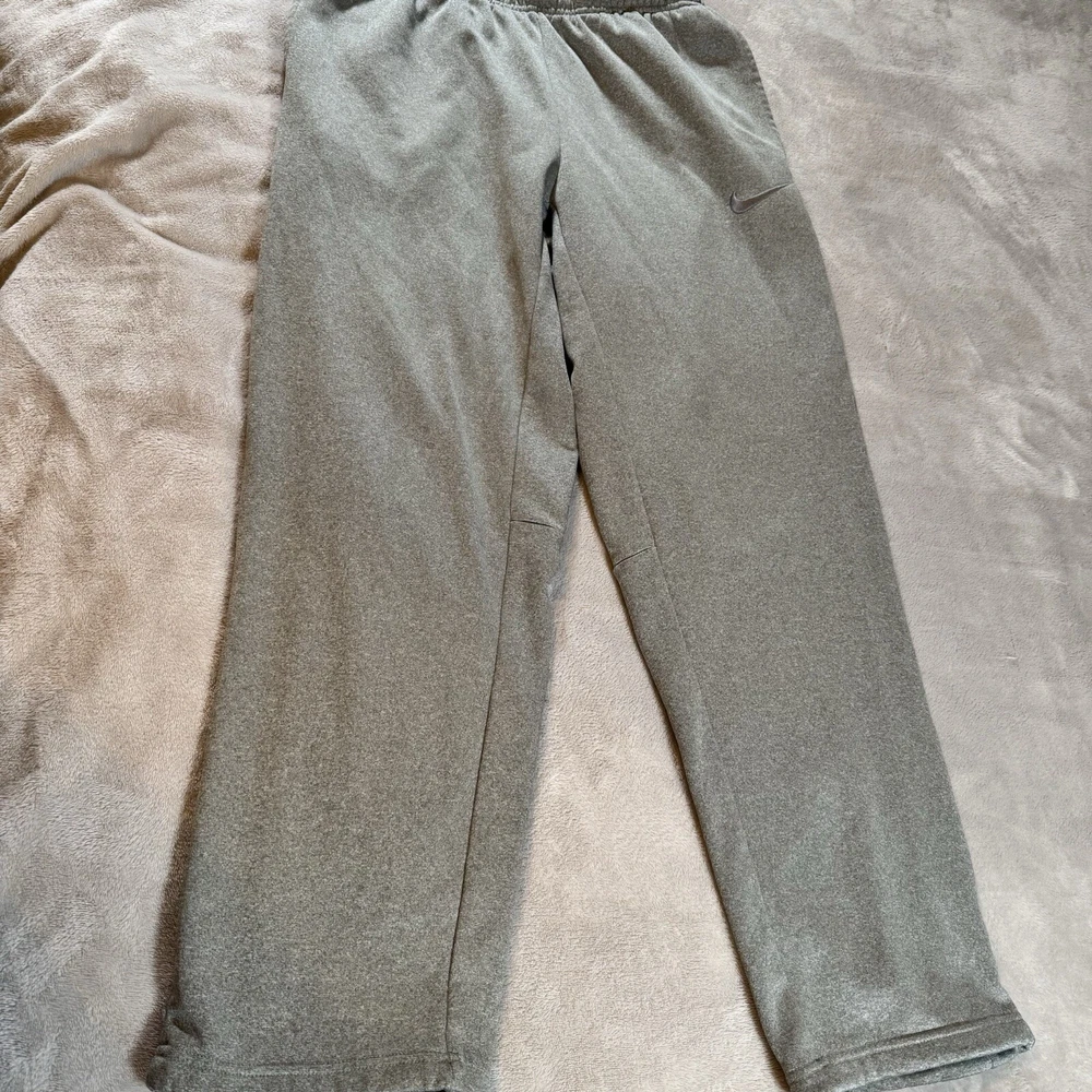 Elevate your activewear game with these Nike Therma-Fit sweatpants. Designed with a drawstring closure and adjustable waist, these pants ensure a comfortable fit for any occasion, whether it's a casual day out or a gym session. The gray fleece fabric with Nike logo accents and solid pattern make these pants a versatile addition to your wardrobe. Featuring pockets and a straight leg style, these pants are perfect for outdoor, athleisure, and sports activities like running, walking, basketball, and school. The Nike Activewear character family and Nike Therma product line add to the brand's reputation for quality and style. Get your hands on these athletic fit pants in size medium today.