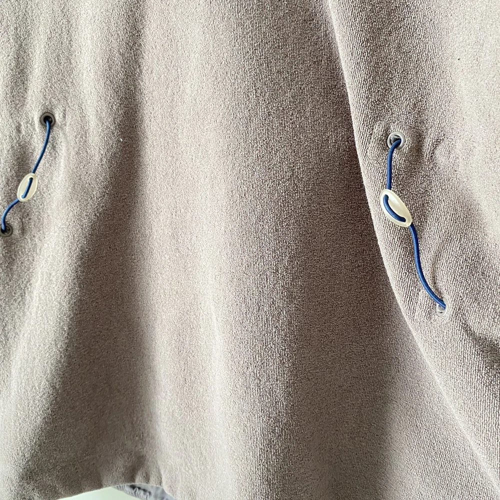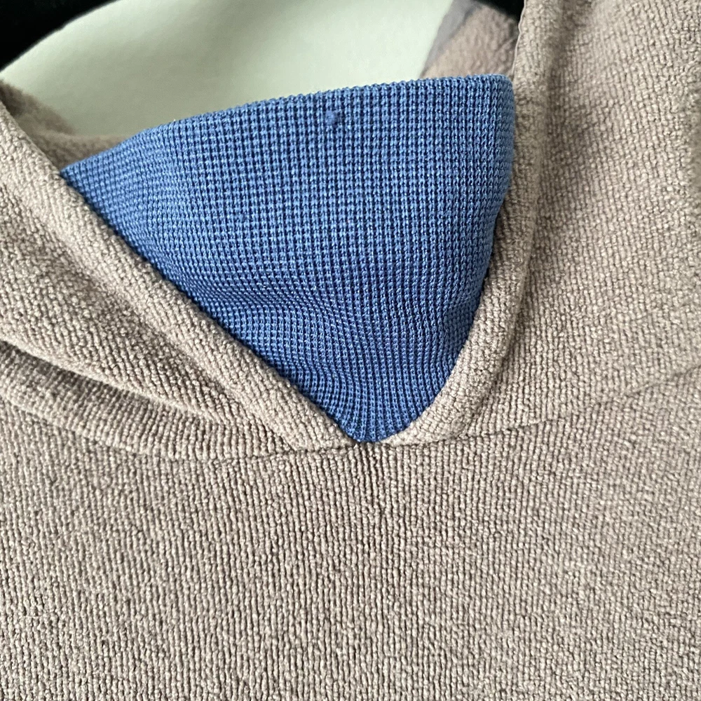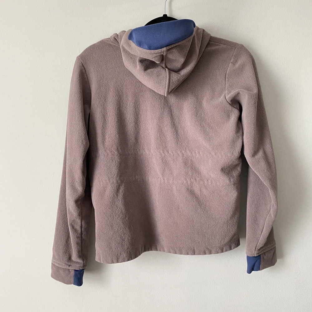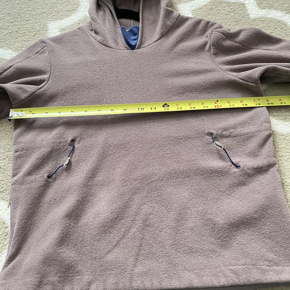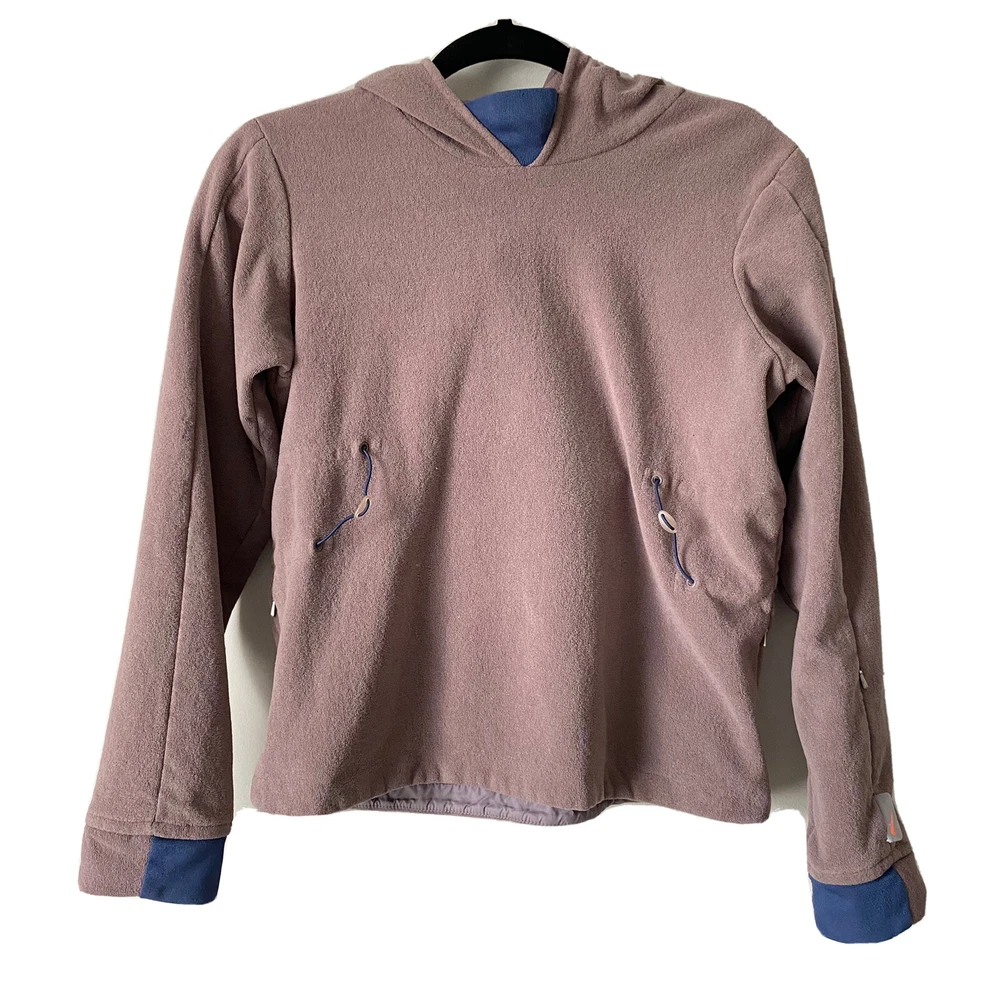 Nike Woman’s Brown French Terry Cloth Navy Accent Active Hoodie Sweatshirt Small Pullover style Drawstring cord waist Navy blue sleeve collar and hood accents Brim on hoodie Zip pockets No stains Small pull on collar Small rip on wrist logo Comes from a smoke free pet free house Size small measures 19.5” pit to pit and 22” in length laying flat