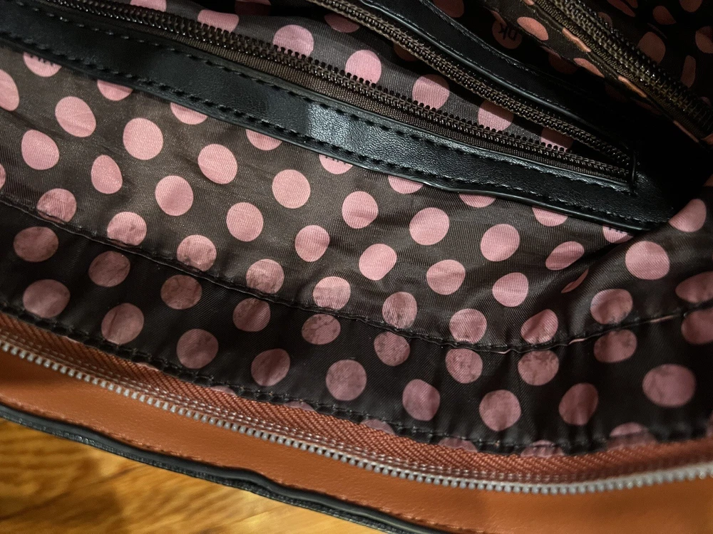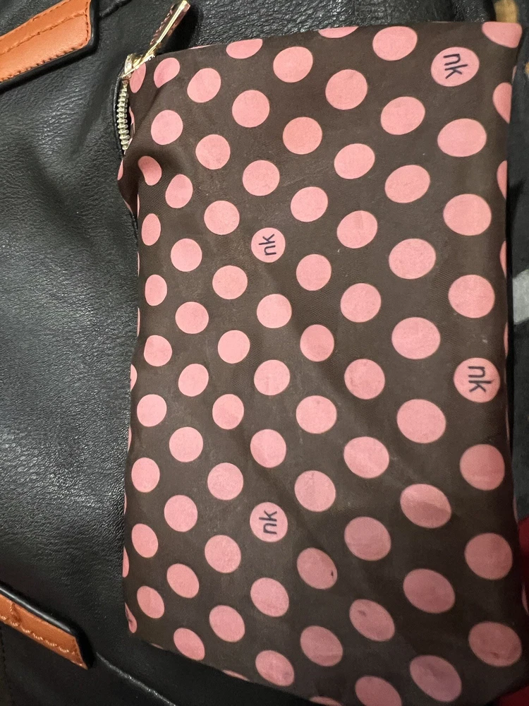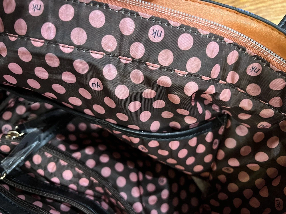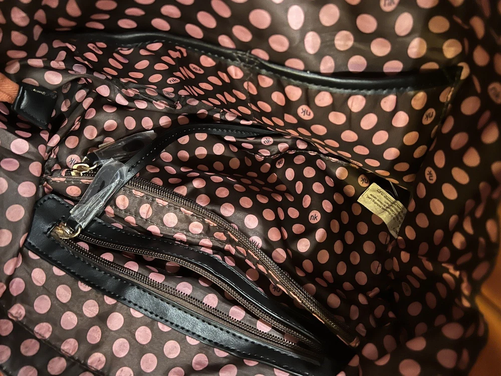 Nikky by Nicole lee shoulder tote bag. The bags exterior is in great condition, has no rips or tears. The design is as it’s supposed to be. The inside has has some wear on the lining but there is no rips. Has multiple pockets inside and one zipper pocket in the outside. The shoulder strap is missing.