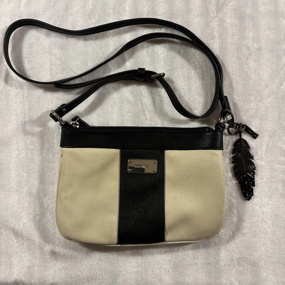 This is nice bag to go out with has a small mark on the front the keychain is awesome a metal feather with a name refer to photo This Nine West shoulder bag is the perfect accessory for any outfit. The exterior is made of faux leather in a multicolor design, featuring a white and black feather pattern. The bag comes with a strap for easy carrying and a keychain for added convenience. This small bag is ideal for women on-the-go, with a stylish design that can complement any outfit. Whether you're running errands or heading out for a night on the town, this Nine West bag is the perfect choice.