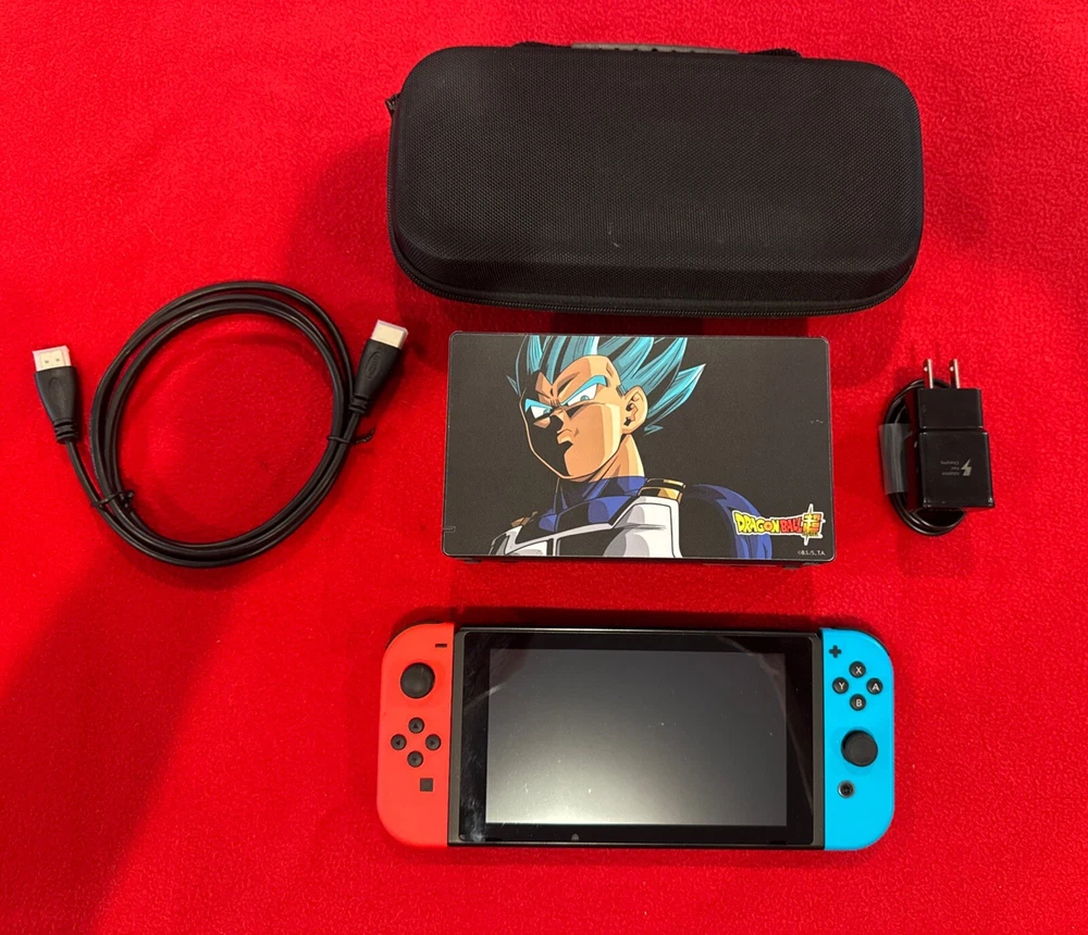 Get ready for hours of fun with the Nintendo Switch 32GB Console System Bundle! This bundle includes a neon JoyCon set, a travel dock, and a convenient case. With Wi-Fi capability and internet browsing, you can easily connect to the internet and stay entertained with your favorite games and content. This home console is perfect for gamers of all ages and skill levels. It features a resolution of 1080p (FHD) and an HDMI connectivity option. The Nintendo Switch is made in Japan and complies with California Prop 65 Warning standards. Don't miss out on this amazing bundle and start gaming today! This is a USED console with wear/tear/stains and other signs of use. If you need a perfect console this one is NOT for you. Includes the following: 1. Nintendo Switch console model: HAC-001-01 version 2 with double the battery life (used condition) serial: as pictured. Dragon ball skin 2. Neon red/blue joycons oem (tested and had minimal to no drift detected during testing) 3. Original black dock OEM to play on the TV w dragon ball skin 4. Power adapter 3p 5. HDMI 6. Black switch case used condition 7. Dragonball skin on back of console and dock Nothing else is included. Digital content is NOT guaranteed The price is firm. We price to sell quickly. Returns accepted within 30 days and deductions made for misuse/damage/missing items Ships USPS ground a signature may be required (no freight forwarders) if your address is mot verified on gmaps your order will be cancelled Would make a wonderful holiday gift 🎁