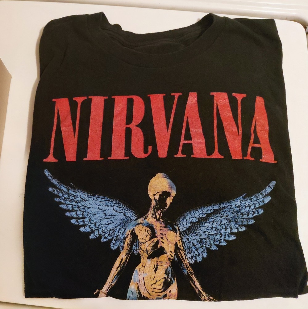 The shirt is tagless and the printed info has worn off. Super clean graphics on front. This Nirvana shirt for men in size 2XL features a black crew neck design with a printed neck tag for comfort. Made of 100% soft cotton jersey fabric, this T-shirt is ideal for all seasons and showcases bright album art and logos of the iconic heavy metal band. Perfect for fans of Kurt Cobain and Nirvana, this shirt is machine washable and features a regular fit for a comfortable and stylish look.