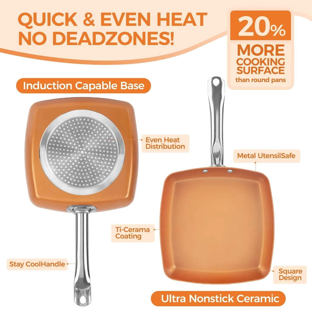 Specification: Material: Aluminum Package Including 1 PCS * frying pan Note: 1.Please allow 1-3mm measuring deviation due to manual measurement. 2.Due to the different monitor and light effect,the actual color of the item might be slightly different from the color showed on the pictures.Thank you! 1.Pan can replace bulky kitchen cookware sets. The pan can be used as a frying pan, saute pan, sauce pan, stockpot, wok pan, skillet, and braiser. 2.Our frying pan delivers superior heat conductivity, typically used on non-stick teflon coated products. 3.So, equipping your kitchen with the cookware allows for endless menu options! 4.9.5-inch Hard square copper with a highly durable nonstick ceramic finishing makes clean and maintain much easier. 5.With an aluminum alloy induction, perfect for cooking on surface from electric, gas and induction cooktops.