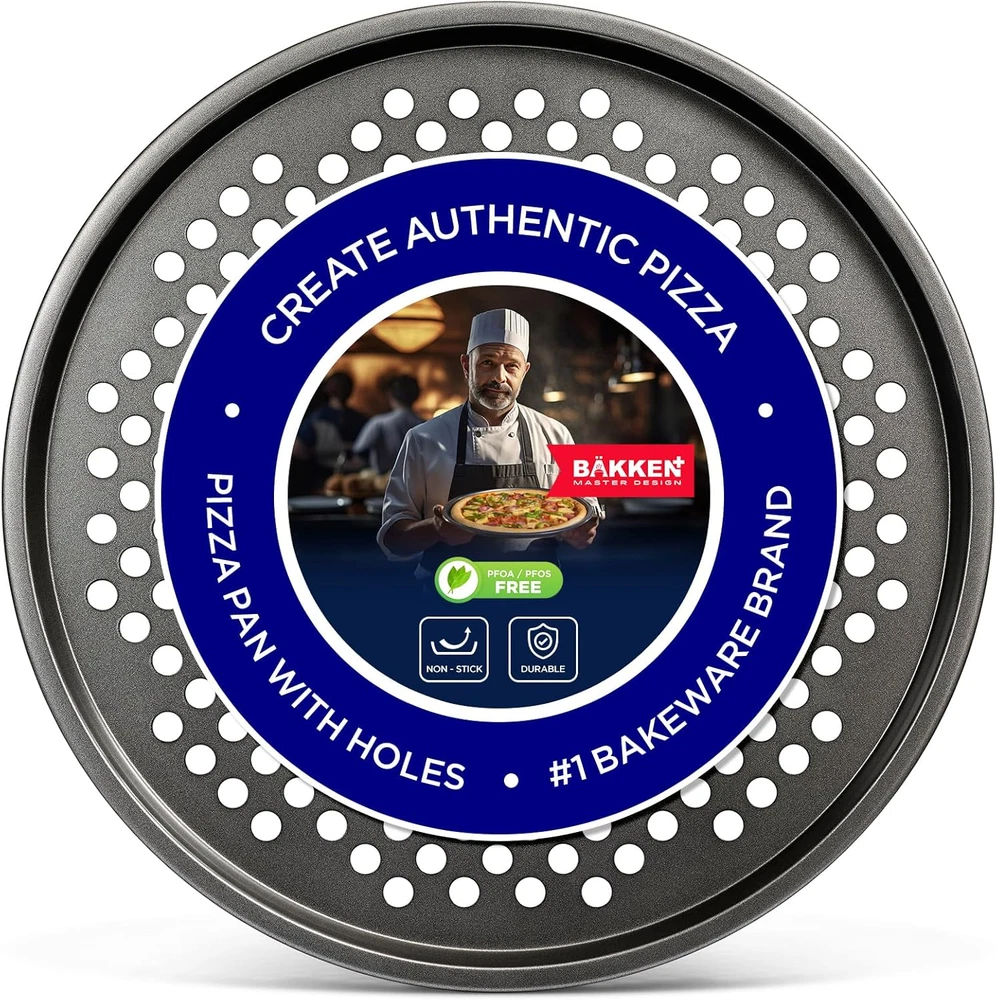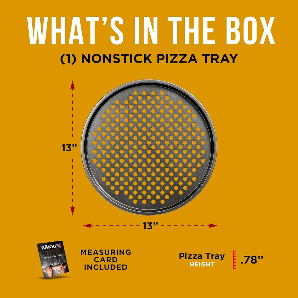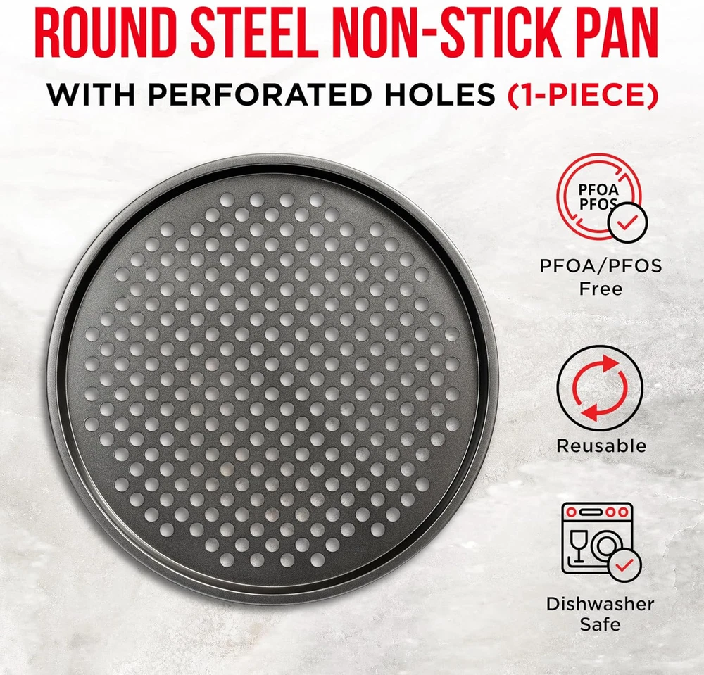 NON-STICK DESIGN – Thanks to the non-stick coating of this pizza tray for oven, your pizza will never be stick to the surface again. Now you can effortlessly release the food and easier slide the pizza off the tray without damaging its shape or presentation. A QUALITY YOU CAN TRUST - Crafted from high-quality carbon steel that is FOA, PFOS and PTFE free, this non-stick pizza tray features a durable and heat-resistant construction up to 450° Fahrenheit (230° Celsius) that can withstand high oven temperatures without warping or losing its shape. PERFECT FOR YOUR NEXT GOURMENT PIZZA PARTY- If you’re searching for a powerful round pizza pan that will help you make your favorite pizzas with ease – STOP SEARCHING. Unlike the regular baking pan that can easily burn your pizza, this pizza pan with holes has a consistent level of heat, meaning each pizza will be cooked equally with no smokey taste. VALUABLE ADDITION TO ANY KITCHEN - Explore various culinary creations beyond just pizzas, and use this non-stick pizza tray for making some baking breadsticks, roast a variety of vegetables, cookies, or enjoy making your own pita bread or flatbread. Best part? It comes in a pack of 1 perforated pizza pans with 13'' x 13'' x 0.78'' -inches. Cool right? GREAT GIFT IDEA – Tired of searching for an original, interesting and unique gift for your family, friends or relatives? Search no more, because we have the perfect pizza baking pan ideal for those special moments that is going to make you the most favorite person everywhere you take it. Tired of having sausages and burgers every time you are having a gathering with your friends? Need some practical and efficient solution for baking delicious homemade pizzas? If your answer is yes, then stop searching because we have the ultimate solution. PREPARE HOMEMADE DELICIOUS PIZZA TO PERFECTION - Bring the taste of Italy to your home with this pizza maker perfect for your make-your-own pizza nights and outdoor events. It is designed to provide a convenient and hassle-free pizza-baking experience, ensuring that your pizzas come out perfectly cooked and easy to serve. PERFORATED BASE - Designed with holes on the surface, which aid in proper airflow during baking, and allow the heat to circulate around the pizza, resulting in a well-cooked crust with a desirable texture—crispy on the bottom and soft on the inside. The perforations also help to prevent the formation of moisture pockets, preventing a soggy crust. GREAT MULTITASKER - Now besides your favorite pepperoni pizza, you can also make some other foods that benefit from a high temperature as well. Perfect for baking caramelized peach and onion tarts, vegetables, cookies, or making some homemade crispy fries. Specifications: • PFOA, PFOS, PTFE Free • Temperature Resistance: Up to 450° Fahrenheit (230° Celsius) • Metal Tray Thickness: 0.4mm • Internal and External Coating: Non-stick coating Grey color • Construction Material: Carbon Steel with Non-stick Coating • Product Dimensions (L x W x H): 13'' x 13'' x 0.78'' -inches • Features silicone handle covers for easy gripping and nicely rolled edges for extra protection PACKAGE INCLUDES: • 1 x Nonstick Pizza Tray Don’t wait and get this pizza tray to ensure that your pizzas will turn out perfectly cooked, effortlessly released from the tray, and ready to be enjoyed by family and friends.