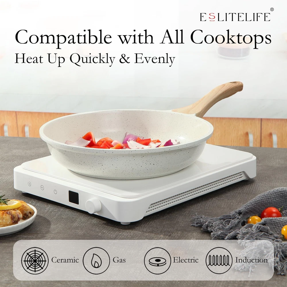 SAFE frying pan set is free of any toxins, and 100% PFOA, LEAD, CADMIUM free. NONSTICK GRANITE COATING Nonstick granite coating to ensure excellent nonstick performance, making cooking easier and cleanup. EASY TO CLEAN Nonstick interior stands up to everyday use and keeps food sliding smoothly along the surface, making cooking easier and cleanup. PREMIUM CASTING ALUMINUM Made of casting aluminum that provides break resistant and does not warp which ensures its durability and longevity. HEATS QUICKLY & EVENLY 4.5mm thicken induction compatible bottom provides a stable heat distribution and rapidly heating up. 2mm thicken aluminum body heat conductive can ensure uniform heat dissipation and prevent hot spots. HEAT RESISTANT BAKELITE HANDLE Ergonomic bakelite handle are suitable for grasping and staying cooking while cooking. Suitable handle lengths, and curved radians which is able to help you master your cooking. There are no rivets from the inside ensuring easy cleanup as well. SUITABLE FOR STOVE nonstick skillet set is perfectly suitable for gas, ceramic, electric, halogen or induction stoves. NOTICE Low to medium heat is recommended. Wooden or silicone utensil is recommended. Oven and dishwasher are not applicable. Please use sponge or soft scouring pad to clean . Please do not put the handle on high temperature. Please tighten the screw after receiving. AFTER-SALE SERVICE If you receive this frying pan set with any damage or if it malfunctions in any way, please free free to contact us, we will reply to you within 24 hours to address your concern. Non-Toxic Ceramic Coating & Super Easy to Clean - All pan and pot products are free of PTFE & PFOA, SGS approved, requiring less oil or butter for cooking and minimal scrubbing for a spotless clean, giving you a healthier and more enjoyable at-home cooking experience. Widely & Easy to Use - Our nonstick frying pan can be used for any cooking needs, perfect for slide-off-the-pan eggs, sauteing veggies, flipping pancakes and more, the heat resistant bakelite handle are suitable for grasping and staying cooling while cooking. This frying pan makes cooking easier than ever, cleaning enjoyable. Compatible with All Stovetops - Design with perfect magnetized base makes it conducts heats quickly & evenly, used effectively on gas, ceramic, electric, and induction stove tops, made for any kitchen and cooktop, an ideal replacement solution for your aging, worn out, or failed cooking equipment. Durable & Simple Care - The advanced die-cast aluminum technology, combined the advantage of cast-iron and traditional riveted cookware, use them on low to medium heat and add a dash of oil or butter for an effortless glide. Our cookware is also oven-safe up to 302ºF. Time to upgrade your pots and pans and spruce up your kitchen decor! Service & - has over 30 years experiences in non-stick cookware, in case you receive defect or damaged frying pan by shipping, please feel free to contact us, we will address your concern within 24 hours and all cookware is guaranteed to get 100% refund or new replacement. Really appreciate your trust and ordering!