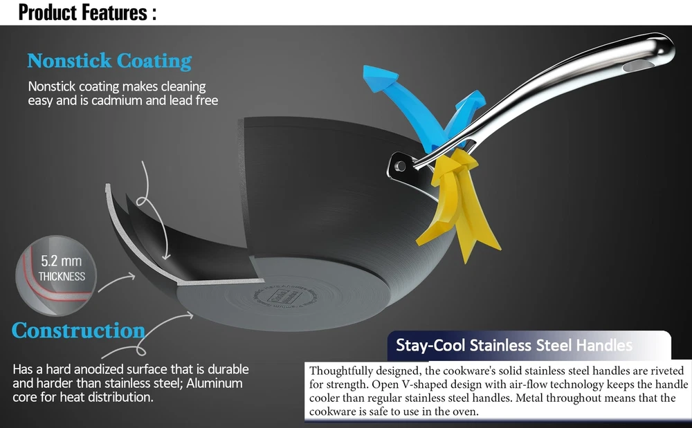 The 11-Inch Hard Anodized Nonstick Wok Stir Fry Pan Flat Bottom With Lid, Black, 28cm has a hard anodized surface that is durable, heats evenly and quickly, and prevents hot spots. Material is harder than steel, thick, and chip-resistant. Nonstick performance for easy food release and tossing, cleaning, and allows for healthy cooking. Tempered glass lid with steam vent is protected by a stainless steel rim to view food. Long riveted stainless steel handle stays cool and comfortable and is strong. Wide and deep to hold a large amount of food for multipurpose use: stir frying, sautéing, frying, and more. Not induction . Works on gas, , glass, ceramic, halogen, etc. Oven safe to 500°F, glass lid to 350°F. Dishwasher safe, hand wash recommended. 【Hard Anodized Surface】Has a hard anodized surface that is durable, heats evenly and quickly, and prevents hot spots. 【Non-stick Performance】Nonstick performance for easy food release and tossing, cleaning, just need to cook with little oil; and allows for healthy cooking by using various traditional cooking techniques like pan-frying, braising, and deep-frying. 【See-Through Lids】Tempered glass lid to view food; wide and deep to hold a large amount for multiple uses. 【Keep Cool Handle and Oven Safe】Long riveted stainless steel handle stays cool and comfortable; oven safe to 500°F, glass lid to 350°F. 【Works on Most Stovetops】 Not induction . Works on gas, , glass, ceramic, etc; hand wash recommended, Given diameter is outer diameter.