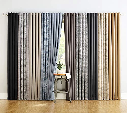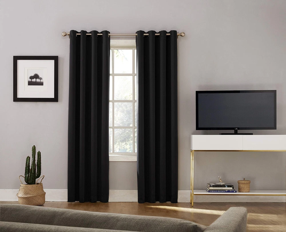 Oslo Theater Extreme 100% Blackout Grommet Curtain Panels provide the ultimate in light blocking technology to keep out even the harshest of light while bringing an elegant urban sophistication to any room of your home. Extreme Blackout technology is laboratory tested to block out 100% of light, reduce outside noise by up to 45%, and decrease energy lost through your windows by up to 50%. Comfort is optimized with thermal properties that help keep summer heat and winter chill out of your home. Built-in metal grommets allow for easy slide-through installation on curtain rods up to 1.5" in diameter. Hang in your entertainment room to eliminate screen glare and reduce distracting outside noise, or in your bedroom for enhanced privacy and a sounder, more uninterrupted sleep. Sold as individual panels measuring 52" width by 54" length in color black. Measure carefully before selecting your desired size and quantity. Rod not included. Machine wash cold on gentle cycle. Use non-chlorine bleach when needed. Tumble dry on low heat, using a cool iron as needed.