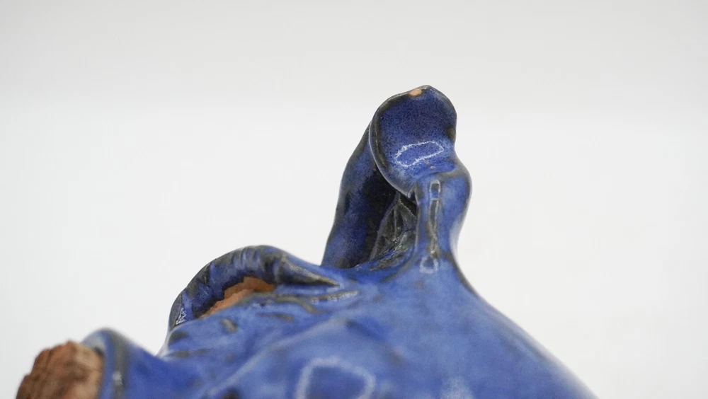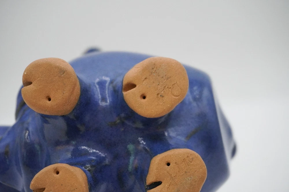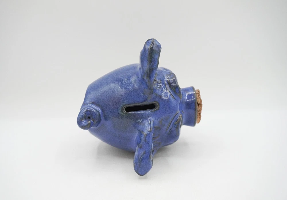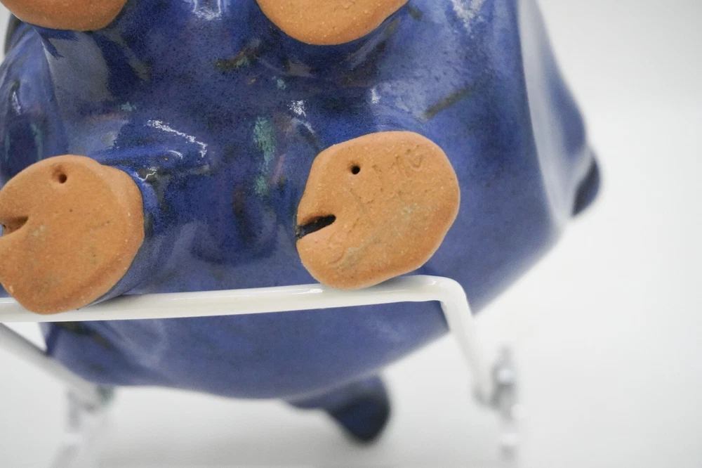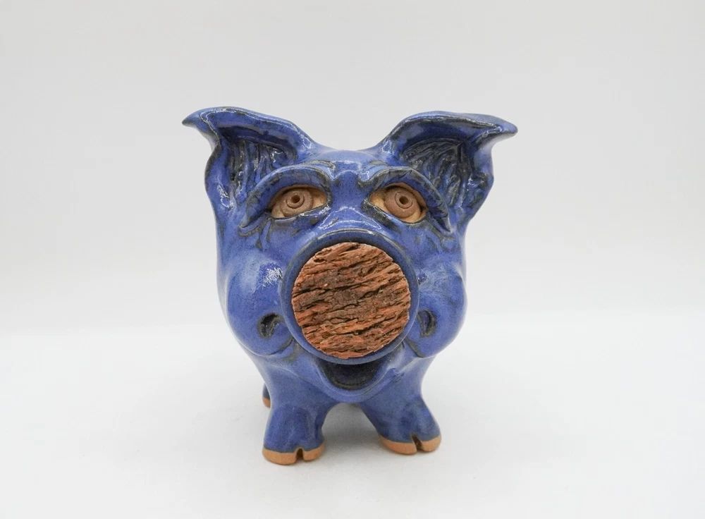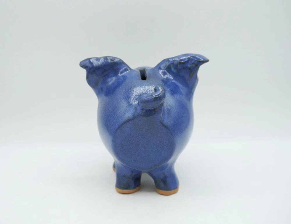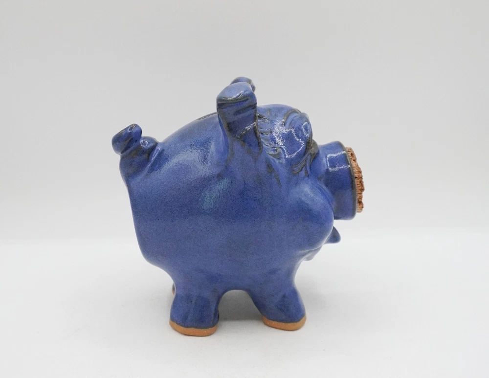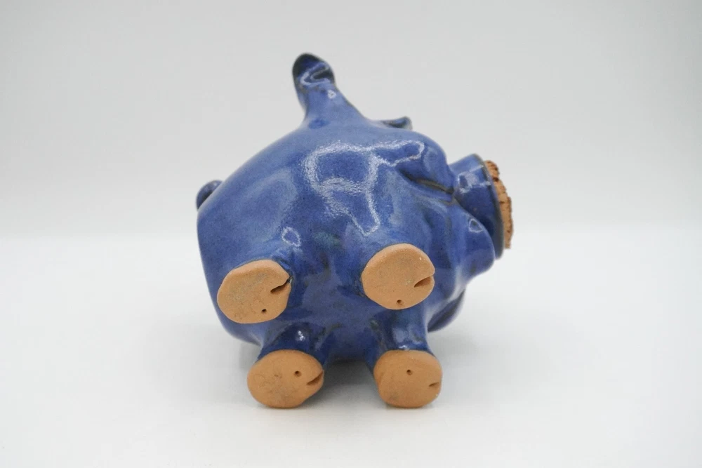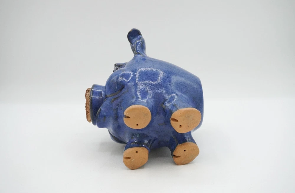 Charming blue ceramic piggy bank crafted by Sandy Cole at North Cole Pottery in Sanford, North Carolina. Features a stout 5.4" tall pig with a cork nose and a hole at the top to insert coins. Finished with a rich cobalt blue glaze. Very nice condition with only one small chip on the underpart of an ear (pictured). Measures 5.4" high, 5" wide, and 5" long. Weighs 1.6 lbs. Please let me know any questions. If at all unhappy with your purchase, please contact me before leaving feedback so that I may have the opportunity to try and make it right. I want you to be happy with your purchase!