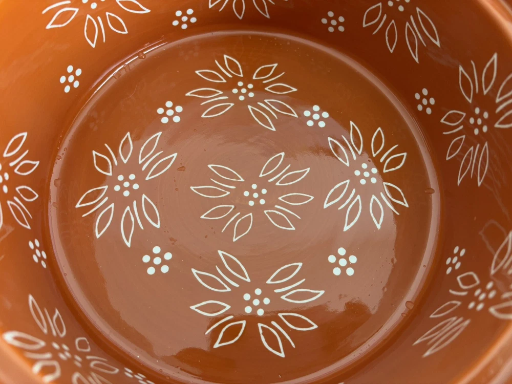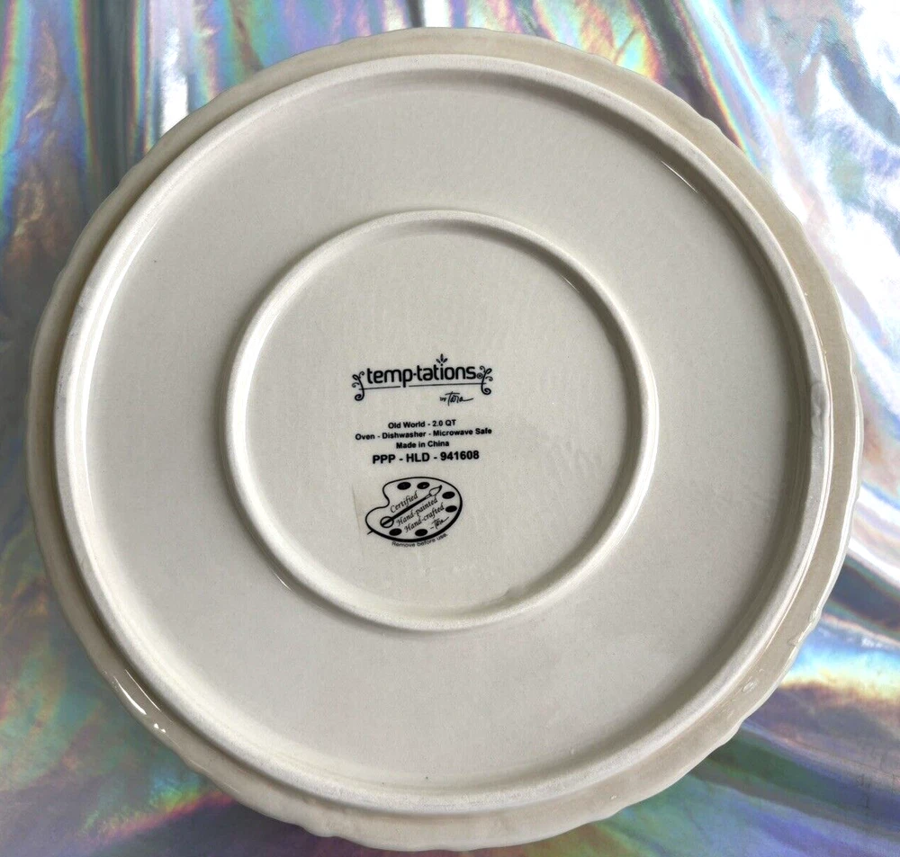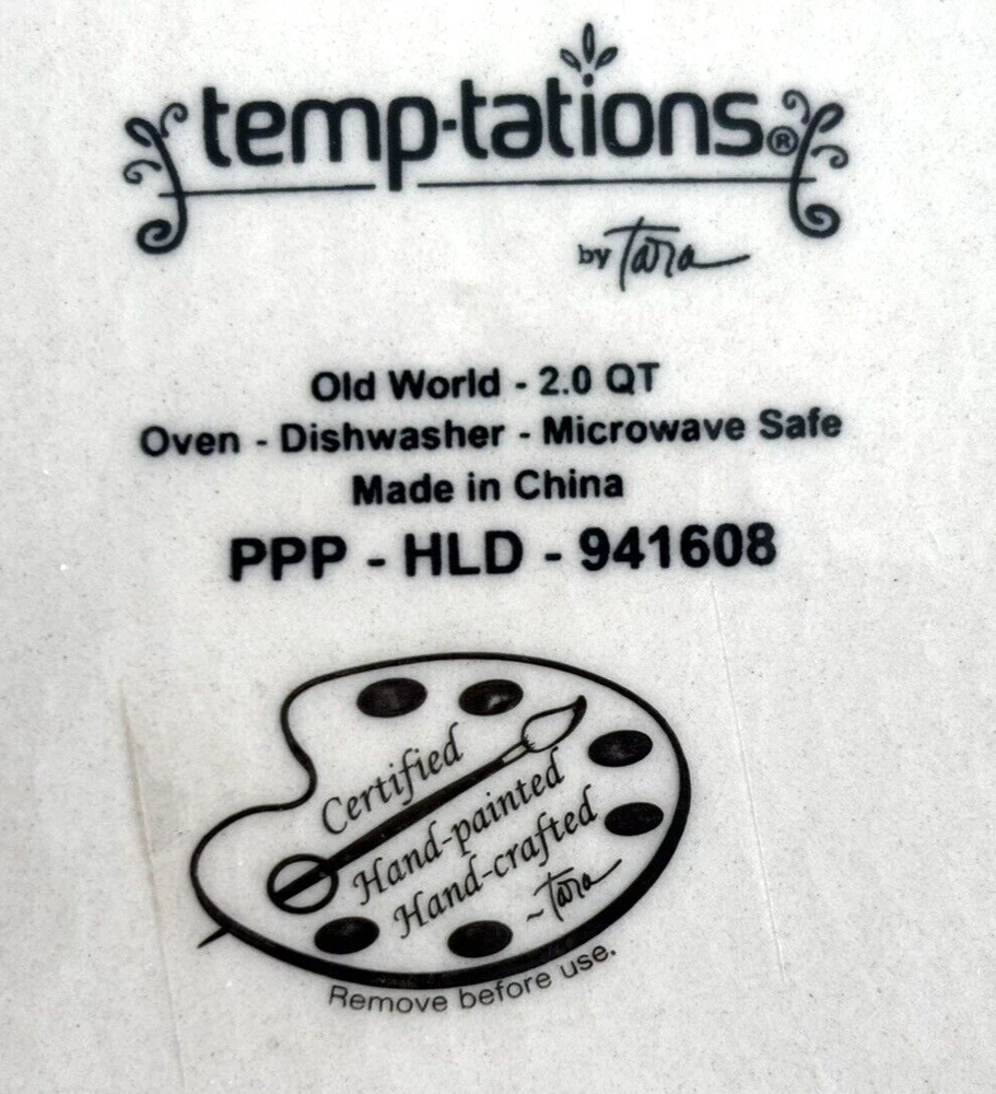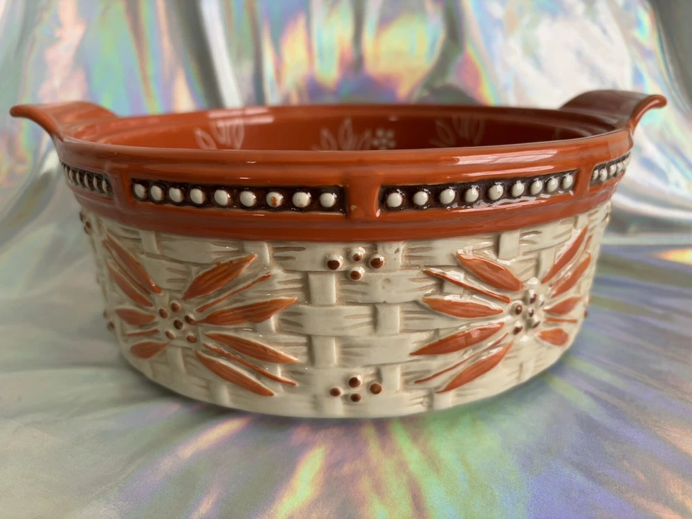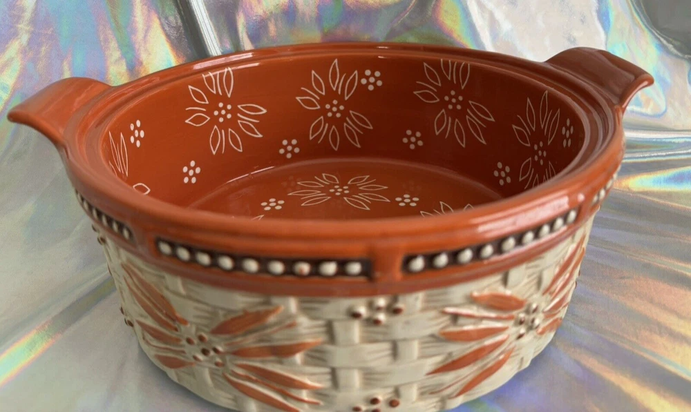 Here is a 2 quart round casserole baker/server with plastic lid and wooden trivet. The floral Old World pattern is in a beautiful dark orange terra cotta color. This hand-painted, hand-crafted three-piece set from Temp-tations, features a 2 quart round casserole baker with plastic lid for storage. It is a stylish and functional addition to any kitchen, perfect for baking and serving a variety of dishes. Casserole is oven, dishwasher and microwave safe. New without box.