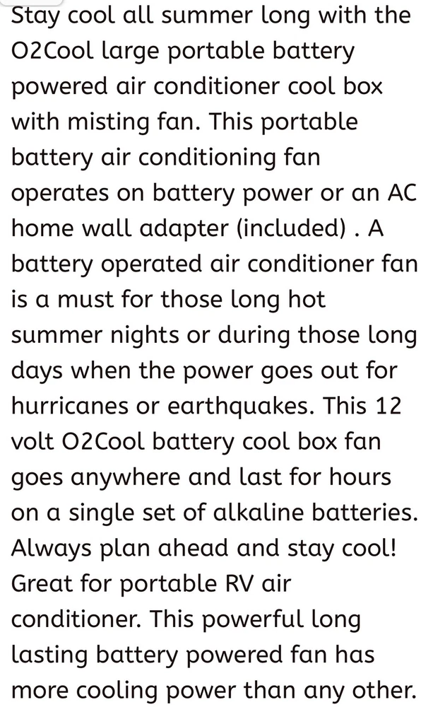 Stay cool all summer long with the O2Cool large portable battery powered air conditioner cool box with misting fan. This portable battery air conditioning fan operates on battery power or an AC home wall adapter (included) . A battery operated air conditioner fan is a must for those long hot summer nights or during those long days when the power goes out for hurricanes or earthquakes. This 12 volt O2Cool battery cool box fan goes anywhere and last for hours on a single set of alkaline batteries. Always plan ahead and stay cool! Great for portable RV air conditioner. This powerful long lasting battery powered fan has more cooling power than any other.
