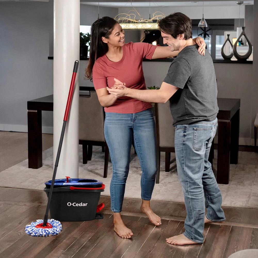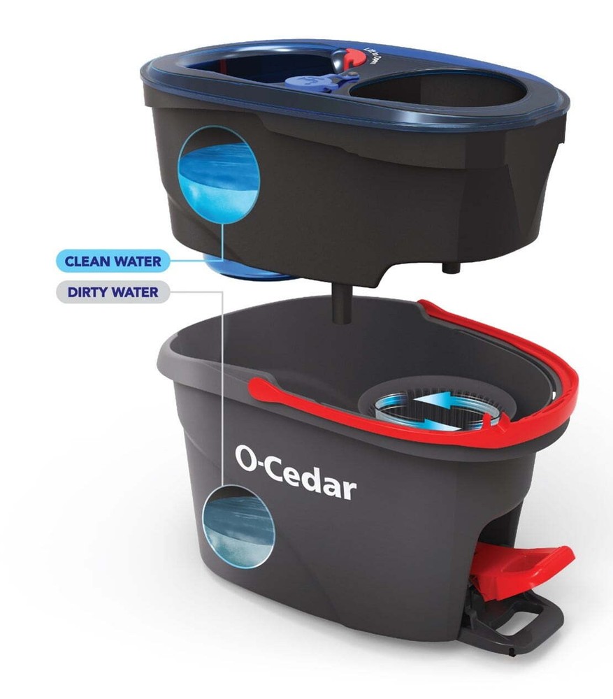 A continuous clean, from start to finish. Rethink the way you clean with a fresh start, every time. The O-Cedar RinseClean™ Spin Mop features an innovative 2-tank bucket system to separate clean and dirty water for a seamless cleaning experience. A truly deep clean has never been easier. O-Cedar EasyWring™ RinseClean™ Spin Mop & Bucket System, Hands-Free System 2-tank bucket system - breakthrough bucket innovation featuring separated tanks for clean and dirty water Foot-activated pedal allows for hands-free wringing and controlled water release Machine washable microfiber mop head refill lasts up to 3 months Multi-purpose microfiber mop removes over 99% of bacteria with water* Triangle shaped mop head for easy maneuverability and corner cleaning Safe for all hard floor surfaces, including hardwood System includes RinseClean 2-tank bucket, telescopic handle that adjusts to 51 inches, and microfiber mop head Separates clean & dirty water Our 2-tank bucket system ensures you clean your home with fresh water, every time. Hands-free wringing Built-in pedal allows for hands-free wringing, and lets you control the moisture level on your floors. Use & Care Machine or hand wash mop head. Do not use fabric softeners or bleach. Lay flat to dry. For best results, replace refill every 3 months. Store bucket in dry conditions. Do not expose to excessive sunlight.