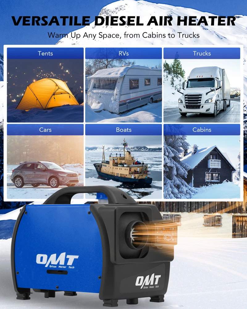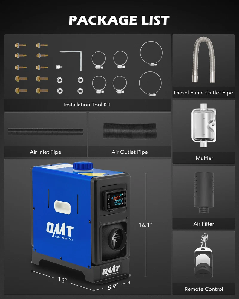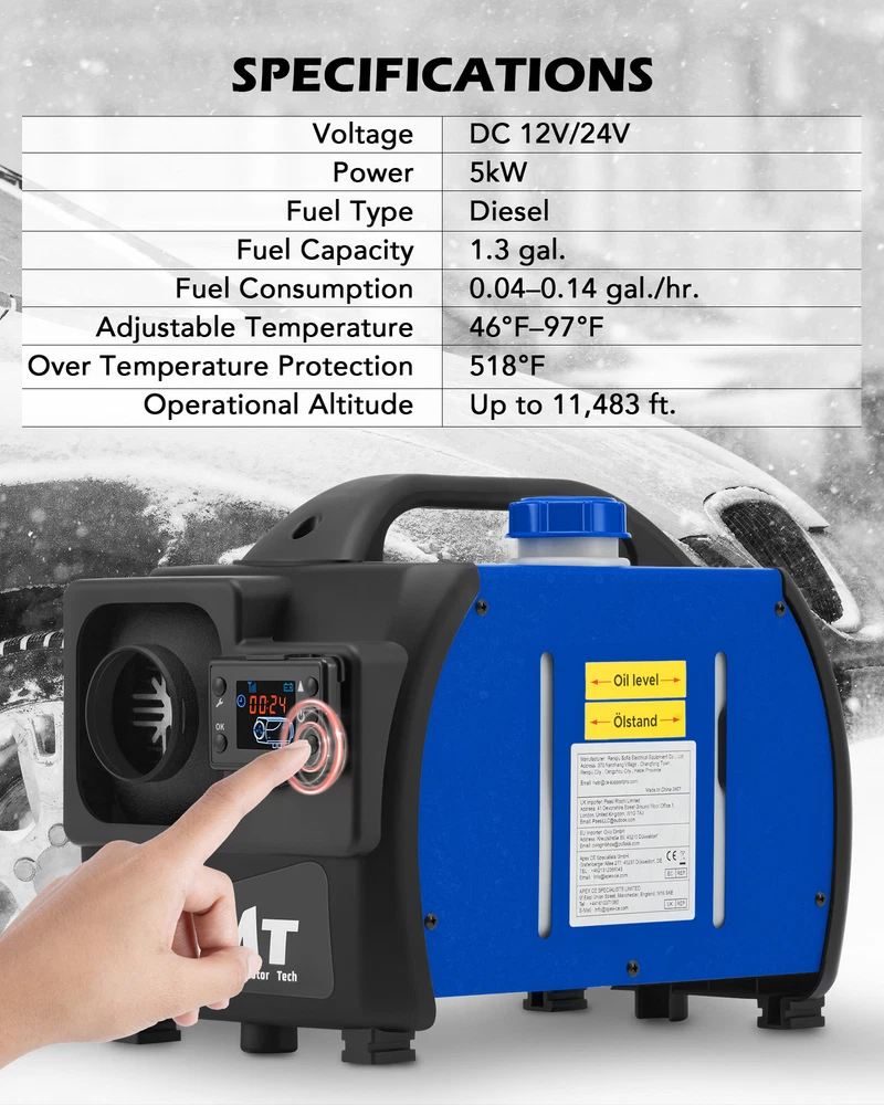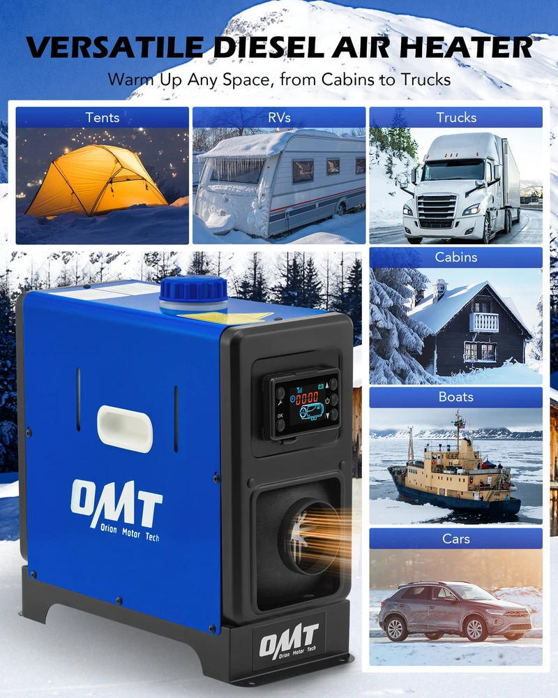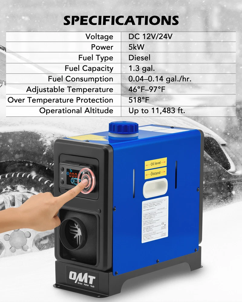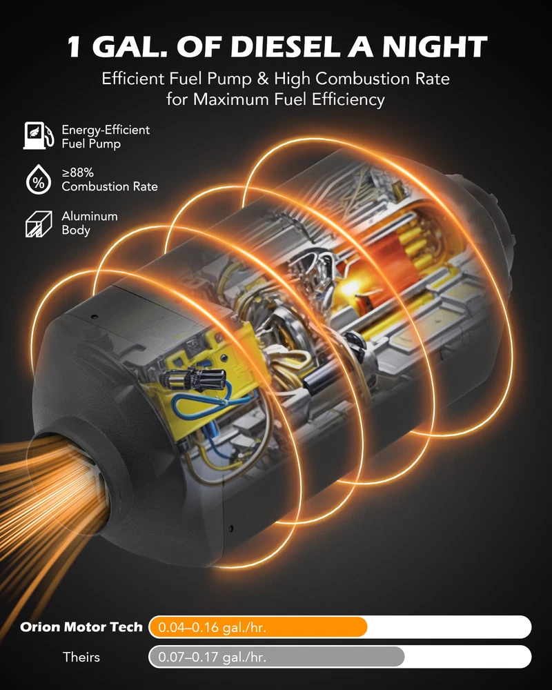 Desc ription Orion Motor Tech's 5kW/8kW diesel air heater is the perfect cold-weather companion, whether you're adventuring in an RV, truck, or camper. With a heating range from 46°F to 97°F , it keeps you cozy even at altitudes up to 11,483 feet —ideal for high-altitude camping or chilly mornings. Its all-in-one design makes it easy to install and transport, so you can enjoy powerful warmth wherever you go. The remote control and LCD panel make managing your heater simple. Preheat your vehicle or adjust settings from up to 164 feet away, or fine-tune timers and temperature levels using the intuitive LCD display. With its low fuel consumption of just 0.04 to 0.14 gallons per hour, this heater provides 10 to 24 hours of continuous warmth on a full 1.3 gallon tank, ensuring comfort throughout your trip without the need for frequent refueling. Whether you're camping in the mountains or embarking on a long road trip, this all in one diesel heater ensures reliable warmth and efficiency for every adventure. Features All-in-One Diesel Heater : Stay warm this winter with Orion Motor Tech's 5kW/8kW diesel air heater. It offers a heating range of 46°F to 97°F , compatibility with DC 12V and 24V systems, and an integrated design for easy transport and installation Save on Fuel Costs : With an aluminum chamber for fast heating and low fuel consumption of 0.04-0.14 gal./hr. , this diesel heater provides 10-24 hours of continuous warmth from its 1.3-gallon tank, keeping you cozy while minimizing fuel usage Intelligent Dual Controls : Control your comfort with the remote and LCD panel. Preheat your space from up to 164 feet away with the remote, and use the LCD panel for complete control over temperature, timer settings, level adjustments, and more Stay Warm Anywhere : Our all-in-one diesel heater is effective at altitudes up to 11,483 feet and operates reliably at temperatures from -40°F to 122°F , making it ideal for heating cars, trucks, RVs, and keeping you warm on camping trips Safe & Low Noise Operation : This small diesel heater features overheating protection to ensure safety and a leakproof tank cover to prevent fuel spills. Its silent fan and muffler keep noise levels low for a quiet, efficient heating ex perience Specifications Material: Aluminum, Plastic Voltage: DC 12V/24V Power: 5kW/8kW Fuel Type: Diesel Fuel Capacity: 1.3 gal. (5L) Fuel Consumption: 0.04-0.14 gal./hr. (0.16-0.52 L/h) Adjustable Temperature: 46°F-97°F (8°C-37°C) Over Temperature Protection: 518°F (270°C) Remote Range: 164 ft. (50 m) Operational Altitude: Up to 11,483 ft. (3500 m) Full Consumption Rate: ≥88% Heater Dimension s: 15.7 x 9.8 x 12.2 in. (40x25x31 cm)/ 15 x 5.9 x 16.1 in. (3 8x15x41 cm) Weight: 16.8 lb. (7.6 kg)/17.2 lb. (7.8 kg)/17.8 lb. (8.1 kg)/18.3 lb. (8.3 kg) Package List 1x Diesel Air Heater 1x Diesel Fume Outlet Pipe 1x Muffler 1x Air Inlet Pipe 1x Air Outlet Pipe 1x Air Filter 1x Remote Control 1x Installation Tool Kit 1x Instructions On Oct 25, 2024 at 01:49:31 PDT, seller added the following information: On Oct 28, 2024 at 00:43:36 PDT, seller added the following information: