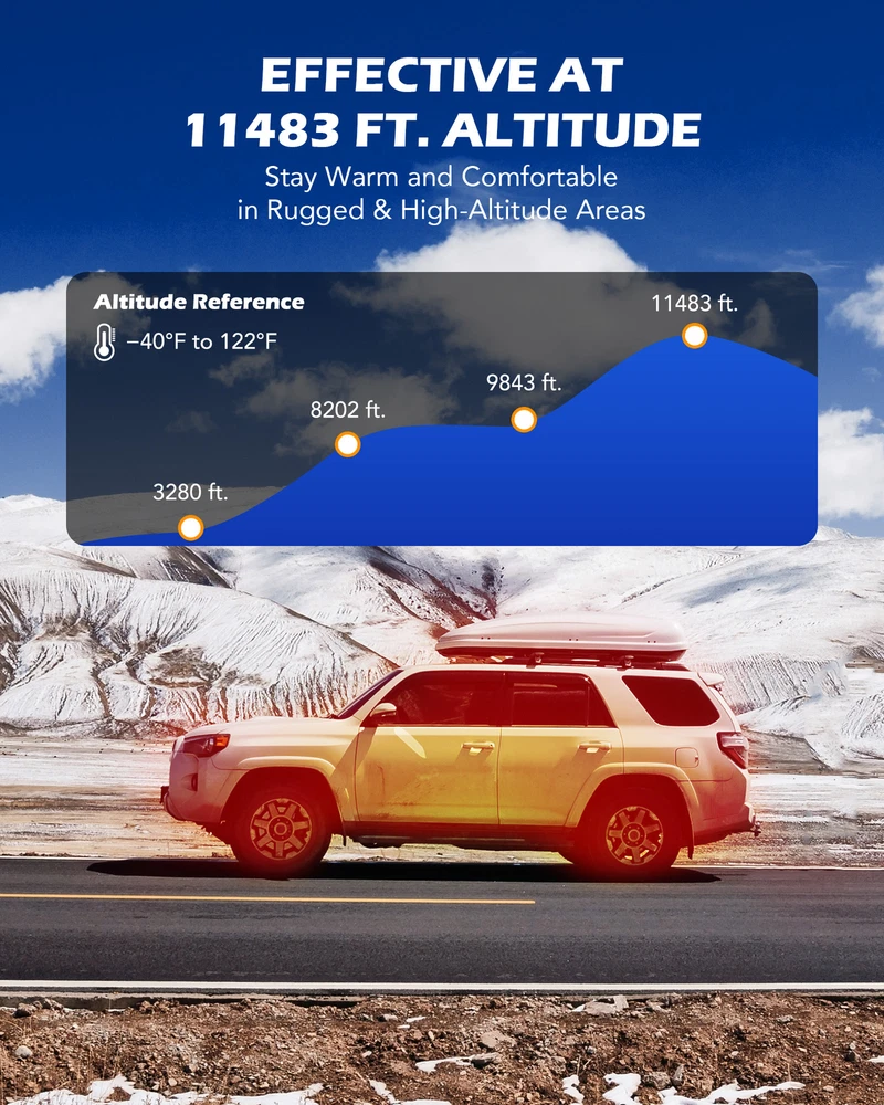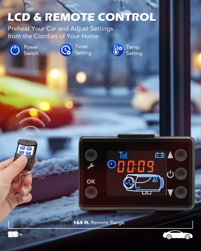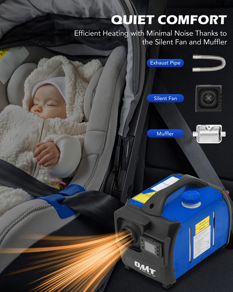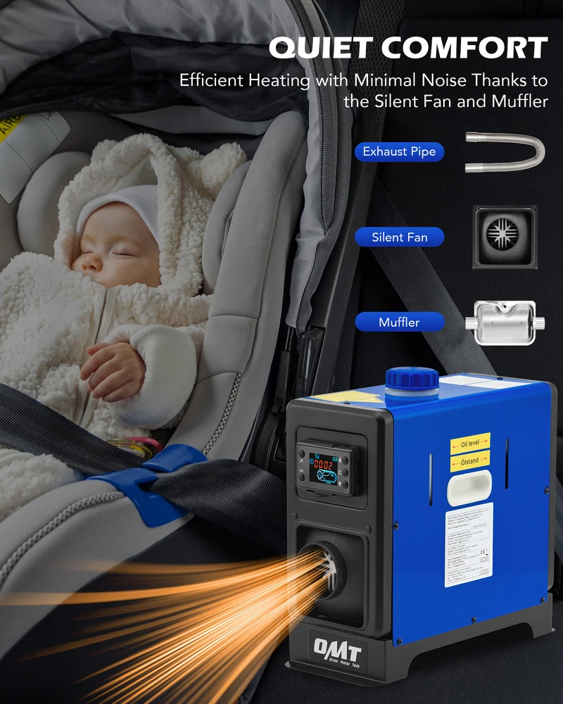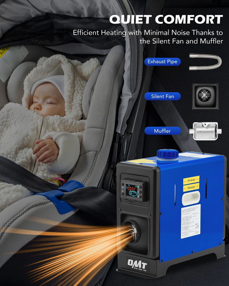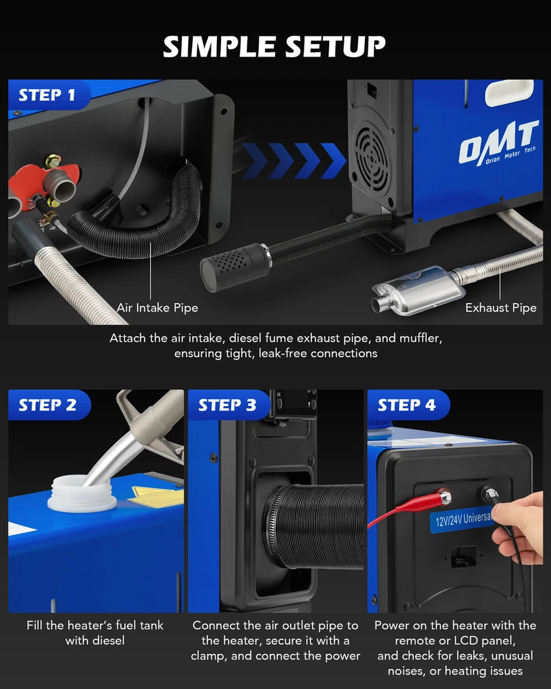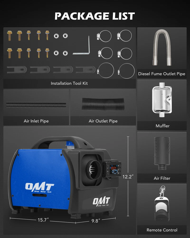 Desc ription Orion Motor Tech's 5kW/8kW diesel air heater is the perfect cold-weather companion, whether you're adventuring in an RV, truck, or camper. With a heating range from 46°F to 97°F , it keeps you cozy even at altitudes up to 11,483 feet —ideal for high-altitude camping or chilly mornings. Its all-in-one design makes it easy to install and transport, so you can enjoy powerful warmth wherever you go. The remote control and LCD panel make managing your heater simple. Preheat your vehicle or adjust settings from up to 164 feet away, or fine-tune timers and temperature levels using the intuitive LCD display. With its low fuel consumption of just 0.04 to 0.14 gallons per hour, this heater provides 10 to 24 hours of continuous warmth on a full 1.3 gallon tank, ensuring comfort throughout your trip without the need for frequent refueling. Whether you're camping in the mountains or embarking on a long road trip, this all in one diesel heater ensures reliable warmth and efficiency for every adventure. Features All-in-One Diesel Heater : Stay warm this winter with Orion Motor Tech's 5kW/8kW diesel air heater. It offers a heating range of 46°F to 97°F , compatibility with DC 12V and 24V systems, and an integrated design for easy transport and installation Save on Fuel Costs : With an aluminum chamber for fast heating and low fuel consumption of 0.04-0.14 gal./hr. , this diesel heater provides 10-24 hours of continuous warmth from its 1.3-gallon tank, keeping you cozy while minimizing fuel usage Intelligent Dual Controls : Control your comfort with the remote and LCD panel. Preheat your space from up to 164 feet away with the remote, and use the LCD panel for complete control over temperature, timer settings, level adjustments, and more Stay Warm Anywhere : Our all-in-one diesel heater is effective at altitudes up to 11,483 feet and operates reliably at temperatures from -40°F to 122°F , making it ideal for heating cars, trucks, RVs, and keeping you warm on camping trips Safe & Low Noise Operation : This small diesel heater features overheating protection to ensure safety and a leakproof tank cover to prevent fuel spills. Its silent fan and muffler keep noise levels low for a quiet, efficient heating ex perience Specifications Material: Aluminum, Plastic Voltage: DC 12V/24V Power: 5kW/8kW Fuel Type: Diesel Fuel Capacity: 1.3 gal. (5L) Fuel Consumption: 0.04-0.14 gal./hr. (0.16-0.52 L/h) Adjustable Temperature: 46°F-97°F (8°C-37°C) Over Temperature Protection: 518°F (270°C) Remote Range: 164 ft. (50 m) Operational Altitude: Up to 11,483 ft. (3500 m) Full Consumption Rate: ≥88% Heater Dimension s: 15.7 x 9.8 x 12.2 in. (40x25x31 cm)/ 15 x 5.9 x 16.1 in. (3 8x15x41 cm) Weight: 16.8 lb. (7.6 kg)/17.2 lb. (7.8 kg)/17.8 lb. (8.1 kg)/18.3 lb. (8.3 kg) Package List 1x Diesel Air Heater 1x Diesel Fume Outlet Pipe 1x Muffler 1x Air Inlet Pipe 1x Air Outlet Pipe 1x Air Filter 1x Remote Control 1x Installation Tool Kit 1x Instructions On Oct 25, 2024 at 01:49:31 PDT, seller added the following information: On Oct 28, 2024 at 00:43:36 PDT, seller added the following information: