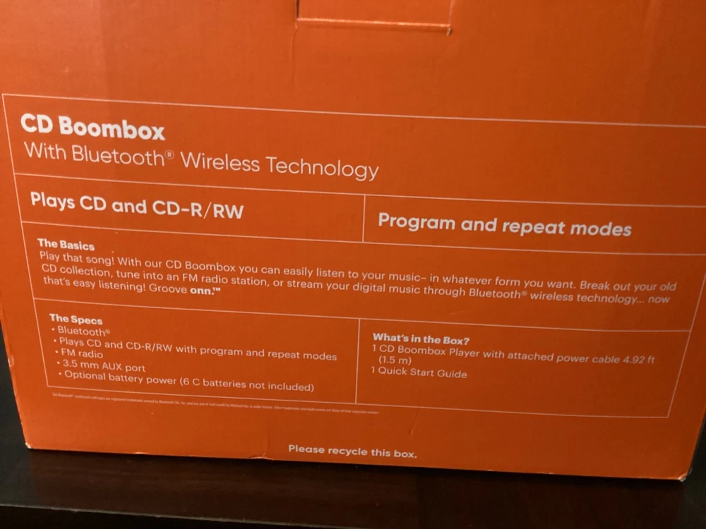 Product Line:onnPlayable Media Format:CDUPC:0681131309837Features:Bluetooth, Headphone Jack, CD Changer, CD RecorderBrand:ONNAudio Outputs:Headphone JackType:Boomboxgtin13:0681131309837Connectivity:Wireless, BluetoothMPN:AAABLK100009771CD Changer Capacity:1Memory Type:Not IncludedBand:AM/FMModel:ONN 2.0Seller Notes:“Boombox is new but box has been opened.”Audio Inputs:Aux, 3.5 mm JackCountry/Region of Manufacture:ChinaColor:Black