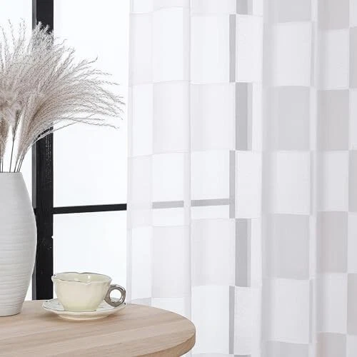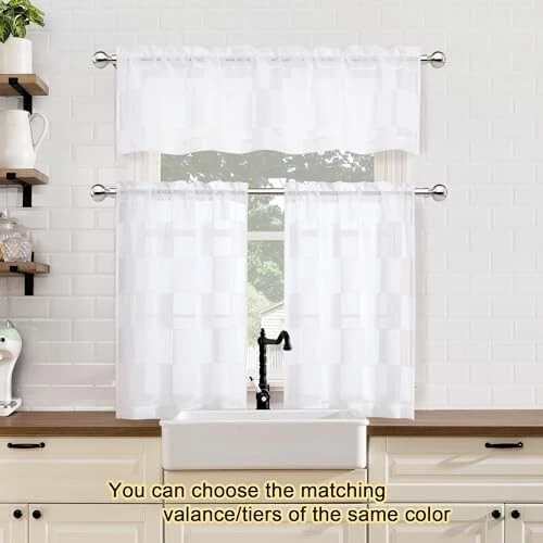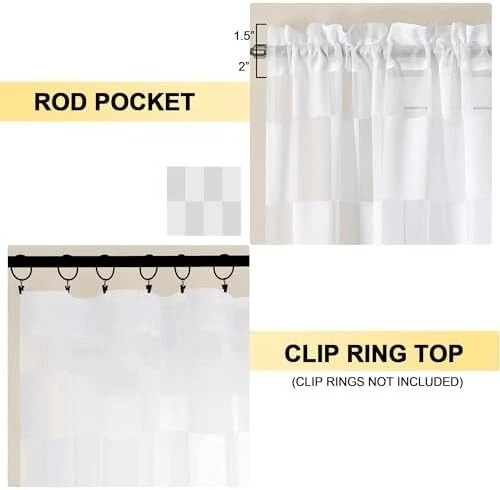 About this item 【Ready Made】Each pack contains 1 piece valance, 56" wide and 14" long, total length is 15.5" including 1.5" header. 2" rod pocket fits most curtain rods, which make the valance easier to hang or slide. 【Light Filtering Curtains】 Semi checkered sheer not only appears an elegant look without wrinkle but also adds a soft touch. The 14 inch sheer valance can softly filter out glare sunlight and offer just the right amount of privacy. 【2-Way Hanging Options】Hang this valance (1) from the 2" rod pocket for a classic casual look, or (2) using clip rings for easy, slide open and closed (clip rings are not included). 【Use Widely】sheer voile window treatments are available for different colors and sizes, which suitable for living room, bedroom, dining room, kids room, guest room, hotel, patio door, balcony and sliding glass door. 【Care Instruction】Machine wash cold in gentle cycle with like colors. Only non-chlorine bleach when needed. Tumble dry low. Remove promptly. Cool iron as needed.
