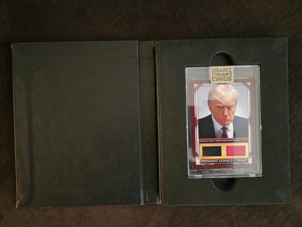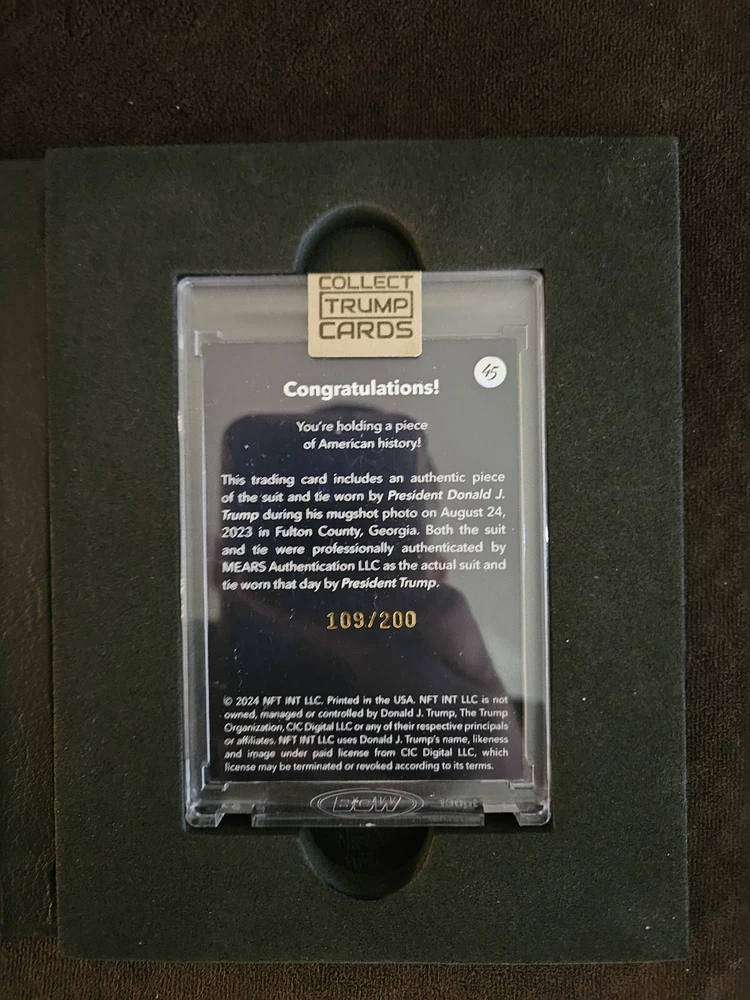 This is an official Collect Trump Cards physical card featuring a piece of Donald Trump's mugshot suit and tie. The card is made of high-quality card stock and has a standard size. It is an original non-sport trading card manufactured in the United States by Collect Trump Cards in 2024. The card is part of the Politics franchise and has the card number 109/200. It is a great addition to any collection of collectibles or non-sport trading cards. The card features Donald Trump, a famous political figure, and is in excellent shape.