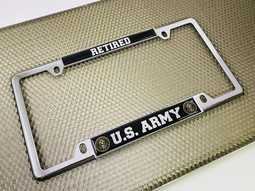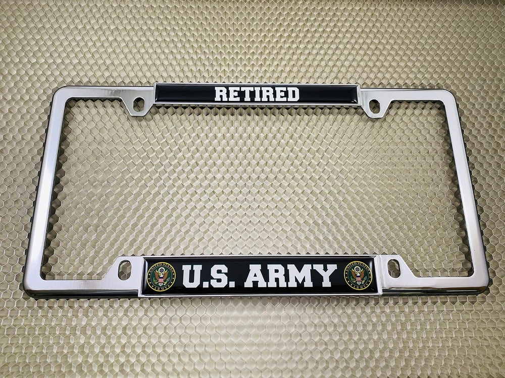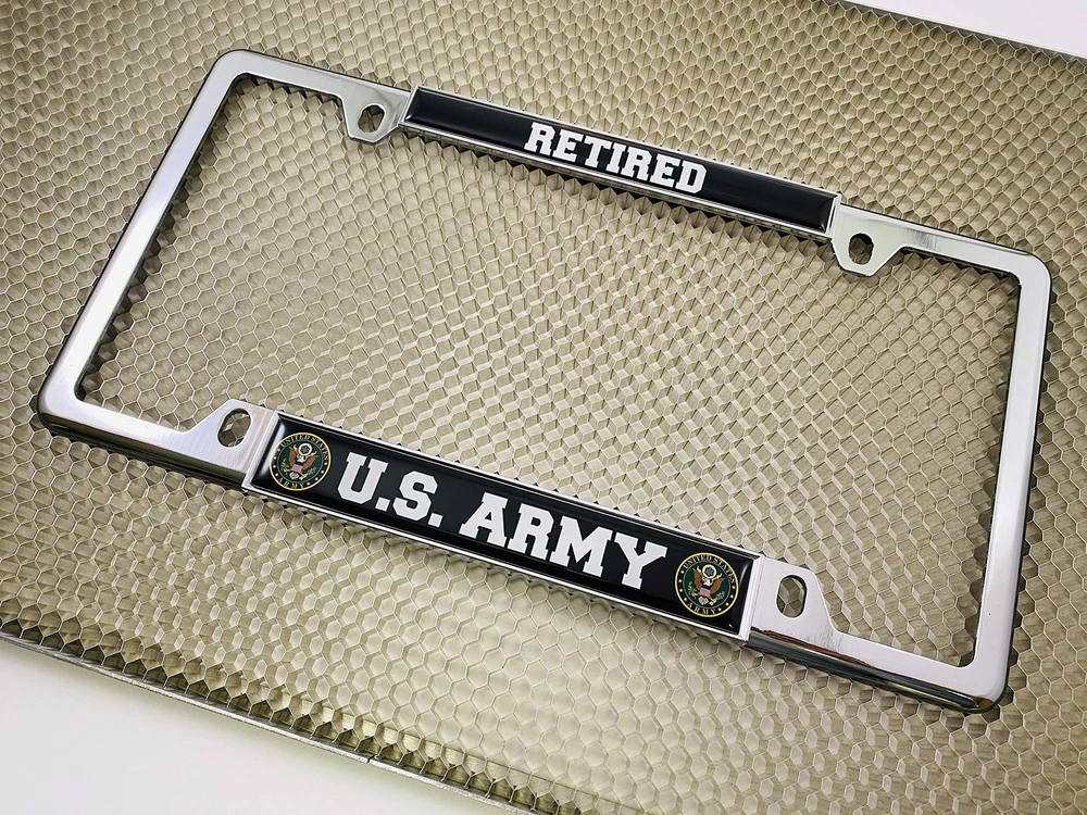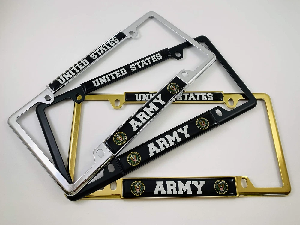 Our Domed Thin Top | Narrow Top, 4-hole Metal (zinc) Car License Plate Frames designed specifically for customers who live in the states, which do not allow to cover up the name of the state located at the top part of your state issued license plate. Artwork is printed using unique leading technology with our special equipment onto UV stable and weather resistant outdoor-grade vinyl. Clear polyurethane Non-Yellowing Doming resin applied on the text area gives your frame Extra layer of protection as well as Rich and Sophisticated appearance. These license plate frames are great, very durable and will not fade, rust or tarnish. Frames fit all standard size USA and Canada 12" x 6" license plates and can be used for the front or the back of the vehicle. Each frame has 4 holes and 2 securing tabs on the back side of it which allows you to install your frame with 2 or 4 screws without any concerns and will definitely keep your license plate in place and stop it from rattling. Best for the following states: AK, AZ, AR, CA , CT, FL, GA, HI, ID, IL, IA , KS, KY, LA, ME, MD, MA, MI, MN, MS, MO, MT, NE, NV, NJ, NM, NY, OH, OK, OR, PA, RI, SC, SD, TN, TX, UT, VT, VA, WA, WV and WI. Not recommended for use in the following states: AL, CO, DE, IN, NH, NC, ND and WY - states which don't allow to cover up the name of the state located on the bottom part of the license plate. OFFICIALLY LICENSED U;S; ARMY PRODUCT - officially licensed by the United States Army and is proudly made in the United States TECHNOLOGY - Very Durable, High-Quality product; Polyurethane Clear Dome over the artwork area gives your license plate frame a Unique, Luxury, Custom and one of a kind look; American-made weather-resistant products will not fade, rust, or tarnish BEST FOR THE FOLLOWING STATES - AK, AZ, AR, CA , CT, FL, GA, HI, ID, IL, IA , KS, KY, LA, ME, MD, MA, MI, MN, MS, MO, MT, NE, NV, NJ, NM, NY, OH, OK, OR, PA, RI, SC, SD, TN, TX, UT, VT, VA, WA, WV and WI NOT RECOMMENDED FOR THE FOLLOWING STATES - AL, CO, DE, IN, NH, NC, ND and WY