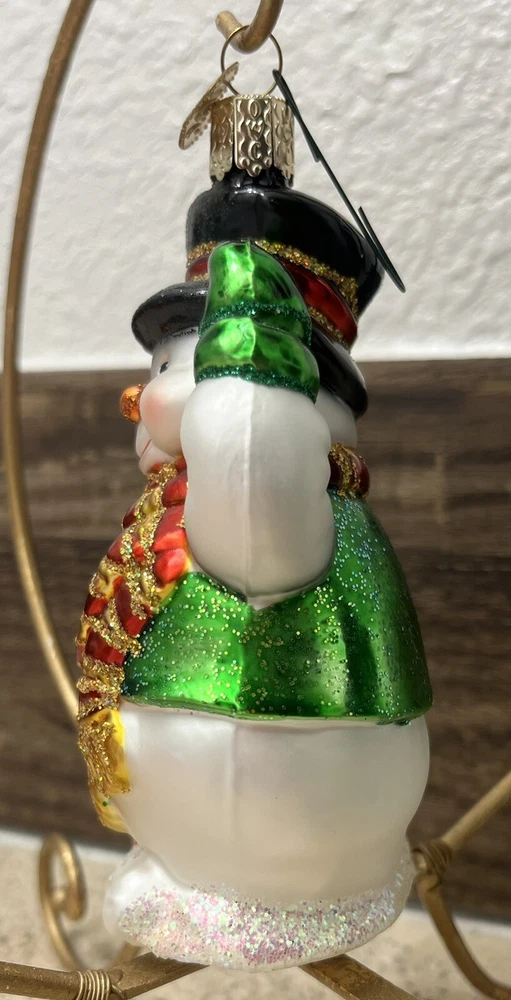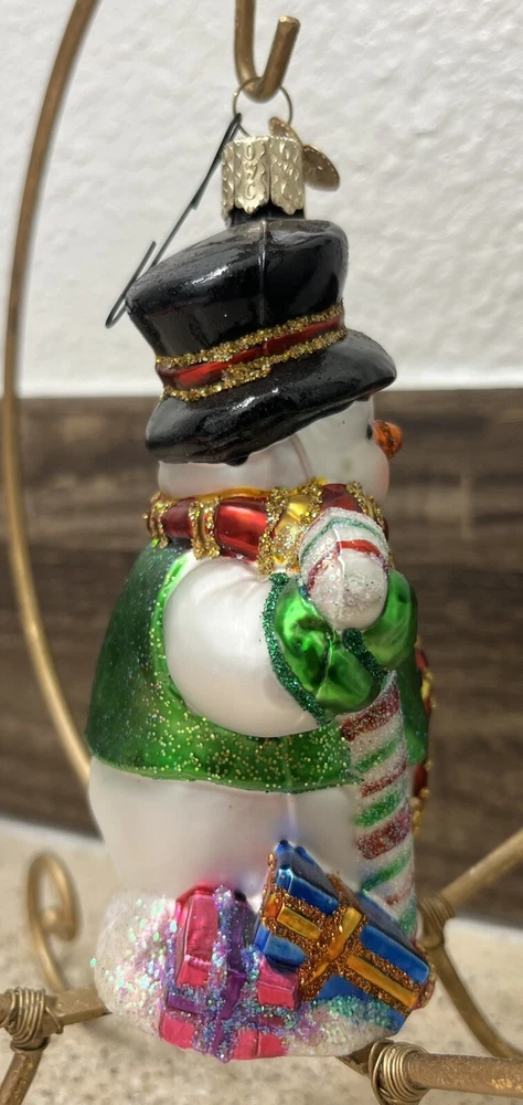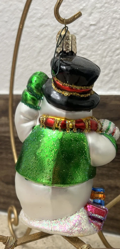 Add a whimsical touch to your holiday decor with the Old World Christmas 5" Candy Cane Snowman ornament. Expertly crafted using traditional hand-blown glass techniques, this charming piece showcases a vibrant multicolored design that brings a festive spirit to any Christmas tree or mantel. This medium-sized, hanging ornament is a part of Old World Christmas's esteemed collection, renowned for its unique art glass productions. Celebrate the season with this delightful snowman, a perfect gift for your family that captures the essence of Christmas joy and merriment.