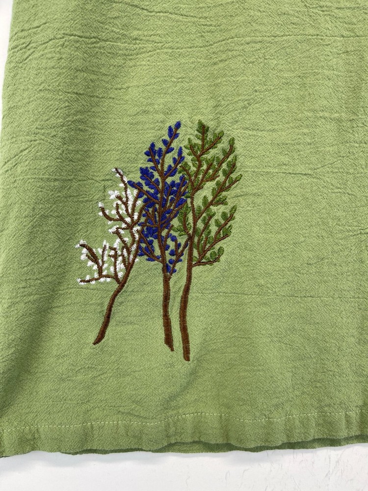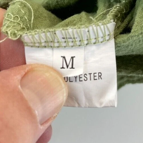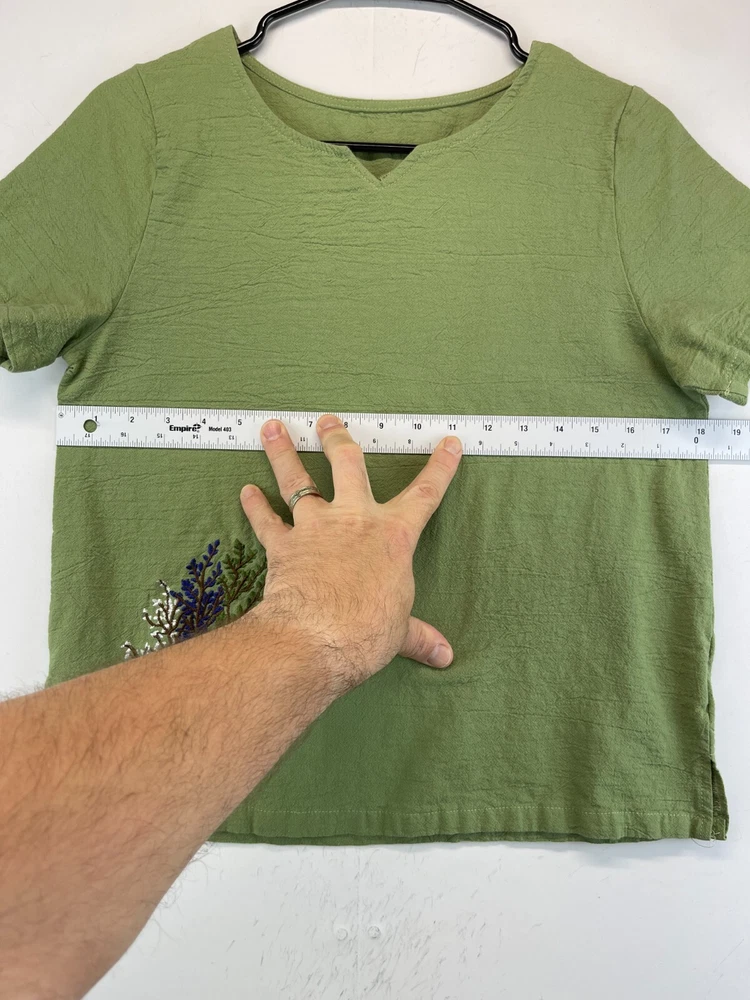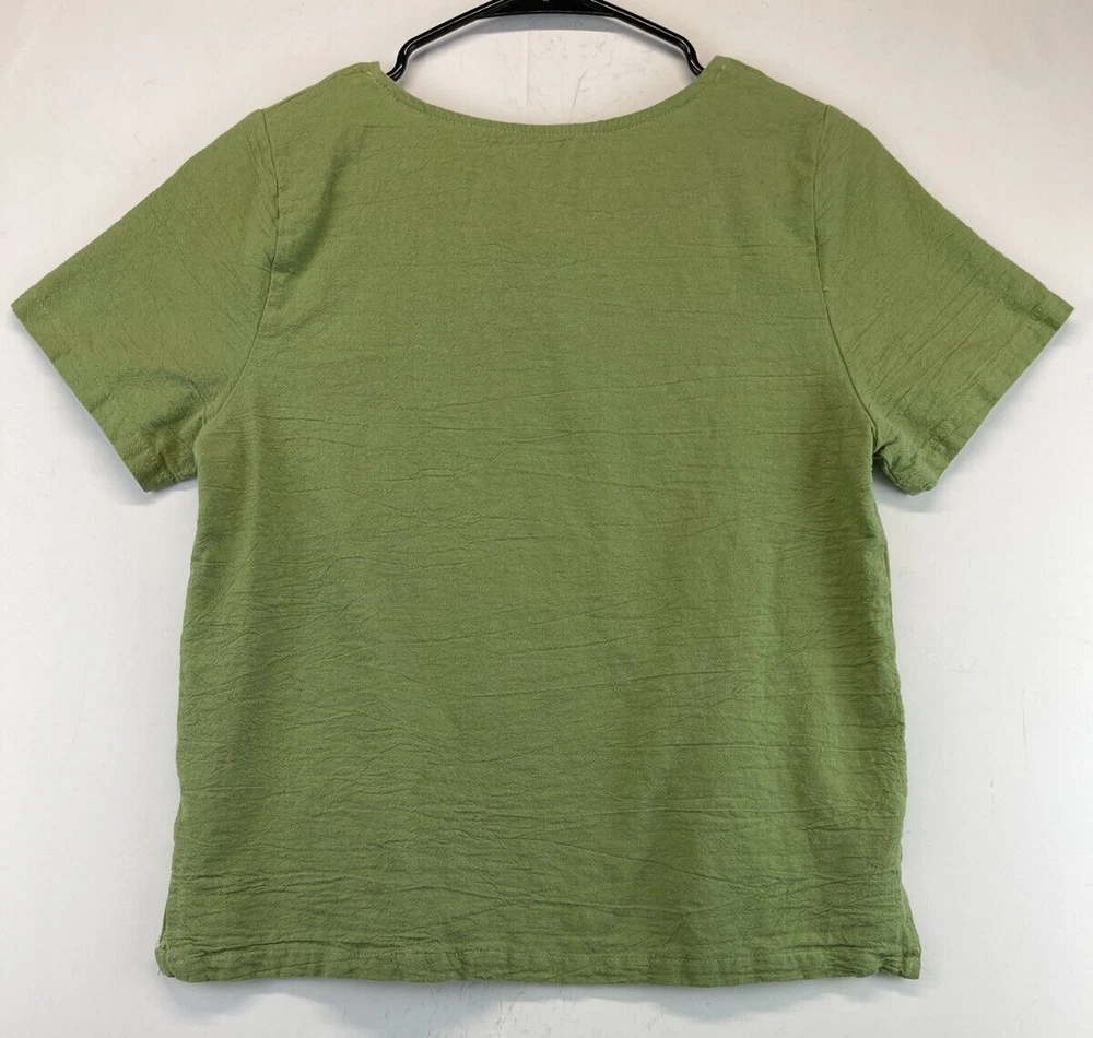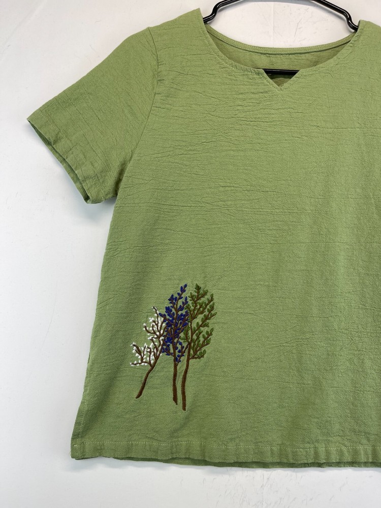This olive green polyester shirt for women features beautiful embroidered flowers and a relaxed fit, making it perfect for any casual occasion. The short-sleeved blouse has a V-neckline and a pullover closure, making it easy to wear. It comes in a size M and is machine washable for easy care. The shirt is ideal for summer and spring seasons and is suitable for travel, party/cocktail, and outdoor activities. The bohemian and nature-inspired theme of the shirt makes it a perfect addition to any wardrobe. Made in China, this shirt is a must-have for any fashion-conscious woman. Very good preowned condition with no issues. Please see all photos. For clothing specifically, see photos for all measurements and/or any issues if applicable. Pay close attention to the measurements as the size of the garment may quite possibly be different than the actual measurement(s) due to washing, shrinkage, or stretching as these are used clothes. The size in the title is the size on the tag of the garment. See photos for measurements of actual measurements as they may differ. ALWAYS CHECK THE MEASUREMENTS IN THE PHOTOS. This will remove any questions on measurements as well as always cover the possibility of human error in the listing(s) in the case of a typo or oversight. All clothing has been washed and comes from a smoke free environment. I am available for questions. I accept or negotiate reasonable offers. Have an amazing day. Thank you.