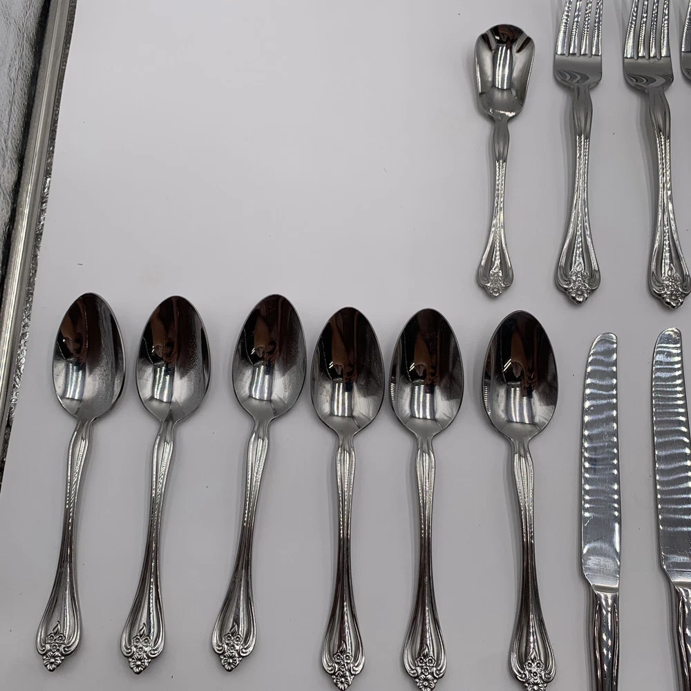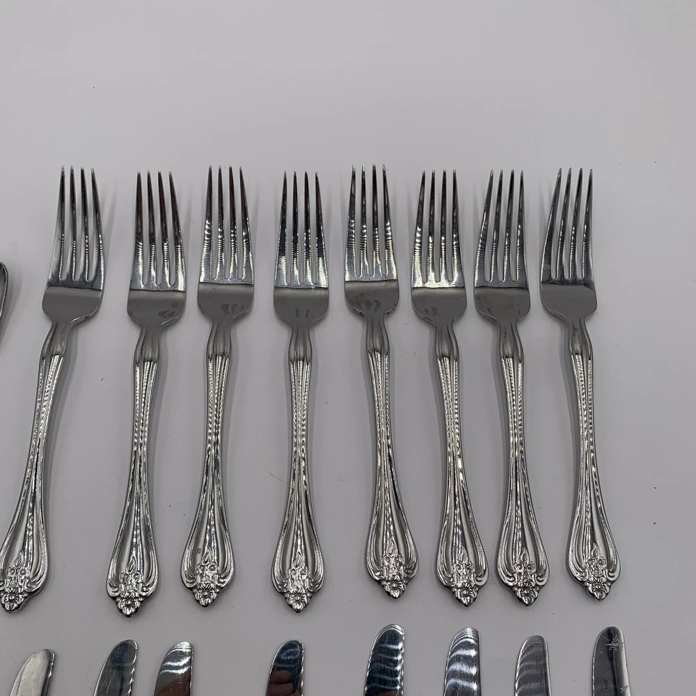 Oneida BOUTONNIERE Glossy Stainless Dinner Knives Forks Spoons Flatware Set!! ****See pictures for imperfections some dark marks. Might be able to be polished Dinnerware, flatware, set, silverware
