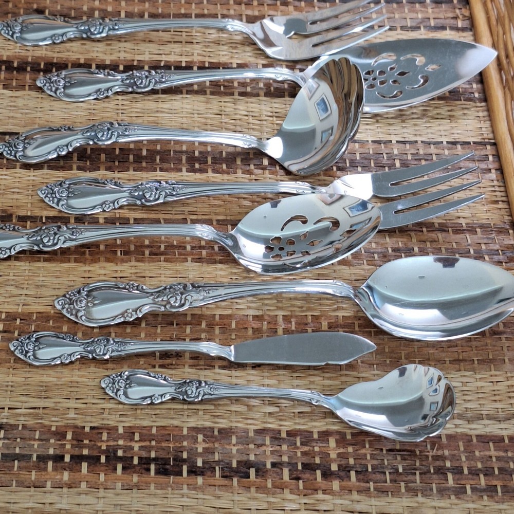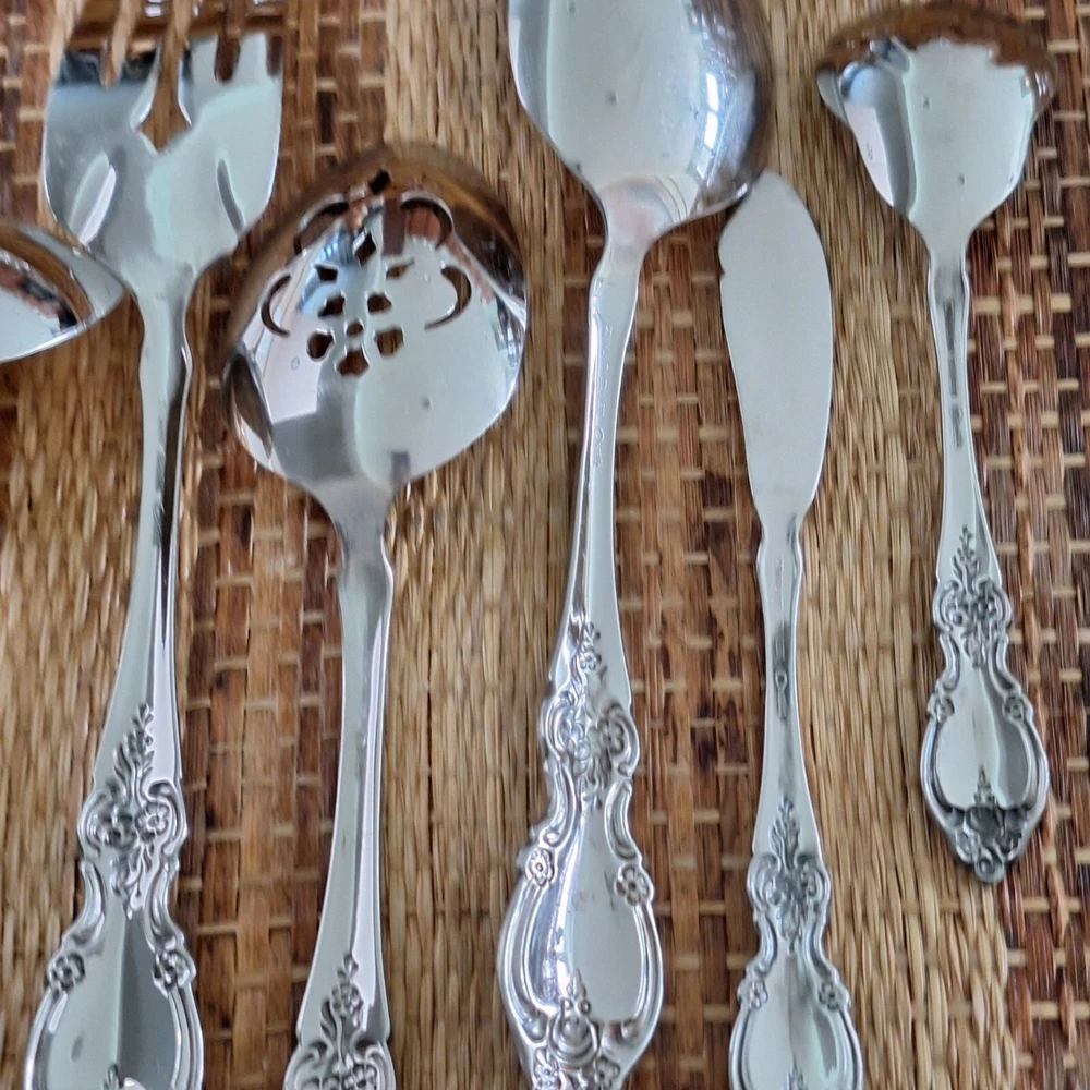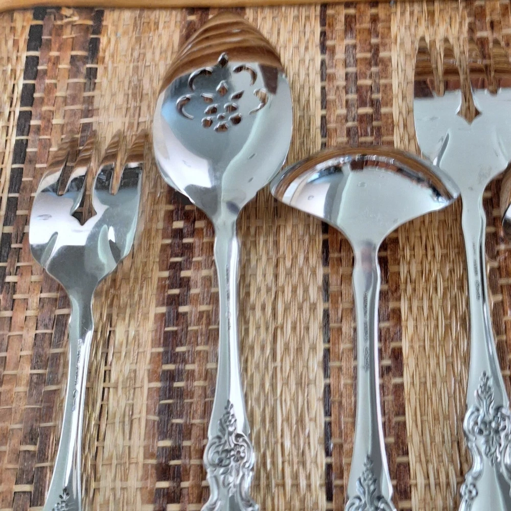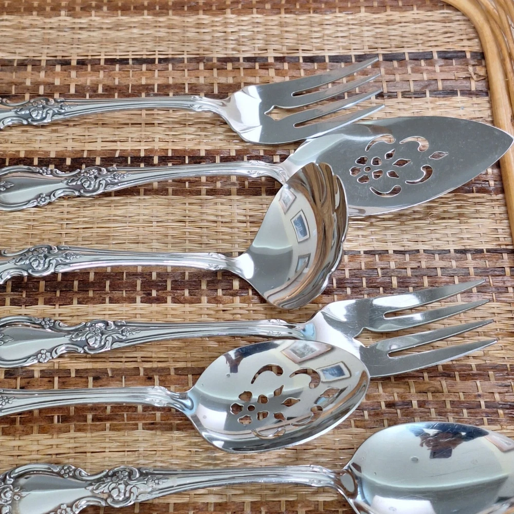 • Includes 8 pieces: forks, spoons, and more • Ornate floral handle design • Stilver-plated finish for a polished look • Ideal for serving or display purposes • Easy to clean and maintain Set includes: 2 forks (8"), 2 serving spoons (8.5"), 1 pie server (9"), 2 slotted spoons (8.5"), 1 ladle (7.5"), 1 butter knife (6.5"), 1 sugar spoon (6"). Please review all photos for condition as part of the description.