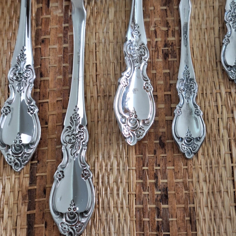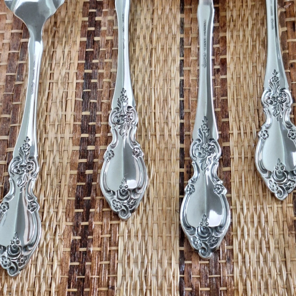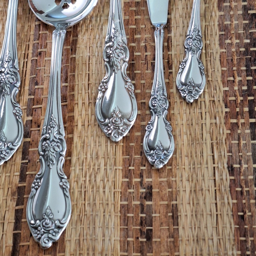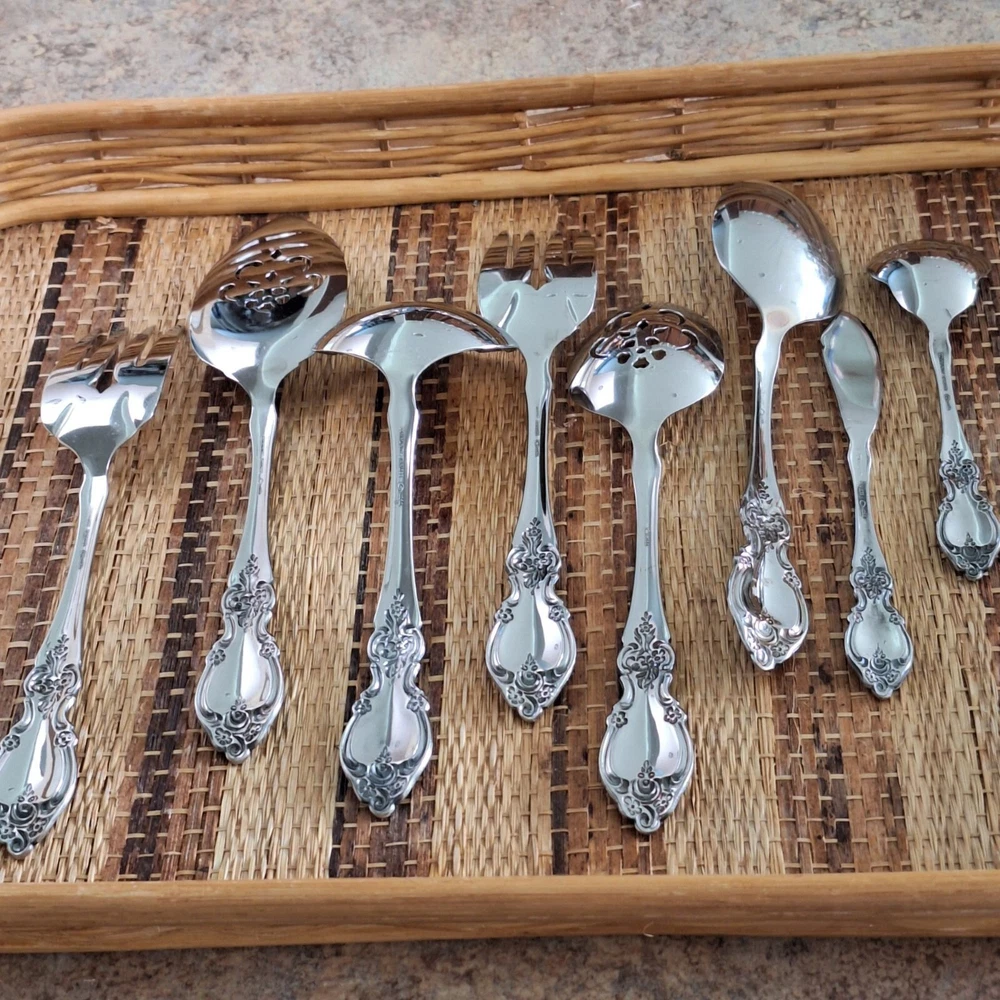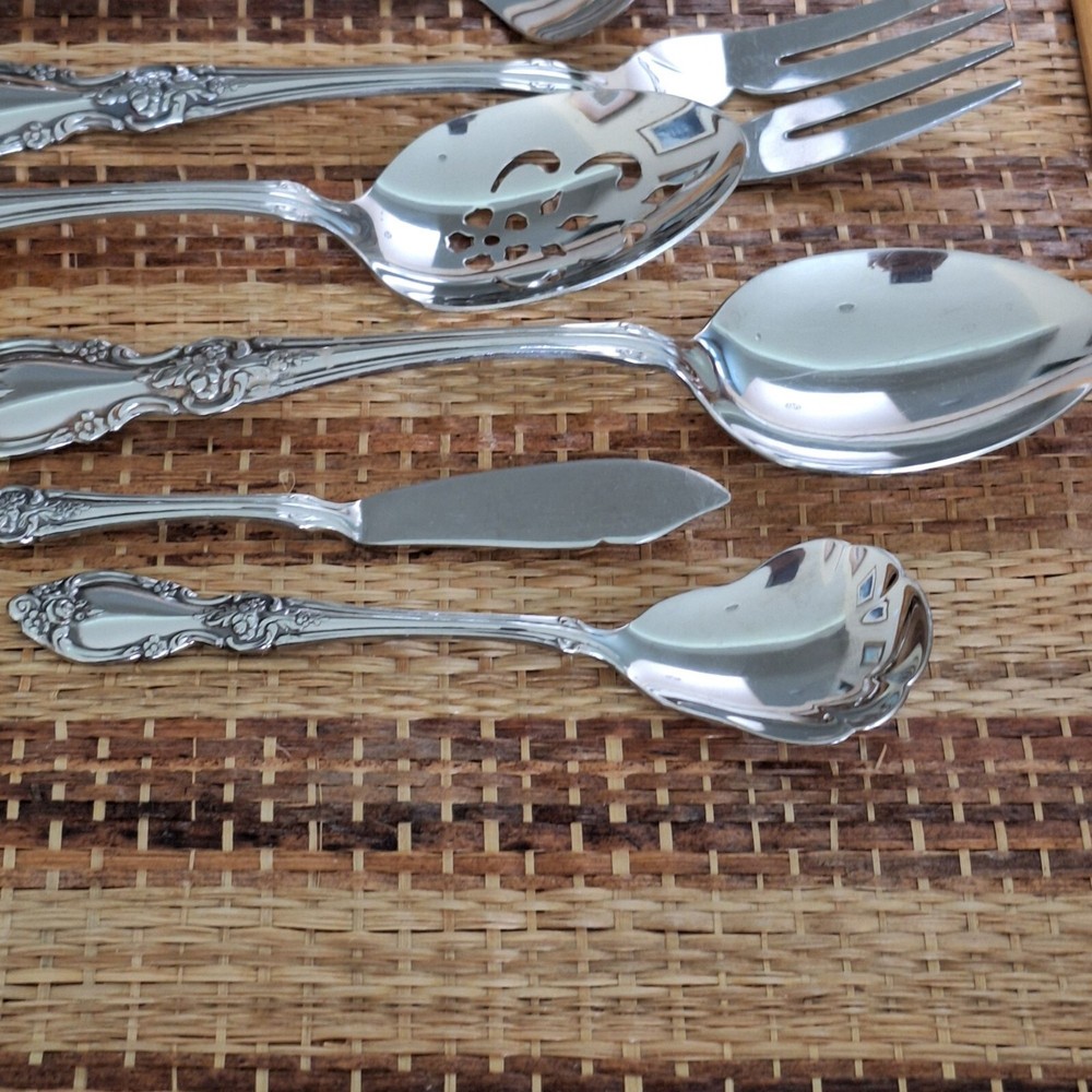 • Includes 8 pieces: forks, spoons, and more • Ornate floral handle design • Stilver-plated finish for a polished look • Ideal for serving or display purposes • Easy to clean and maintain Set includes: 2 forks (8"), 2 serving spoons (8.5"), 1 pie server (9"), 2 slotted spoons (8.5"), 1 ladle (7.5"), 1 butter knife (6.5"), 1 sugar spoon (6"). Please review all photos for condition as part of the description.