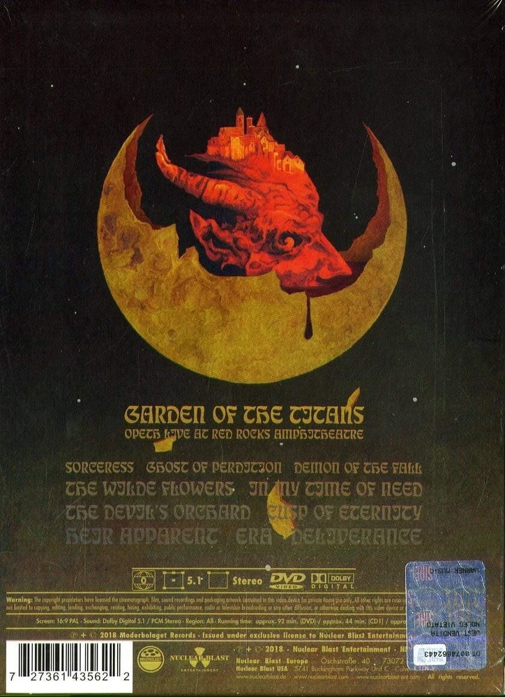 Further Details Title: Garden of the Titans (Live) Artist: Opeth Format: CD Condition: New Number Of Discs: 3 Release Date: 11/02/2018 Genre: Rock Sub Genre: Prog Label: Nuclear Blast Description: PRODUKTBESCHREIBUNGEN Disco en directo de opeth grabado en el mítico anfiteatro red rocks de denver (colorado) el 11 de mayo del 2017. El show fue filmado por the deka brothers (carpenter brut, the prodigy), y el audio producido por david castillo (katatonia, bloodbath). La portada es obra del reconocido diseñador de portadas metaleras travis smith. A la venta en varias ediciones; caja de edición limitada con 2cd+dvd+bluray+libreto, edición limitada 2cd+bluray en digipack, edición limitada 2cd+dvd digipack y edición limitada doble vinilo de 180 gramos. Estilo metal - limited edition earbook track listing: blu-ray: 1.sorceress (live)/2.ghost of perdition (live)/3.demon of the fall (live)/4.the wilde flowers (live)/5.in my time of need (live)/6.the devil’s orchard (live)/7.cusp of eternity (live)/8.heir apparent (live)/9.era (live)/10.deliverance (live) dvd: 1.sorceress (live)/2.ghost of perdition (live)/3.demon of the fall (live)/4.the wilde flowers (live)/5.in my time of need (live)/6.the devil’s orchard (live)/7.cusp of eternity (live)/8.heir apparent (live)/9.era (live)/10.deliverance (live) cd1: 1.sorceress (live)/2.ghost of perdition (live)/3.demon of the fall (live)/4.the wilde flowers (live)/5.in my time of need (live) cd2: 1.the devil’s orchard (live)/2.cusp of eternity (live)/3.heir apparent (live)/4.era (live)/5.deliverance (live) - limited blu-ray/cd digipack track listing: blu-ray:1.sorceress (live)/2.ghost of perdition (live)/3.demon of the fall (live)/4.the wilde flowers (live)/5.in my time of need (live)/6.the devil’s orchard (live)/7.cusp of eternity (live)/8.heir apparent (live)/9.era (live)/10.deliverance (live) cd1: 1.sorceress (live)/2.ghost of perdition (live)/3.demon of the fall (live)/4.the wilde flowers (live)/5.in my time of need (live) cd2: 1.the devil’s orchard (live)/2.cusp of eternity (live)/3.heir apparent (live)/4.era (live)/5.deliverance (live) - limited dvd/cd digipack track listing: blu-ray:1.sorceress (live)/2.ghost of perdition (live)/3.demon of the fall (live)/4.the wilde flowers (live)/5.in my time of need (live)/6.the devil’s orchard (live)/7.cusp of eternity (live)/8.heir apparent (live)/9.era (live)/10.deliverance (live) cd1: 1.sorceress (live)/2.ghost of perdition (live)/3.demon of the fall (live)/4.the wilde flowers (live)/5.in my time of need (live) cd2: 1.the devil’s orchard (live)/2.cusp of eternity (live)/3.heir apparent (live)/4.era (live)/5.deliverance (live) - lp disc 1 track listing:side a: 1.sorceress (live)/2.ghost of perdition (live) side b:1.demon of the fall (live)/2.the wilde flowers (live)/3.in my time of need (live) lp disc 2 track listing: side c: 1.the devil’s orchard (live)/2.cusp of eternity (live)/3.heir apparent (live) side d: 1.era (live)/2.deliverance (live) Tracks: Disc 1 1: Sorceress 2: Ghost of Perdition 3: Demon of the Fall 4: The Wilde Flowers 5: In My Time of Need Disc 2 1: The Devil's Orchard 2: Cusp of Eternity 3: Heir Apparent 4: Era 5: Deliverance Disc 3 1: Sorceress 2: Ghost of Perdition 3: Demon of the Fall 4: The Wilde Flowers 5: In My Time of Need 6: The Devil's Orchard 7: Cusp of Eternity 8: Heir Apparent 9: Era 10: Deliverance DVDs ARE REGION 1 UNLESS OTHERWISE STATED Missing Information? Please contact us if any details are missing and where possible we will add the information to our listing.