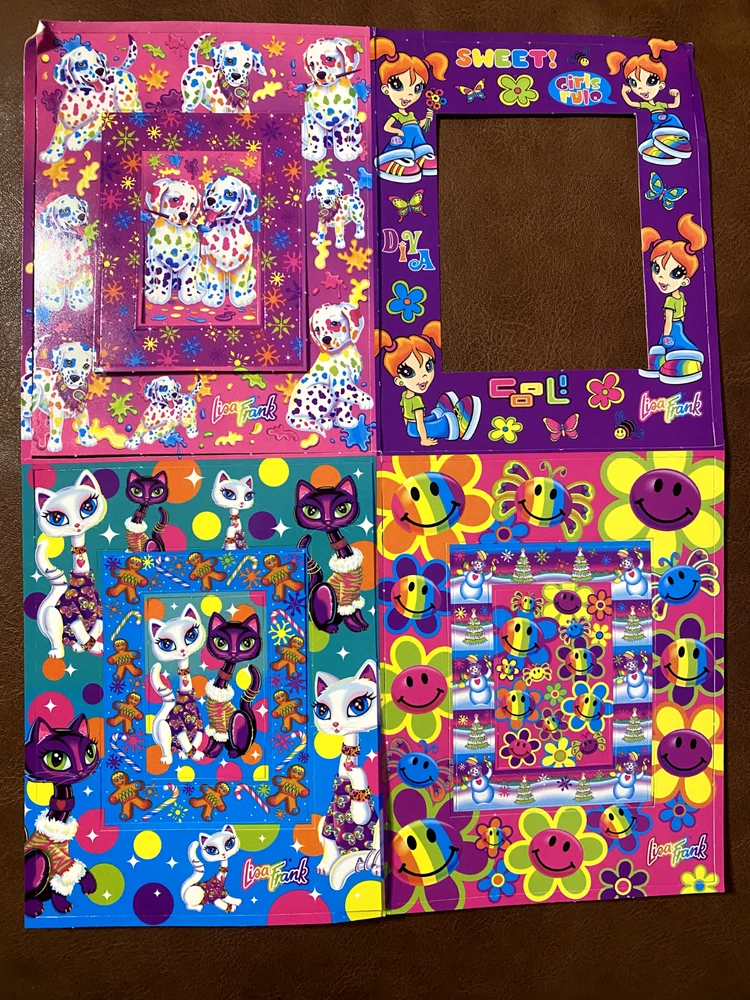 2 incomplete sheets from original 90's Lisa Frank Pop-Out collection (not stickers). Includes Dalmatian dogs, cats, pegasus, and other classics.