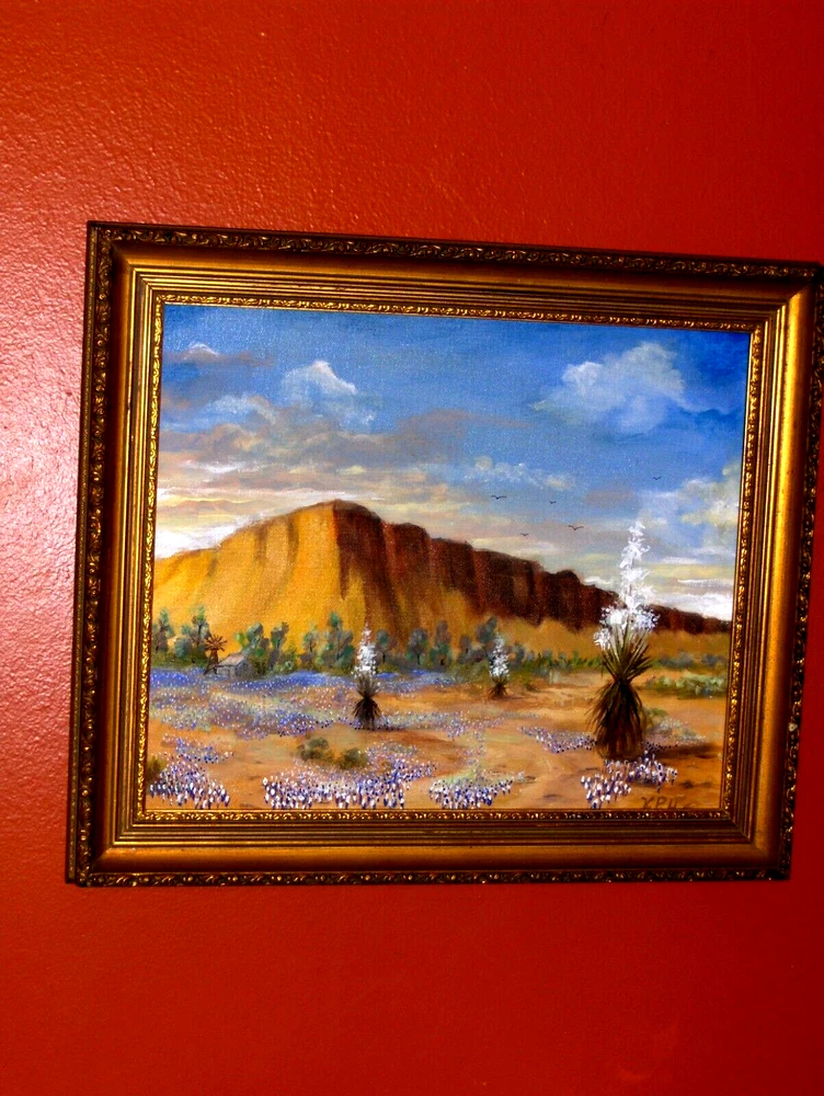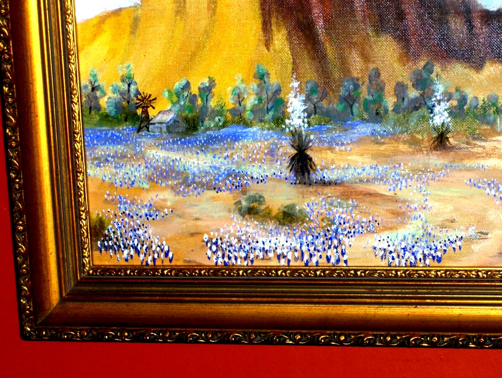 Bl uebonnet Landscape: Rural House, Water Will , Birds, Blooming Yucca, Rocks TX VINTAGE Oil on Canvas panel Excellent for your house!!! Or… Excellent Gift to make somebody happy!!! FAST SHIPPING!! Old Vintage Bluebonnet Landscape! GREAT VISION! Absolutely GORGEOUS ON THE WALL! A CLASSIC STYLE! This is an amazing impressionist painting, framed & ready to hung! Very beautifully done and very decorative. We feel deep emotions captured in this painting and they radiate a mysterious atmosphere. What a harmonious and peaceful landscape! It could remind us about a happy time in life! Signature is on the right side, but is very hard to read:K. P. H. This is an authentic handmade painting, not a giclee, not a reproduction! Medium Size for the frame, circa 20 x 17 Inches, and the painting inside is 17 x 14. Painting is in very good used condition, with minor imperfections, but none noticeable. THE FRAME IS FREE OF CHARGE, as complimentary to the painting! The payment is for the artwork only, not for the frame. We are always offering the frame as a gift, so you will have it at no additional cost, coming with your painting! It is in very good condition, with minor imperfections, tiny scratches and stains, but nothing noticeable. Very Elegant Painting! Just a beautiful piece - don't miss this one. Please enjoy checking on my other items and let me know if you would like any additional information. Thank you!