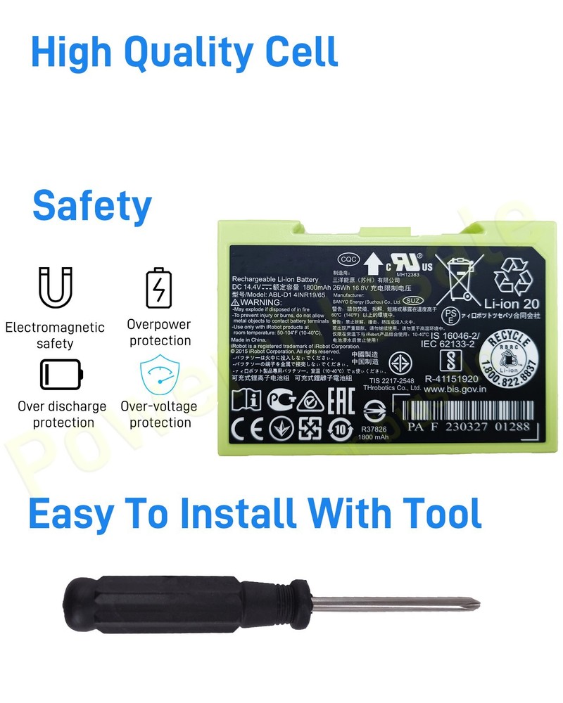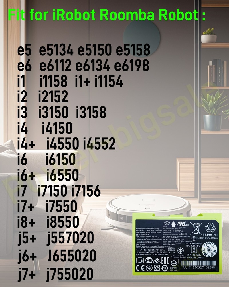 Condition: OEM New . Votage:14.4V Capacity: 1800mAh (26Wh) Color:Green Package: 1x Battery & 1x Screwdriver New bulk package, no retail box. Compatible With: iRobot Roomba Robot Vacuum e5 e5134 e5150 e5158 iRobot Roomba Robot Vacuum e6 e6112 e6134 e6198 iRobot Roomba Robot Vacuum i1 i1158 i1+ i1154 iRobot Roomba Robot Vacuum i2 i2152 iRobot Roomba Robot Vacuum i3 i3150 i3158 iRobot Roomba Robot Vacuum i3+ i3550 i3556 i3558 iRobot Roomba Robot Vacuum i4 i4150 iRobot Roomba Robot Vacuum i4+ i4550 i4552 iRobot Roomba Combo i5+ i557020 iRobot Roomba Robot Vacuum i6 i6150 iRobot Roomba Robot Vacuum i6+ i6550 iRobot Roomba Robot Vacuum i7 i7150 i7156 iRobot Roomba Robot Vacuum i7+ i7550 iRobot Roomba Robot Vacuum i8+ i8550 iRobot Roomba Combo j5+ j557020 iRobot Roomba Robot Vacuum j6+ J655020 iRobot Roomba Robot Vacuum j7+ j755020 ...... Note: 1. In case of any issues, please feel free to contact us through eBay. Your satisfaction is our goal. 2.Business Hours : Monday - Friday 9:00 ~ 22:00 CLOSED ON WEEKENDS & HOLIDAYS
