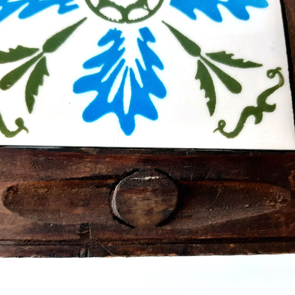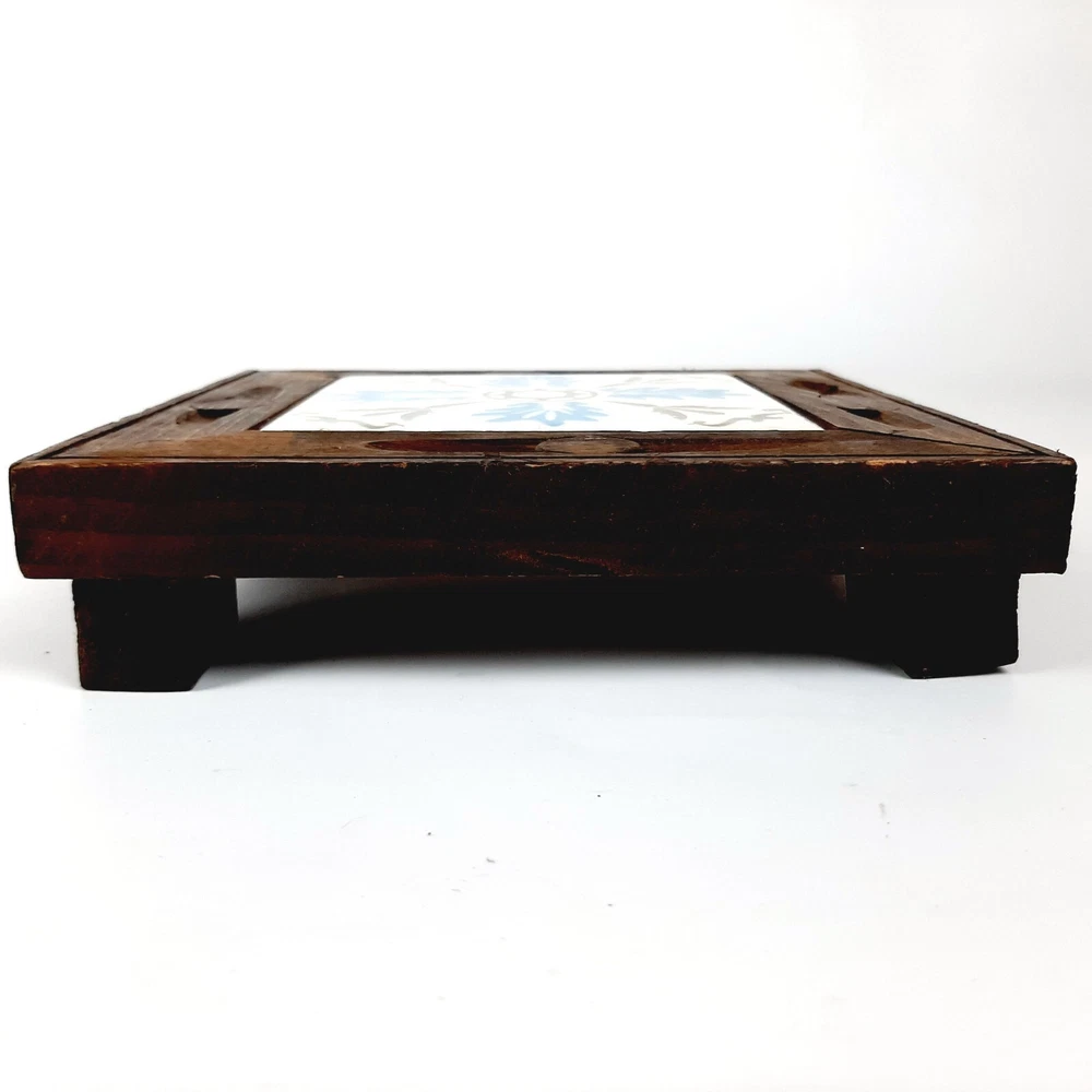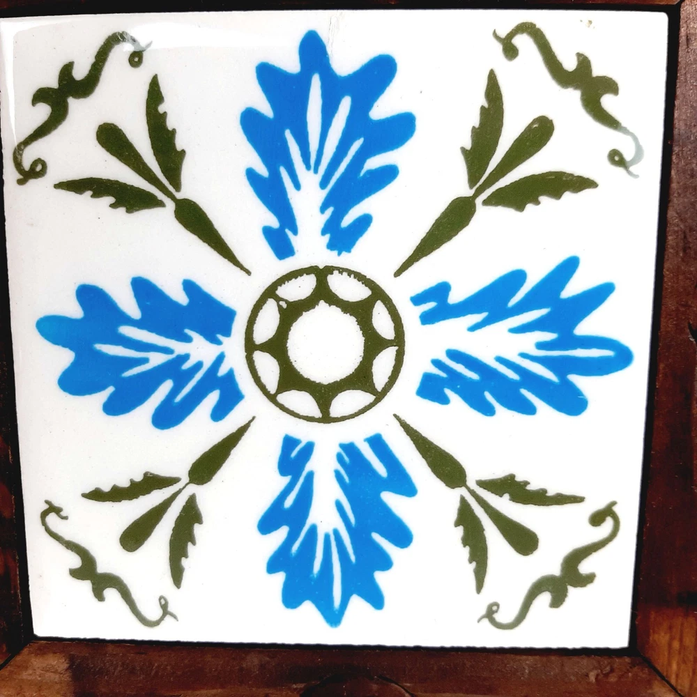 Square Blue White & Olive Green Ceramic Orion Trivet Wood Frame Monterey Mexico Measures approximately 6.75" x 6.75" x 1.5" tall Great condition with only minor discoloration/weathering of wood frame which just adds to its bcharacter