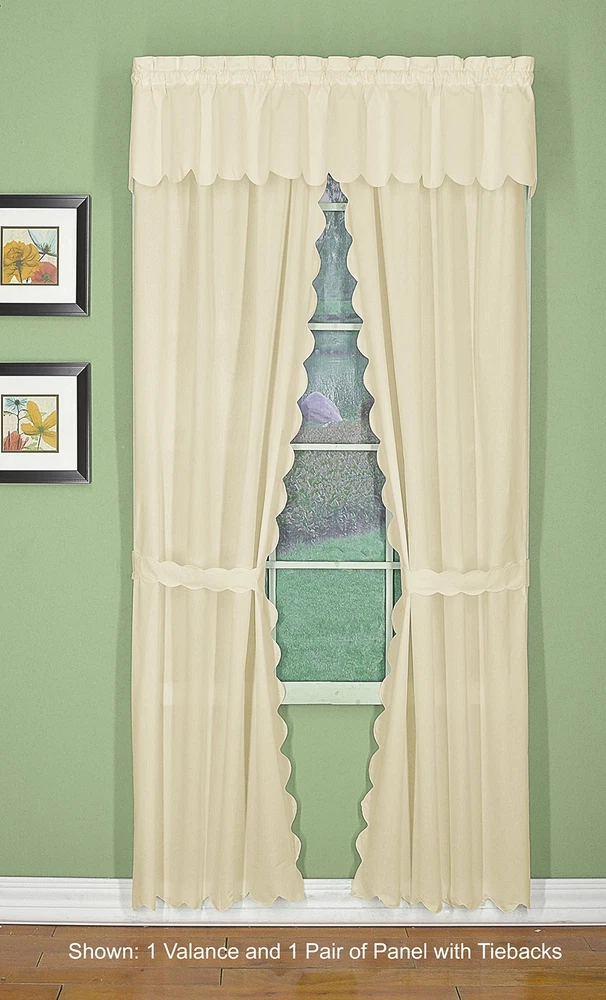 Orleans: tambour scallop edge curtain a classic look reminiscent of the Cape Cod curtain in style but with an updated design. This 50percent cotton 50percent polyester tambour scallop edge curtain will bring grace and elegance to any room. Every piece is beautifully embellished with scalloped edge bottom and/or side. Swags, valances and fan inserts are available to create your own favorite combinations of window toppers. Tiers in 30 inch and 36 inch come with pair of tiebacks. Panel pairs comes with pair of coordinated tiebacks! each piece hangs with a rod pocket and fit a rod up to 1 inch in diameter. Available in colors: white, ecru, sage, Buttercup, brick red and linen. Machine washable, easy care. Panel pair with tiebacks, valances, swag pair, Tier pair and fan insert are sold separately. 65Percent polyester; 35Percent cotton Engineered Tambour Scallop Edges Solid color, poly-cotton blend, Easy care-machine washable Engineered tambour scallop edges in L shaped panel pair, 2 tiebacks included, 4-piece-set