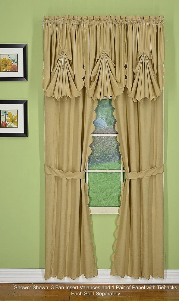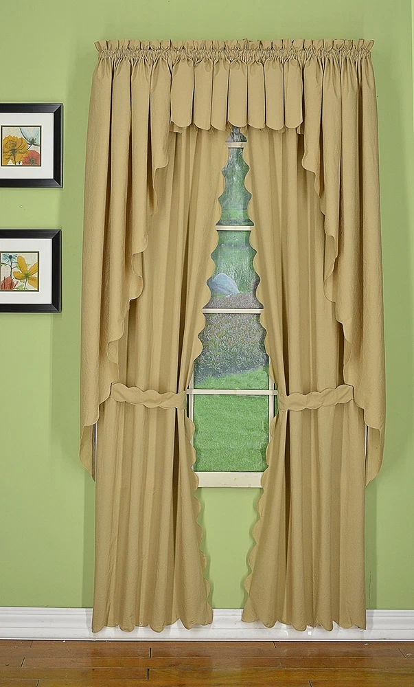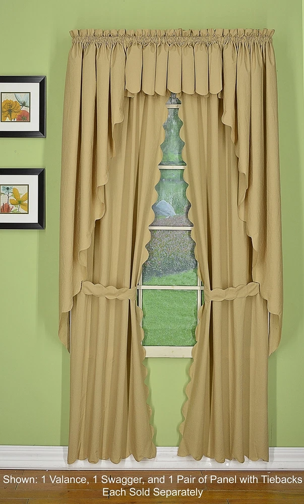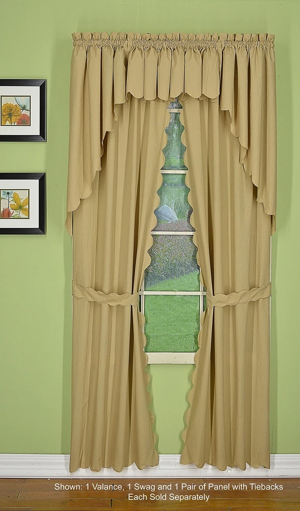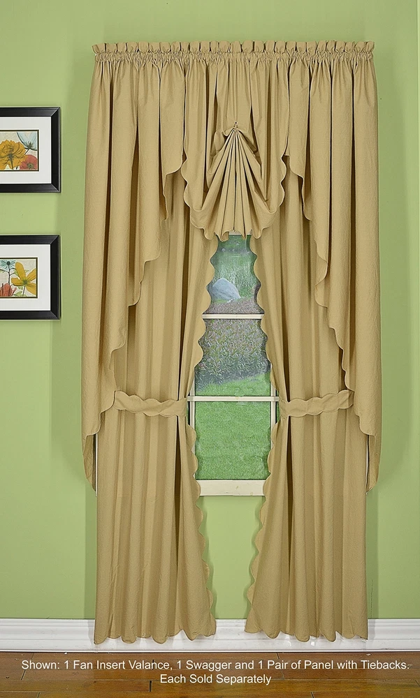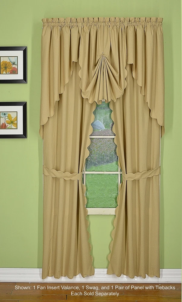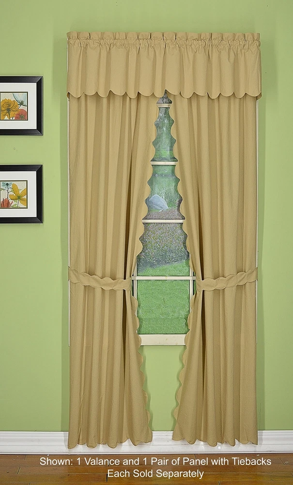 Orleans: tambour scallop edge curtain a classic look reminiscent of the Cape Cod curtain in style but with an updated design. This 50percent cotton 50percent polyester tambour scallop edge curtain will bring grace and elegance to any room. Every piece is beautifully embellished with scalloped edge bottom and/or side. Swags, valances and fan inserts are available to create your own favorite combinations of window toppers. Tiers in 30 inch and 36 inch come with pair of tiebacks. Panel pairs comes with pair of coordinated tiebacks! each piece hangs with a rod pocket and fit a rod up to 1 inch in diameter. Available in colors: white, ecru, sage, Buttercup, brick red and linen. Machine washable, easy care. Panel pair with tiebacks, valances, swag pair, Tier pair and fan insert are sold separately. 65Percent polyester; 35Percent cotton Engineered Tambour Scallop Edges Solid color, poly-cotton blend, Easy care-machine washable Engineered tambour scallop edges in L shaped panel pair, 2 tiebacks included, 4-piece-set