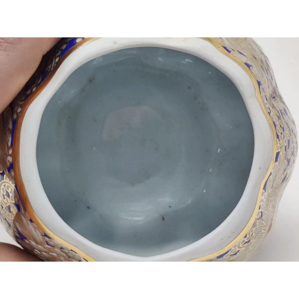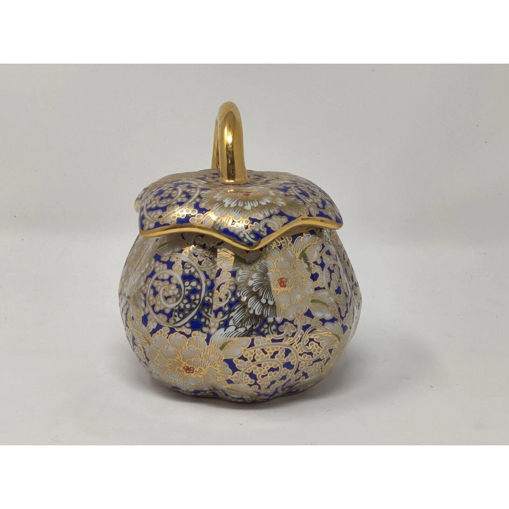This is a hand painted pumpkin shaped trinket box. The colors are blue, gold, and red in a floral design. The trinket box is in immaculate condition as pictured. Hand painted in Thailand. The box measures 3 3/4" tall, 5" diameter. 5 1/2" tall with lid. CROSSPOSTED THANKS FOR VIEWING!