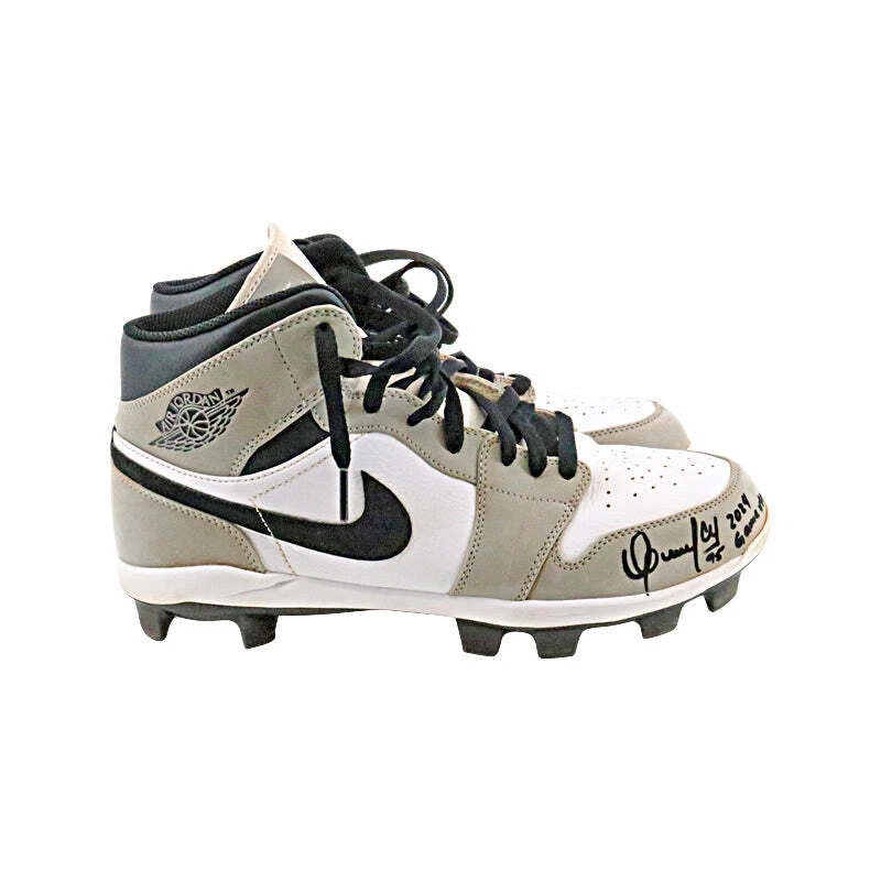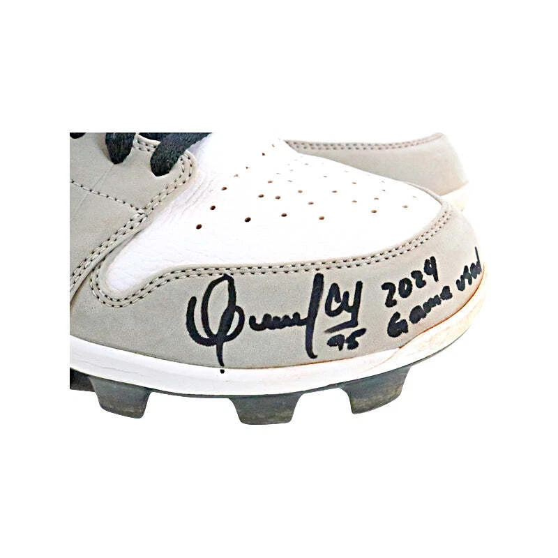 Oswaldo Cabrera New York Yankees Autographed Signed Inscribed Nike Air Jordan 1 Black/Gray/White Game Used Cleats (CX Auth/Cabrera LOA) CX Auth #A156725 & A156726. Left Shoe has 2024 Road Game Inscription. Right Shoe has 2024 Game Used Inscription.
