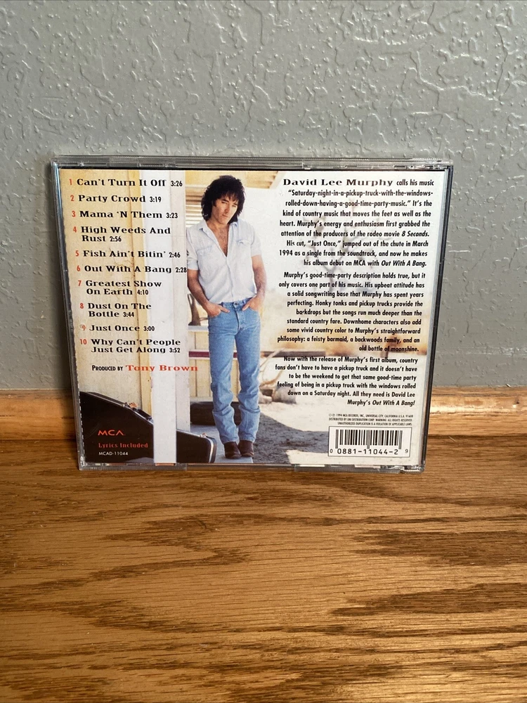 Record Label:Mcan, MCA NashvilleUPC:0008811104429Producer:Tony BrownGenre:CountryArtist:Murphy, David LeeRelease Title:Out with a Banggtin13:0008811104429Format:CDRelease Year:1994