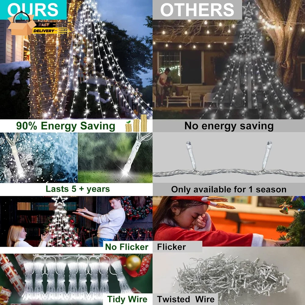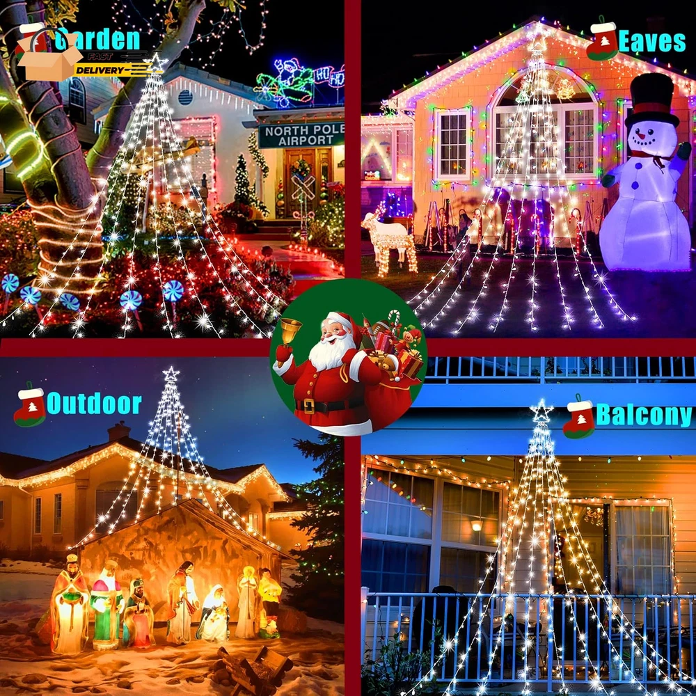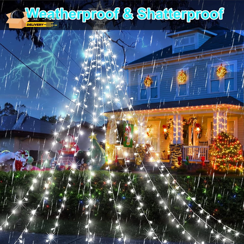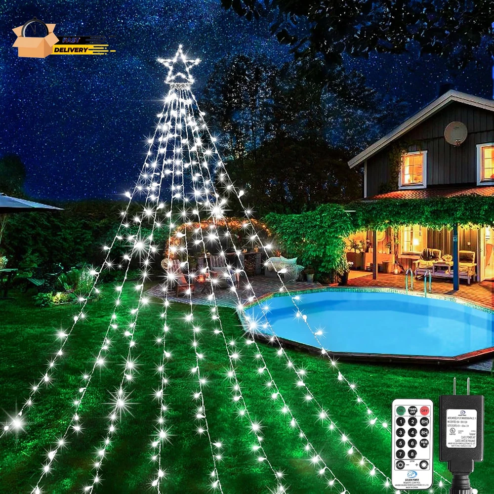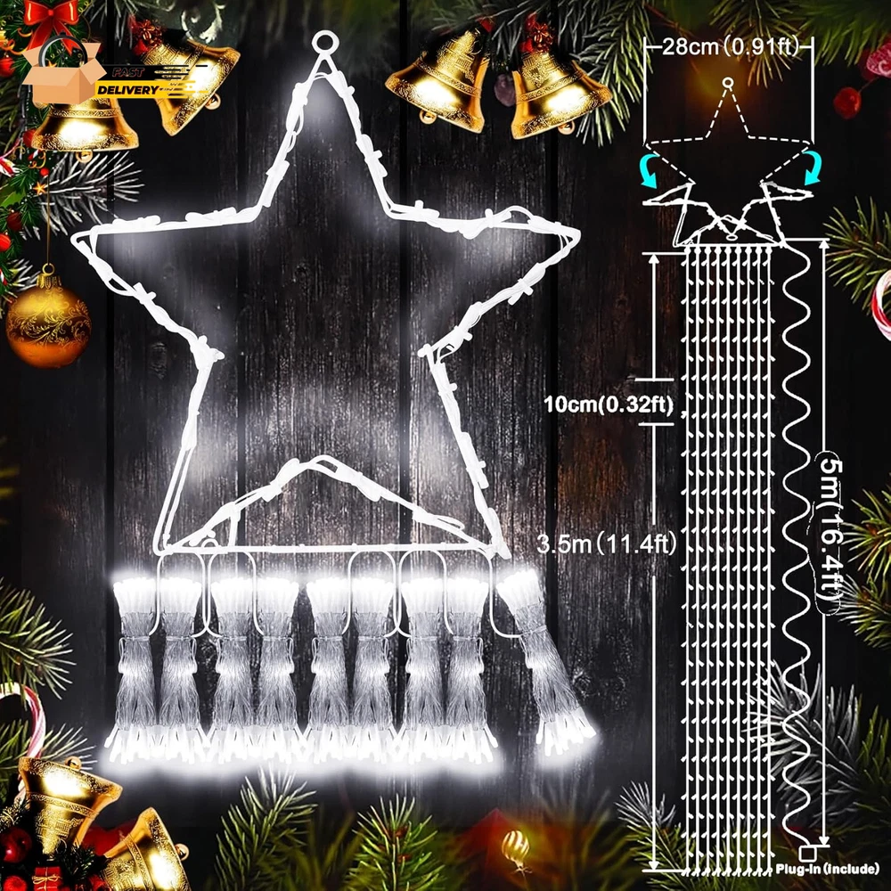 Store New Arrivals Add to Favorite View Feedback Contact Outdoor Christmas Decorations Waterfall Star Lights,344 LED 8 Modes Tree Light,Plug in Clear Wire Waterproof Seasonal Lighting Decor for Xmas Tree Wedding Yard Holiday Garden Cool White Description Item model number BG-CL3M3-306L01 Item dimensions L x W x H 12.4 x 2.1 x 13 inches Number of Light Sources 344 Light Color cool white Item Dimensions 12.4 x 2.1 x 13 inches Color Cool White Material Type Plastic, Copper Product Dimensions 12.4 x 2.1 x 13 inches; 1.41 Pounds Material Plastic, Copper Country of Origin China Theme Star Voltage 29 Volts Recommended Uses For Product Outdoor Indoor Use Holiday Use Innovative Design:12ft Christmas tree lights with 344LEDs beads, and 16.4ft plug cord, It consists of a foldable star-shaped light and 9 string lights, The large star ornament is about 12in,each string light drops 11.5ft.unique folding design,allowing for easy storage and setup.nine strings of flash lights that cascade gracefully from the top,creates a warm and inviting atmosphere,making it ideal for family gatherings,holiday parties,or simply enjoying a cozy evening at home 8 Lighting Modes and Timer Function:Christmas decorations outside lights are available in a 8 lighting modes: Combination,In Waves,Sequential,Slo-Glo,Chasing/Flash,Slow Fade,Twinkle/Flash and steady on.Combine multiple lighting modes,you can easily customize the ambiance to suit any occasion.Enjoy hassle-free decorating with the built-in timer function,which automatically turns the lights on for 6 hours and off for 18 hours Waterproof and Memory Function:IP44 outdoor waterproof designed,which is very perfect for outdoor decor and can work normally even in cold winter.Memory function is recover from the previous setting mode when you restart.Great for Christmas decoration,Thanksgiving,Wedding,Valentine's Day,and more.This is the most classic style,lighting up the eave,tree,wall,deck,balcony,Christmas tree,creates a charming atmosphere Dimming and Safer:Our Christmas decorative lights come with a versatile brightness adjustment function, 100%-75%-50%-25% 4 level brightness adjustable,allowing you to customize the glow to suit your festive mood.UL Listed Plug and Low-temp LED bulbs ensures safe to touch even after long time use.Allows you to save time and effort.Safer to use Package Includes:1XChristmas decorations lights,1Xplug,These Christmas tree lights are incredibly versatile,Use them to adorn your Christmas tree,or drape them over outdoor trees and shrubs.Perfect for holiday parties,family gatherings,or simply brightening up your home,they add a festive touch wherever they are placed Product Description Budget-friendly string lights abound, but KNONEW Commercial String Lights manage to be inexpensive without looking cheap. Getting to Know the Christmas Decorations Amazing Size : This Christmas tree light star is 12in high, with 9 sets of 11.4ft long strings, 0.33ft bead spacing, 16.4ft power extension cord length, 344 bright LEDs in total. Convenient Integrated Plug : The Christmas lights have 8 lighting modes (flashing, twinkle, waves, sequential, slow-glow, chasing, slow fade and steady on.) That can be switched by pressing the white button on the integrated plug. Safer At Low Pressure : The 29V low voltage output of the UL listed power adapter LED Christmas lights provides double security for you and your loved ones. High Efficiency & Low Energy Consumption LED : High quality LED beads reduce your energy waste by 90% and keep you away from high electricity bills. Year-round Outdoor Use : Christmas waterfall star lights can be used in outside for a full year and you will impressed with how well they endured through record-breaking heat, rain, and cold. It's not Christmas without Christmas tree lights Decorating the Christmas tree is definitely the most anticipated thing in the winter for the little ones in the family. Romantic Christmas decorative lights can turn an ordinary place into a festive corner, bringing a real sense of joy and excitement and filling your home with the wonderful scent of the season. Enjoy warm colors, away from Glare and Flicker! We select only the best quality LEDs to provide warm colors, bright and stable light output for eye comfort. Enjoy the beauty of the holidays while keeping you away from Flicker and Glare. Pure Color & Tidy Wire Safer For Home Use Weather Resistance The most special gift for the most loved family and friends! They're sure to fall in love with the wonderful gift that adds sparkle, joy and wonder to their homes right away. ABOUT US We offer the best prices around on high quality products. Our E-store includes media such as books, movies, music and games while offering electronics, toys, sporting apparel, clothing, tools, general home, garden items and more. SHIPPING We are always working hard to ensure your package arrives as soon as possible. Please understand that some factors like weather, high postal traffic, and the performance of shipping companies are outside of our control. We offer free shipping to the lower 48 states and ship within 2 business days of payment, usually sooner. We do not accept P.O. Boxes. Please provide a physical address. For shipping outside of the continental USA, we only use eBay's Global Shipping Program.The item is shipped to KY and then sent to the rest of the world. International customers are responsible for all duties and taxes. Continue to check out in order to calculate costs for shipping the item to your country. Messages regarding eBay's Global Shipping Program MUST be directed at eBay EXCLUSIVELY. RETURNS We offer a 30-Day Return Policy on items which you are not completely satisfied with. You have the option for a full-refund or an exchange of the item. No returns are available on items shipped outside of the USA. PAYMENT We accept PayPal. CONTACT US This page content is yet to come Please ad us to your favorite seller and visit again later Thank You CUSTOMER SATISFACT