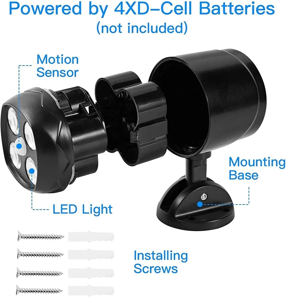 Store New Arrivals Add to Favorite View Feedback Contact Outdoor Motion Sensor Light Battery Operated, IP65 Waterproof Ultra Bright Description Light Source Type LED Style Modern Number of Items 1 Power Source Battery Powered Number of Light Sources 1 Material Type Acrylonitrile Butadiene Styrene Theme Modern Outdoor Lighting Lighting Method LED Finish Types Unfinished Controller Type Ring Unit Count 1.0 Count Room Type Garage Brand Name Hotomely Brand Hotomely Material Acrylonitrile Butadiene Styrene Batteries 1 Lithium Ion batteries required. Installation Type Wall Mount Model Name Motion Sensor Light Additional Features Motion Sensor Package Dimensions 7.17 x 4.65 x 4.37 inches; 12.63 ounces Light fixture form Spotlight Included Components Home outdoor lighting accessories Fixture Type Freestanding Brightness 600 lumen Country of Origin China Light Color White Water Resistance Level Waterproof Light Fixture Form Spotlight Bulb Base GU10 Shade Color White Mounting Type Wall Mount Color 1 Pack Indoor Outdoor Usage Outdoor Specific Uses For Product Garage, Patio Shape Oval Voltage 3.7 Volts Control Method Remote Shade Material Acrylonitrile Butadiene Styrene Manufacturer Hotomely Style Name Modern Size 1 Pack 【Super Bright Battery Powered Security Light】 The motion sensor light is equipped with 4 high power LED bulbs and 600lm super bright white light output, lightting up your entire garden, patio, walkways, garage or anywhere you need light at night. 【180°+360° Rotation Available】The mount of the sensor light outdoor can be rotated 180° and the light head can be rotated 360°. You can adjust the motion sensor light to the angels as you need. 【IP65 Waterproof】The battery operated outdoor lighting is made of highly durable ABS and it has added the sealing ring at the connecting parts which enables the battery motion sensor light outdoor to work perfectly in any severe weather. 【Intelligent Lighting Control System】The sensor light battery outdoor is equiped with the Smart PIR Motion Sensor. In the daytime, the battery outdoor motion lights will keep OFF. In the night time or darkness, the battery operated outdoor light will automatically be ON when motion is detected 5-7M and it would shut off automatically after 20-30 seconds if no motion is detected. 【Easy Installation】The battery operated wall light outdoor is very easy to use. You just need to prepare 4XD battery (No Included) and hang the battery operated motion spotlight on the wall(Installing Srews are Included), then it will work. Product Description 1.Please make sure your 4 D-Cell Batteries are placed correctly. 2. There might be difference of the illustration with the change of the hanging height. The picture shown in this listing is just a function display. 3.Lights would not turn on if there is enough brightness You can test whether the function works well in a dim environment. 4.The white part at the middle of the LEDs is the sensor part. Please DO NOT press it. Garage Led Spotlight Porch Flood Light Patio Motion Sensor Light ABOUT US We offer the best prices around on high quality products. Our E-store includes media such as books, movies, music and games while offering electronics, toys, sporting apparel, clothing, tools, general home, garden items and more. SHIPPING We are always working hard to ensure your package arrives as soon as possible. Please understand that some factors like weather, high postal traffic, and the performance of shipping companies are outside of our control. We offer free shipping to the lower 48 states and ship within 2 business days of payment, usually sooner. We do not accept P.O. Boxes. Please provide a physical address. RETURNS We offer a 30-Day Return Policy on items which you are not completely satisfied with. You have the option for a full-refund or an exchange of the item. No returns are available on items shipped outside of the USA. PAYMENT We accept PayPal. CONTACT US This page content is yet to come Please ad us to your favorite seller and visit again later Thank You CUSTOMER SATISFACTION We try our very best to make sure every customer is completely satisfied. If there's a problem, message us! We're happy to help.
