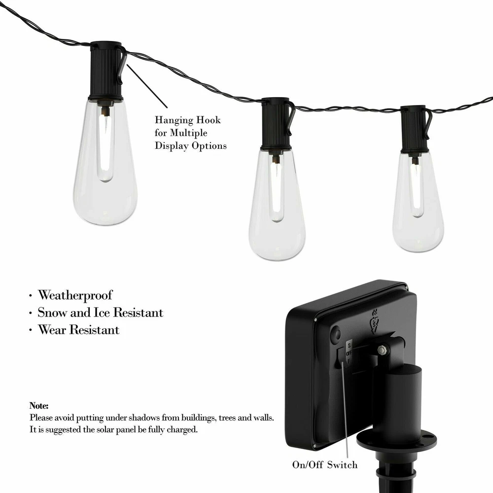 Outdoor Solar String Lights Vintage 4 Inch Edison Bulbs 14.5 Feet Hang Lighting Doing business on eBay since 2001 Outdoor Solar String Lights Vintage 4 Inch Edison Bulbs 14.5 Feet Hang Lighting Free Standard Shipping! 2 Day Shipping : 35 Next Day Air : 55 Product Details: BEAUTIFUL OUTDOOR ACCENT- The traditional string lights with vintage-style bulbs convert sunlight collected during the day to energy saving lighting at night. It is a decorative, yet practical accent that adds an inviting glow to any outdoor space. UNIQUE DECOR- The lights feature 2 lighting modes (flashing, steady on) and hanging hooks on the bulb for multiple display options. They create a unique look ideal for your backyard, patio, garden, deck, porch or even for events, parties or weddings! SOLAR POWERED - The hanging lights are solar powered and feature a rechargeable 1pc AA NI-MH 1.2V/400MAH battery. The battery charges by sunlight and automatically turns on in the evening for hassle-free illumination for 6-8 hours per use. WEATHERPROOF- These stylish vintage-inspired string lights are durable, and wear resistant for long-lasting use. The lights are weatherproof, and even snow and ice resistant, so are perfect for multi-season use, beyond just the warm summer months. PRODUCT DETAILS - Material: copper cable, Plastic. Cable Length: 14.5'. Bulb Size: 4.25" x 1.5". Battery: 1pc AA NI-MH 1.2V/400MAH Battery. Run Time: 6-8 Hours of Light. Set includes: Solar Panel, 10 lights, Stake for Solar Panel. Shipping We can only ship to the 48 states We normal have a 1-2 business day handling time We are unable to change an address after a package leaves Office and warehouse hours are Monday through Friday Contact Us Through Ebay Messages Only Hours Monday - Friday : 9:00 am - 5:00 pm EASTERN. 30-Day Limited Warranty If you have changed your mind, you may return this to us for any reason. If your item is damaged, or different than expected, please contact us through ebay messages We will be happy to assist with any question you have