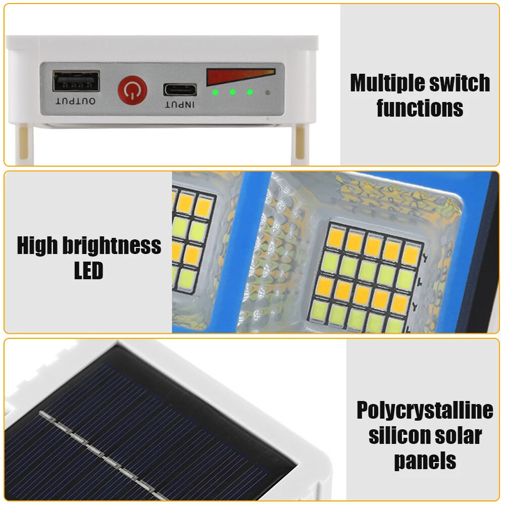 Features: 1. [Strong light source] Increase coverage range, 288 LED beads, high brightness, durable, 3000MA large capacity battery, powerful battery life of 12-36 hours. 2. [Solar power supply] 0 electricity bills, efficient conversion of high-quality solar panels, high photoelectric conversion rate, can reach over 79%, and quickly fill up after 4-6 hours of clear weather. 3. [USB output] can charge mobile phones, Type-C input, outdoor can be used for emergency charging of mobile devices such as phones for convenient use, compatible with computers/power banks/USB sockets/car charging. 4. [Light adjustment] Multi level adjustment to meet different scenarios, long press to turn on the dimming, warm light/neutral light/white light/warning light, and real-time battery level display. 5. [Fixed bracket] 180 ° freely adjustable, rotating freely, hanging freely, suitable for multiple scenarios, camping/construction site/car repair/decoration, etc Specifications: Light source: LED Luminous flux: 180 (LM) Luminescence efficiency: 180 (Lm/W) Power: 3000MAH, capable of emergency charging for 8-8.5 hours Color: Blue/White Package List: Emergency light * 1 On Feb 25, 2025 at 01:14:40 PST, seller added the following information: