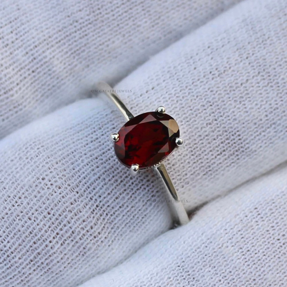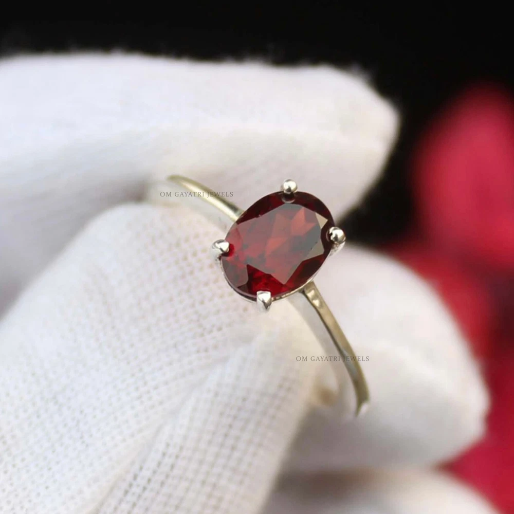 This is a handmade 925 sterling silver ring with a prong setting. The main stone is a natural eye-clean oval cut red garnet, measuring 9 mm in length and 7 mm in width, with a depth of 2 mm. The band width is 2 mm. The ring is antique, vintage, and stackable, with a bohemian and nature theme. It is perfect for various occasions such as engagement, wedding, anniversary, birthday, Valentine's Day, and Christmas. The ring is customizable, and the seller offers a warranty. Oval Cut Red Garnet Ring 925 Sterling Silver Handmade Minimalist Ring for Her Item: Ring Gemstone: Garnet Stone Shape: Red Stone Size: 7x9mm Stone Category: Faceted Metal: 925 Sterling Silver