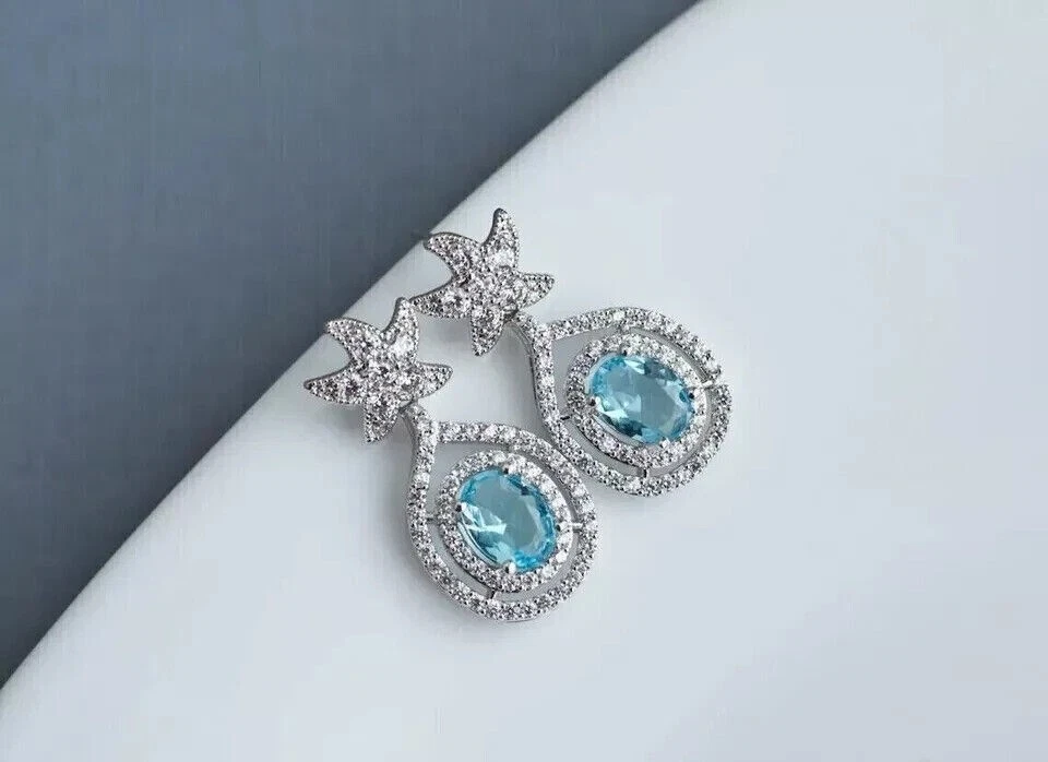 Main Stone Color: Blue Setting Style: Prong Style: Dangle/Drop Customized: Yes Country/Region of Manufacture: India Secondary Stone: Simulated Diamond Handmade: Yes Theme: Beauty Main Stone Shape: Oval Wholesale: Yes Type: Earrings Material: Stone, Metal, Gemstone Brand: sp_jewels Ear Area: Lobe Number of Gemstones: 2 Main Stone Creation: Simulated Color: White Occasion: Anniversary, Birthday, Christening, Christmas, Confirmation/Communion, Engagement, Graduation, Mother's Day, Valentine's Day, Wedding Vintage: No Seller Warranty: Yes Antique: No Seller Notes: ““Freshly made on order with quality and buyer satisfaction. No old stocks.”” Era: Undated Features: Engraved Base Metal: White Gold Plated Cut Grade: Excellent Main Stone Treatment: Not Enhanced Metal Purity: 925 Personalize: No UPC: Does Not Apply gtin13: Does Not Apply Metal: Sterling Silver MPN: NA Shape: Round Closure: Push Back Country of Origin: United States Signed: No Main Stone: Simulated Topaz
