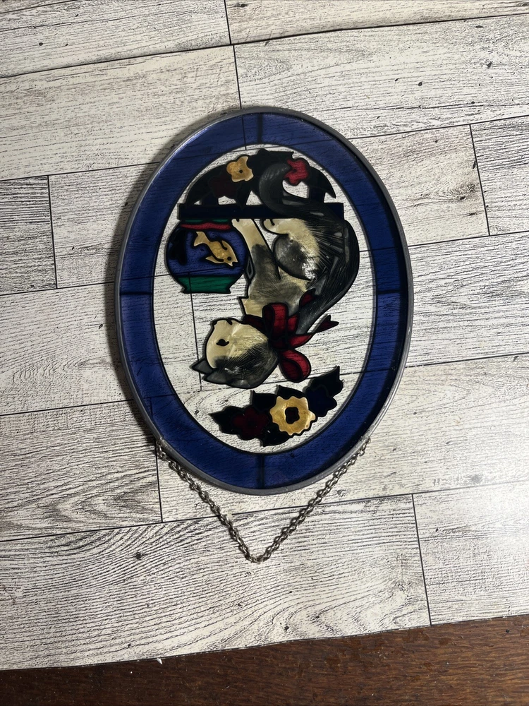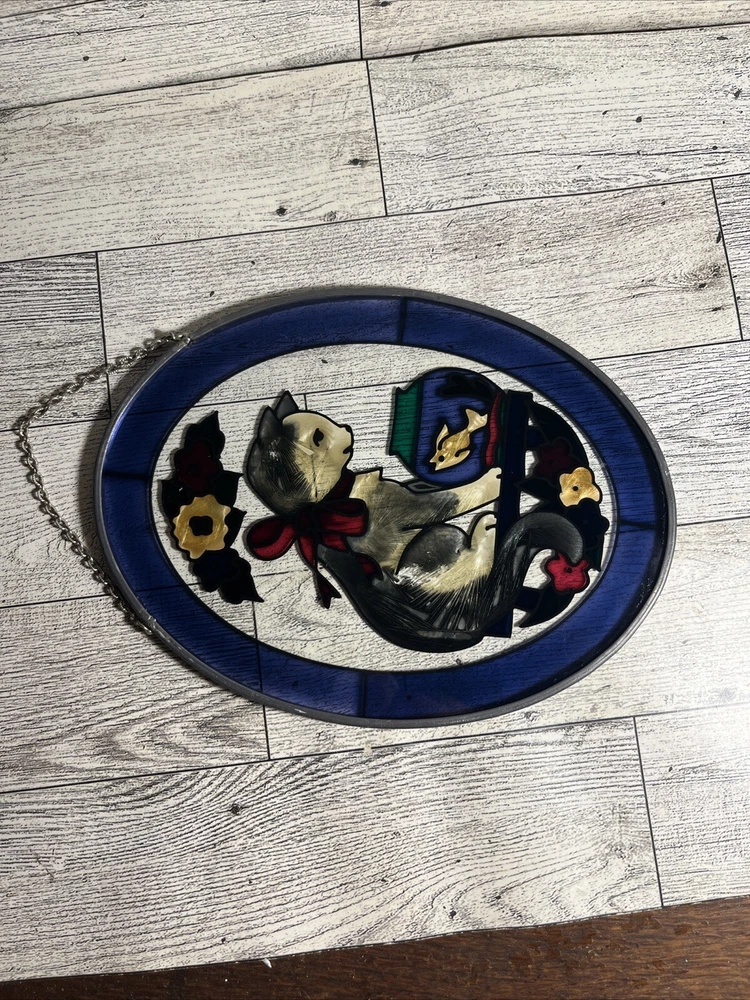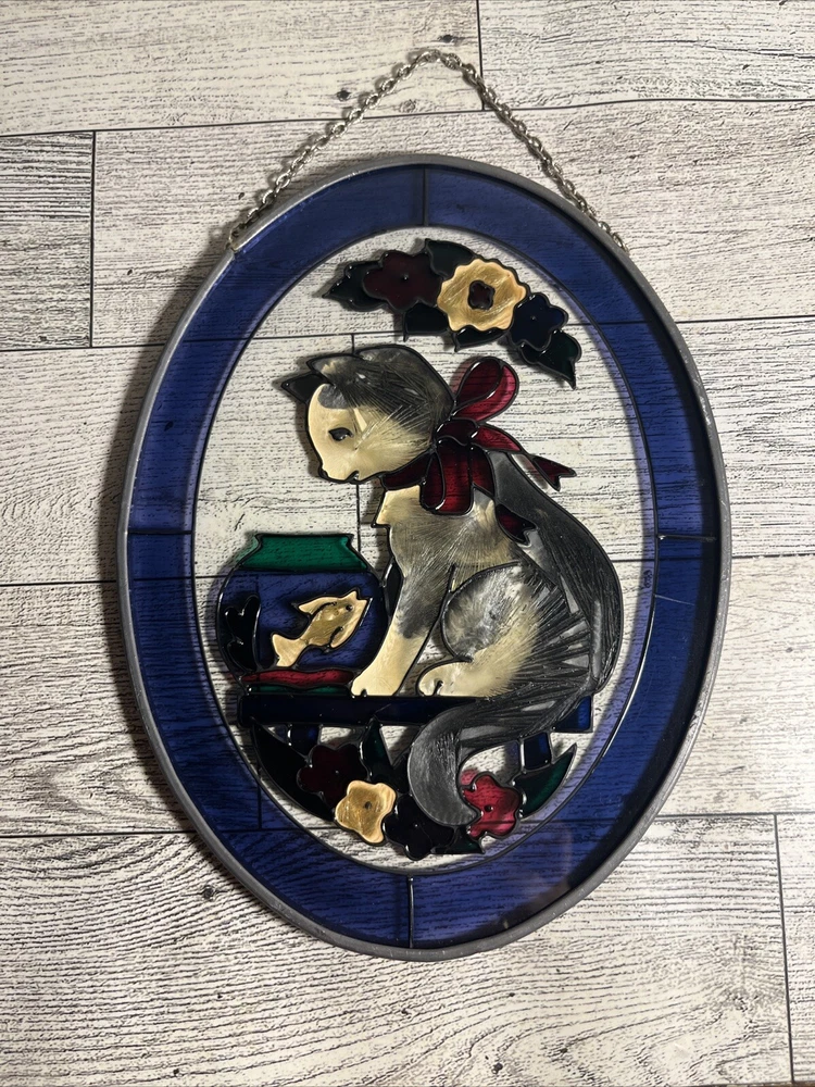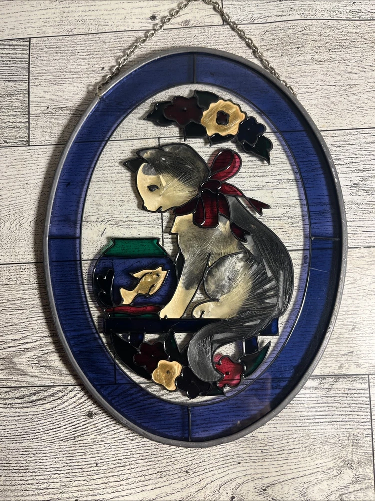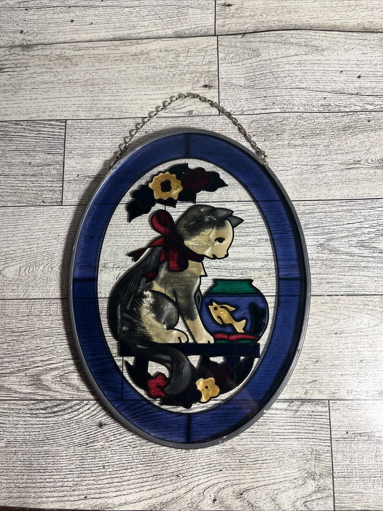 Very Good Condition! Beautiful & Vibrant Colors Add a touch of charm to any room with this beautiful oval-shaped stained glass window/wall decor. Featuring a cute cat and fish design, this piece is perfect for adults who love to add a touch of whimsy to their home decor. The multicolor glass and metal materials give it a unique and eye-catching finish that is sure to brighten up any space. Measuring approximately 8.5” in height, this window/wall decor is versatile enough to be hung in any room. The intricate cat and fish design is sure to delight anyone who sees it, making it a great addition to any home decor collection.