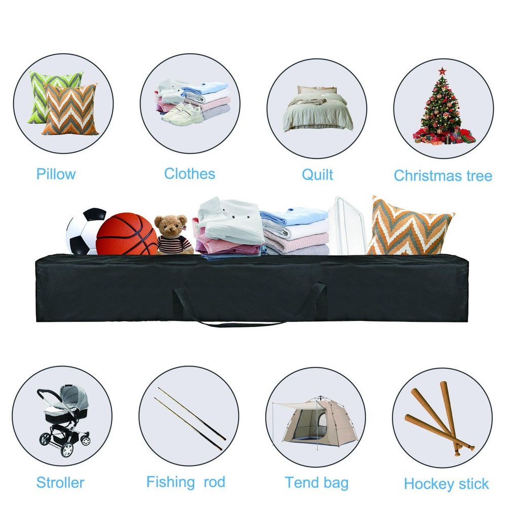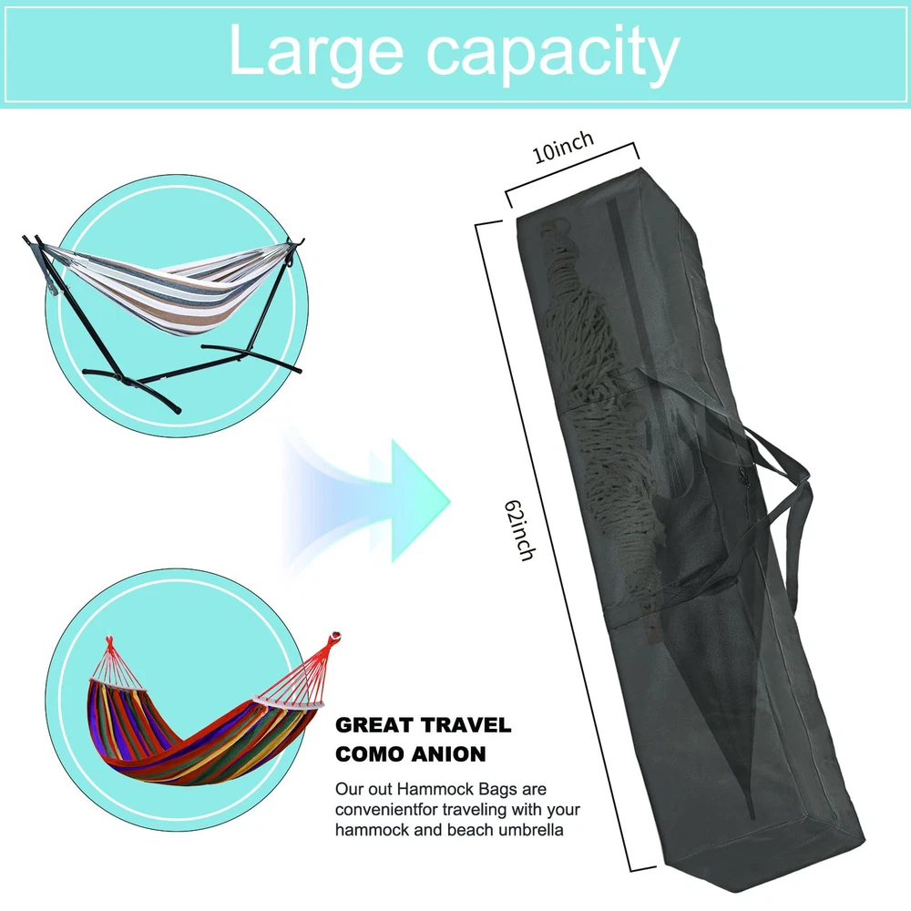 Product Name: Oversized Hammock Storage Bag Hammock Cover Material: Durable water-resistant coating fabric with water-repellent laminated backing Dimensions: 62"L x 10"W x 10"H Features: Extra Large Size:With a capacity to hold 2 hammocks and steel stands, this oversized storage bag is suitable for most outdoor hammocks and steel stands. Better Sealing:The durable water-resistant coating fabric and water-repellent laminated backing ensure that your hammock stays dry and ready for use. Easy to Clean: The carrying case for the hammock is easy to clean; simply rinse it with water and let it dry, or wipe the surface with a wet towel and air dry naturally. Multipurpose: This storage bag provides plenty of room for storing items, making it ideal for travel and use as a tent bag or umbrella storage bag. It is lightweight, convenient to fold, and does not occupy much space when not in use. Color: Black Strap: Included for easy carrying Package Includes: 1 x Oversized Hammock Storage Bag Hammock Cover 1 x Carrying Strap Caution: Avoid storing sharp objects inside the bag to prevent punctures. Do not expose the bag to extreme temperatures or direct sunlight for prolonged periods to maintain its durability and waterproof properties. Extra Large Size : 62"L x 10" Wx 10"H with extra-large capacity. Hammock storage bag can handle 2 Hammock and Steel Stand - fits for most outdoor Hammock and Steel Stand. Multiourpose : Plenty of room for storing items,good for travel and use as tent bag and Umbrella storage bag.Lightweigth and convenient to fold and when not needed and does not occupy space. Better Sealing : Hammock stand storage bag with durable water-resistant coating fabric and water-repellent laminated backing keeps your Hammock dry and ready to use. Easy to Clean : Carrying case for the Hammock with handler is very easy to clean, just rinse the dirty things with water and dry it,then it can be folded for the next use. (Or Wipe the surface with a wet towel and air dry naturally.) Worry-Free Shopping : We are confident in the durability of our Hammock cover camping.In the event of any damage within year,we offer a free .