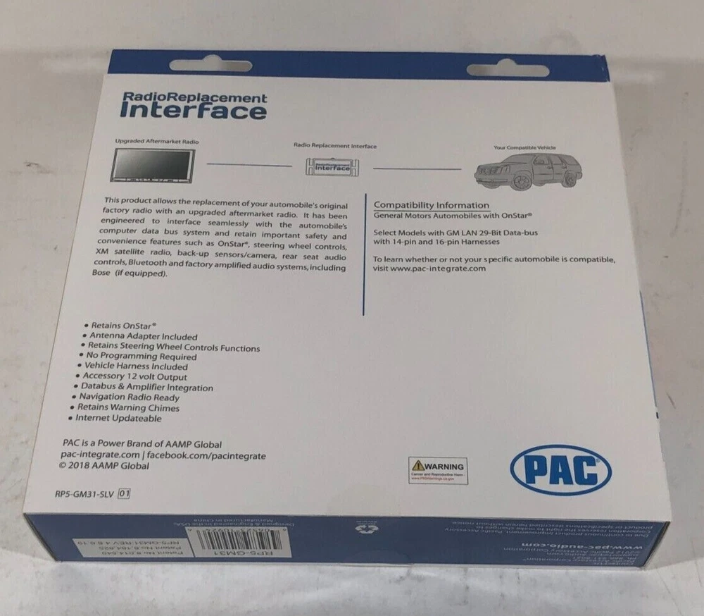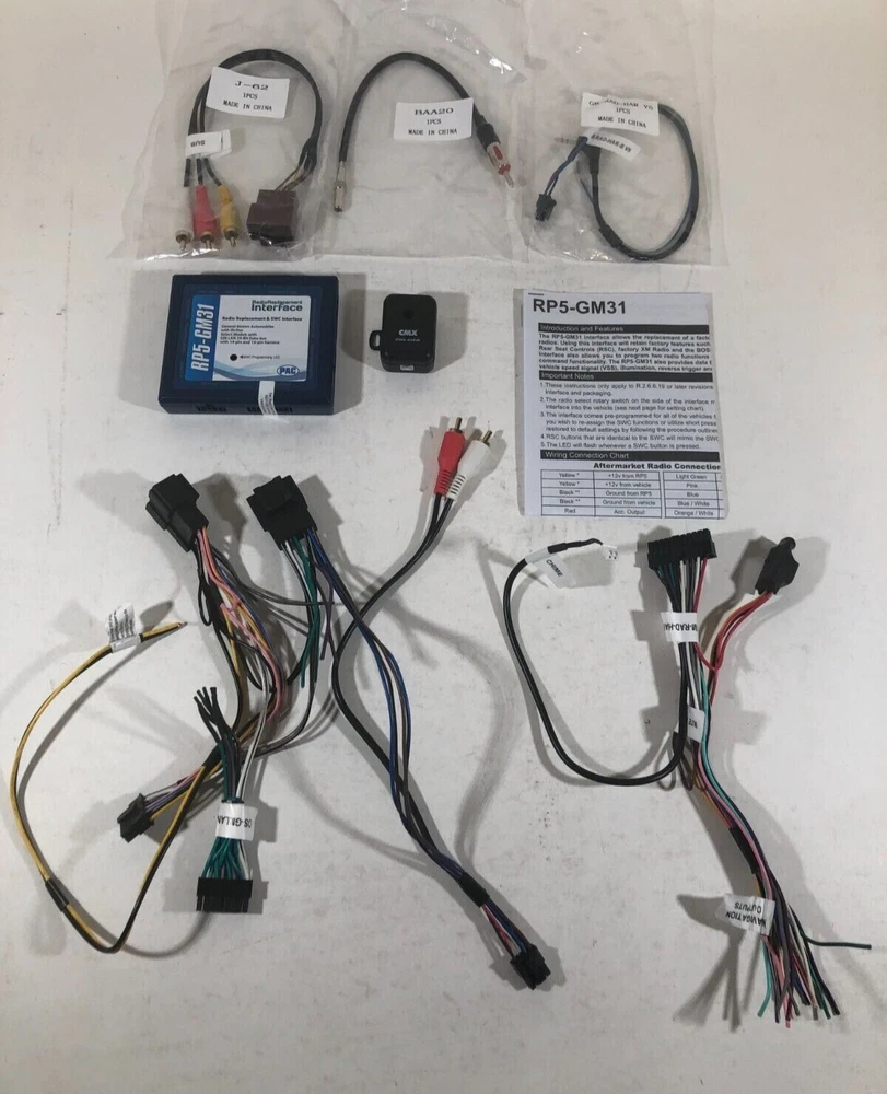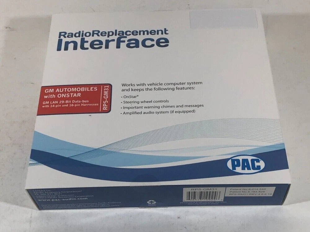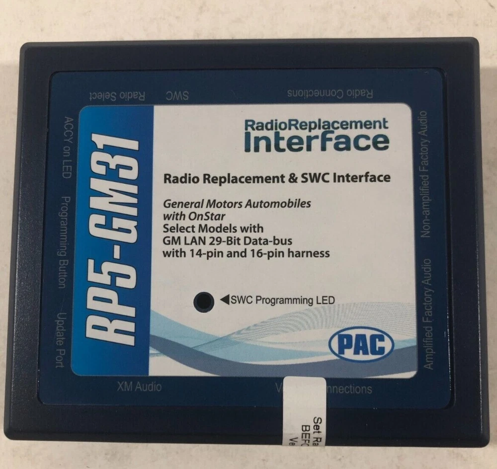 PAC RP5-GM31 Radio Replacement Interface GM Vehicles SWC OnStar FREE SHIPPING The PAC RP5_GM31 interface allows the replacement of a factory radio in select GM vehicles with 29-bit LAN radios. Check PAC fit guide for details/exclusions. When applicable the RP5-GM31 will retain the following: OnStar - factory installed only SWC - Steering Wheel Controls (if equipped) Warning Chimes Backup Camera (if equipped) Factory Bluetooth (if equipped 2009-up) RSC - Rear Seat Controls (if equipped) LCD Display Screen and Factory Amp (if equipped) If installing aftermarket Navigation gives connections for Vehicle Speed Sensor, Parking Brake and Reverse Works with Aftermarket radios from Pioneer, Kenwood, Alpine, JVC, Clarion, Sony, Fusion and many more ***These are New Kits in original box. Originally we added a specific radio harness to this, it has been removed and back to universal radio fitment - any questions please message us***