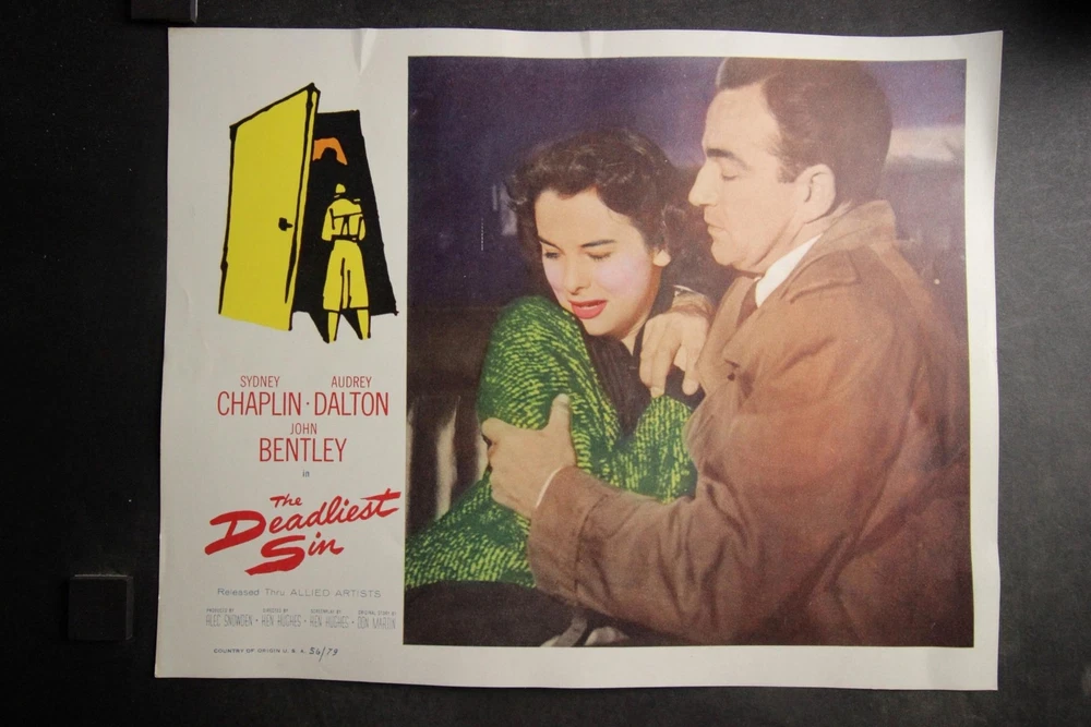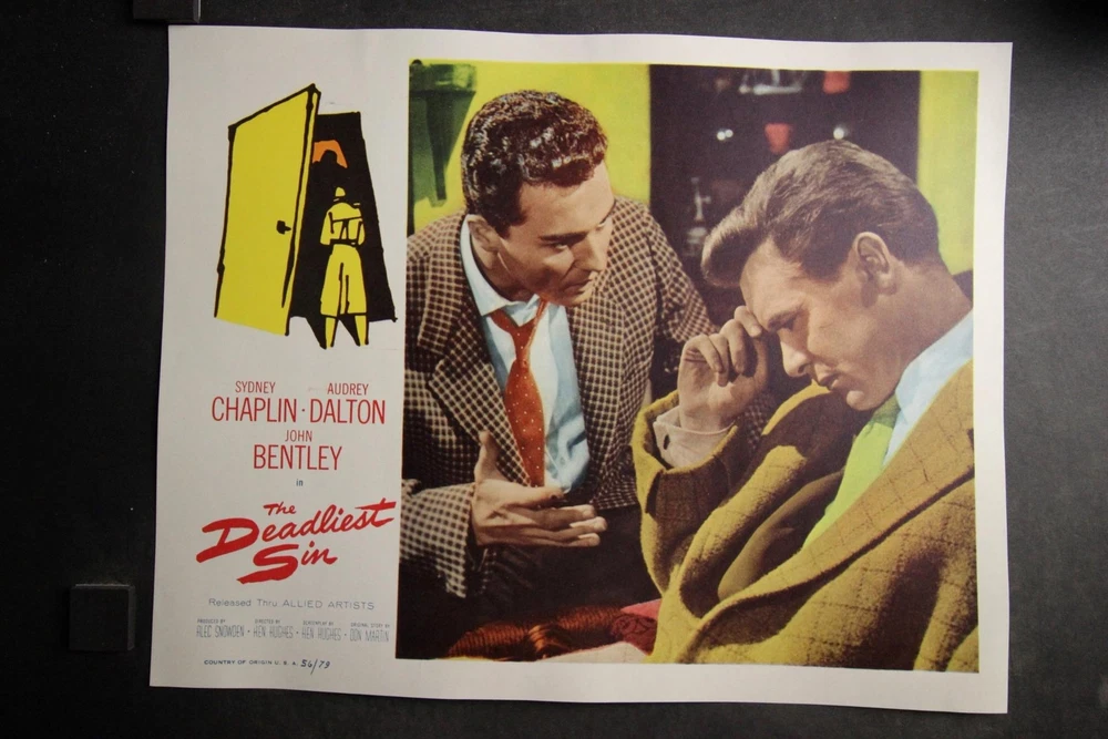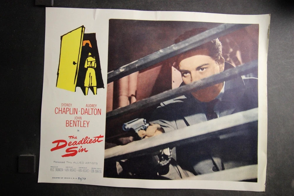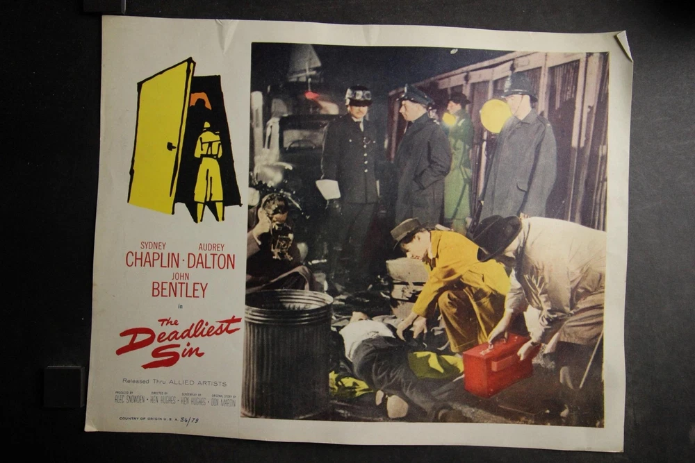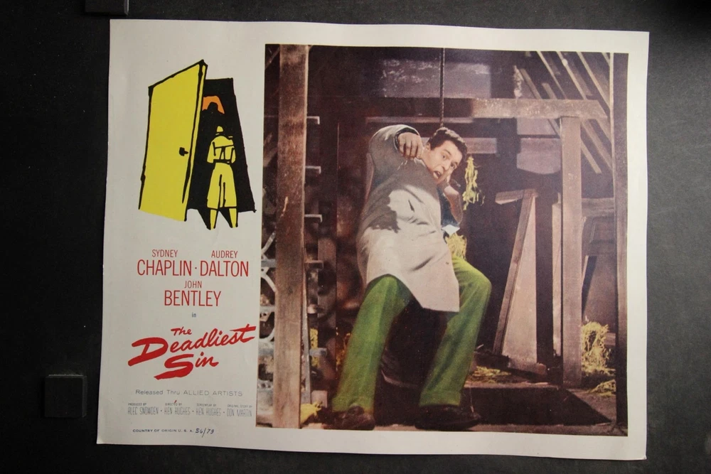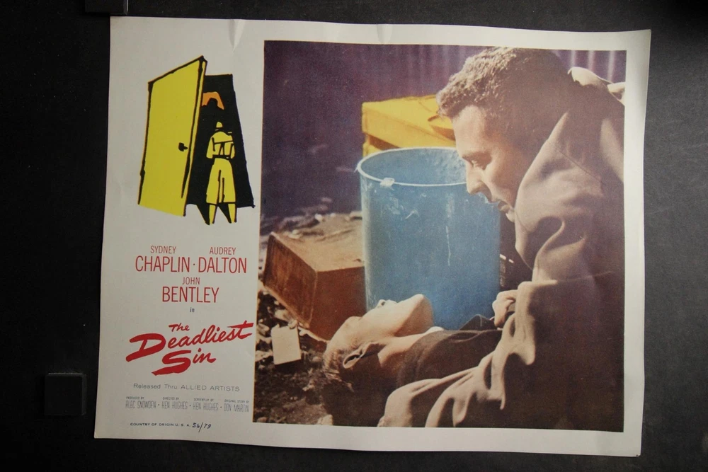 PLEASE LOOK BELOW DESCRIPTION FOR LARGE PHOTOS OF ITEM. ITEM : patrial set of seven original 1956 "The Deadliest Sin" movie lobby cards starring Sydney Chaplin and Audrey Dalton. CONDITION : Very Good condition cards with moderate corner/edge wear. Heavy bottom margin corners creasing to first card. Hint of bottom left area crease to last card MEASUREMENTS : 11 x 14 inches. COMBINDED SHIPPING : I will Gladly combine shipping of items for up to 28 days. NO free shipping on lobby cards but I will keep the combined shipping cost as low as possible. Item History: The National Screen Service controled most of the movie advertising industry from the 1940s to the 1980s. They had regional warehouses to distribute material and accept returns of this material. The NSS officially closed in 2007. This auction offering comes from one of those regional warehouses. I purchase a large amount of inventory from a Chicagoland 40 yr movie memorabilia dealer. This dealer obtained this material at the closing of the NSS. Stay tuned for great offerings of 8 x 10 photos, lobby cards and posters directly from the NSS warehouse. Many items never distributed. HAPPY BIDDING & THANKS FOR LOOKING !!!! Please check out my other auctions ALL ITEMS are ORIGINAL, NO reproductions SHIPPING INFORMATION: * I will combine shipping. I don't mind waiting up to 28 days to help in combining items. I will forward an updated invoice with any additional wins with combined shipping. Just forward payment when finished bidding. * Winning bidder will pre-pay winning bid plus any postage/handling. * International bidders: First Class International available on most items under 4 lbs. Priority Mail International available on all items. Images sell! Get Supersized Images & Free Image Hosting Attention Sellers - Get Templates Image Hosting, Scheduling at Auctiva.com. Track Page Views With Auctiva's Counter